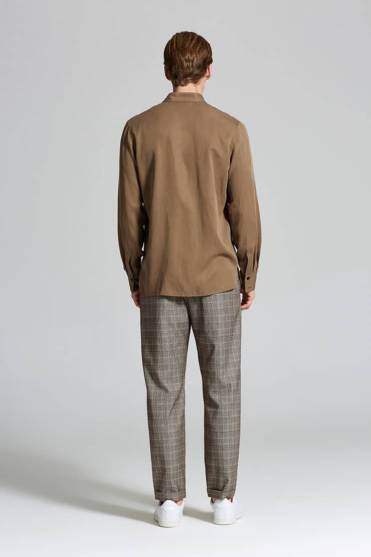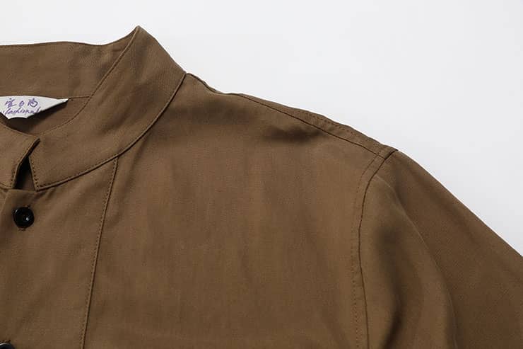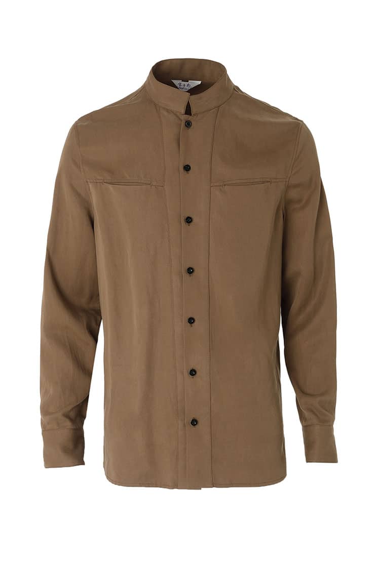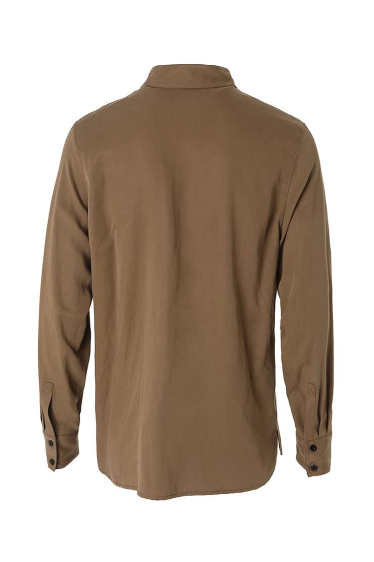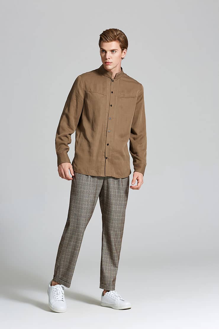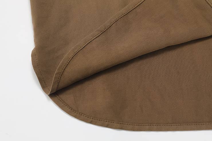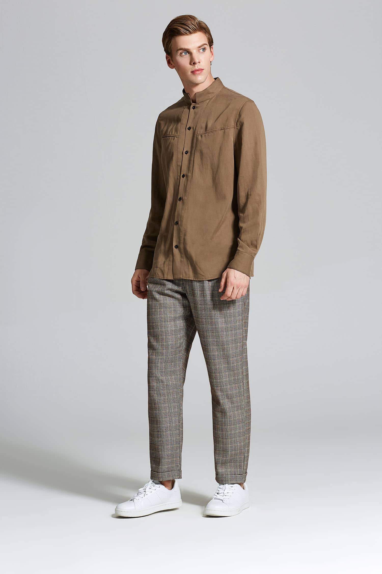 棉麻混纺长袖衬衣,前胸对称破缝内藏口袋,宽松版型设计,弧形下摆,两侧开衩,线条处理恰到好处,呼应轻松随性基调。