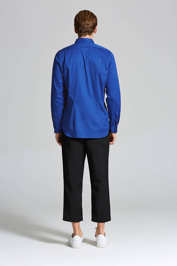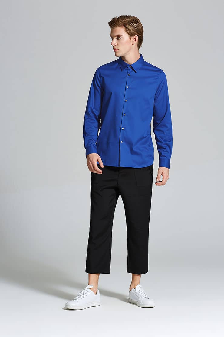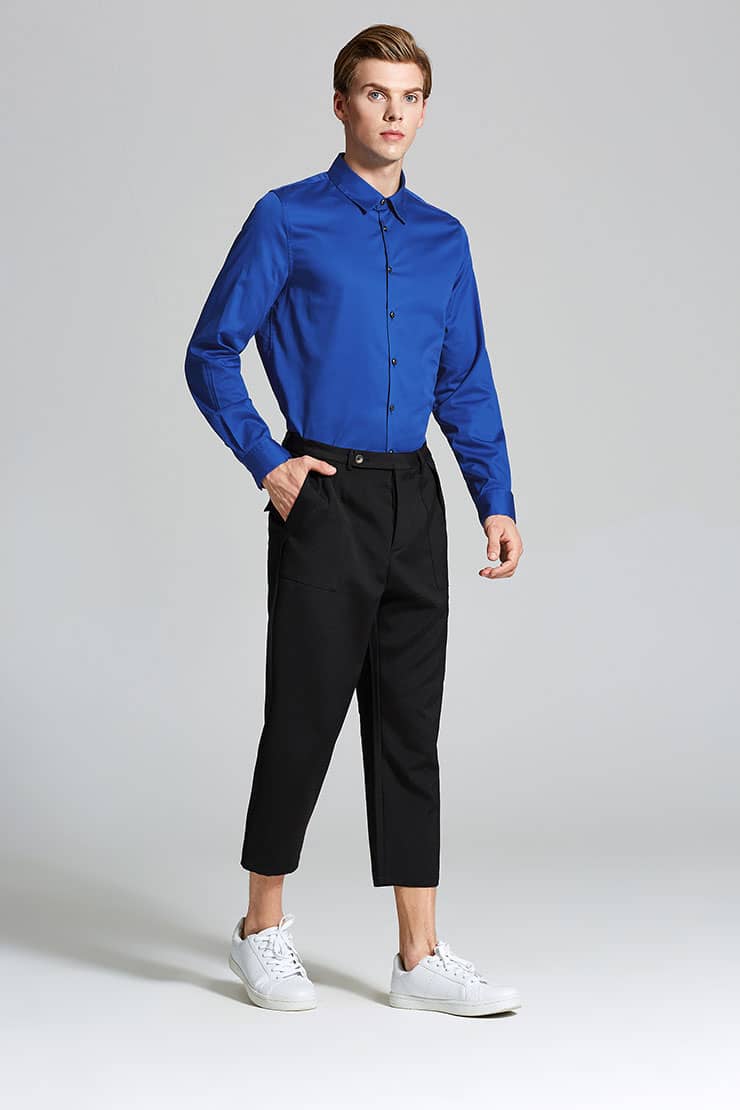 人棉混纺面料,腰部服帖,双门襟钉纽扣,前中腰头伸出,纽扣钩扣双固定,前片两侧面贴斜插袋,袋口外翻,合体的八分裤型,脚口缩小,潮味十足。