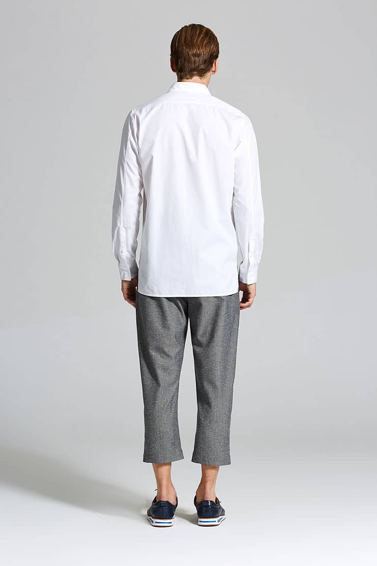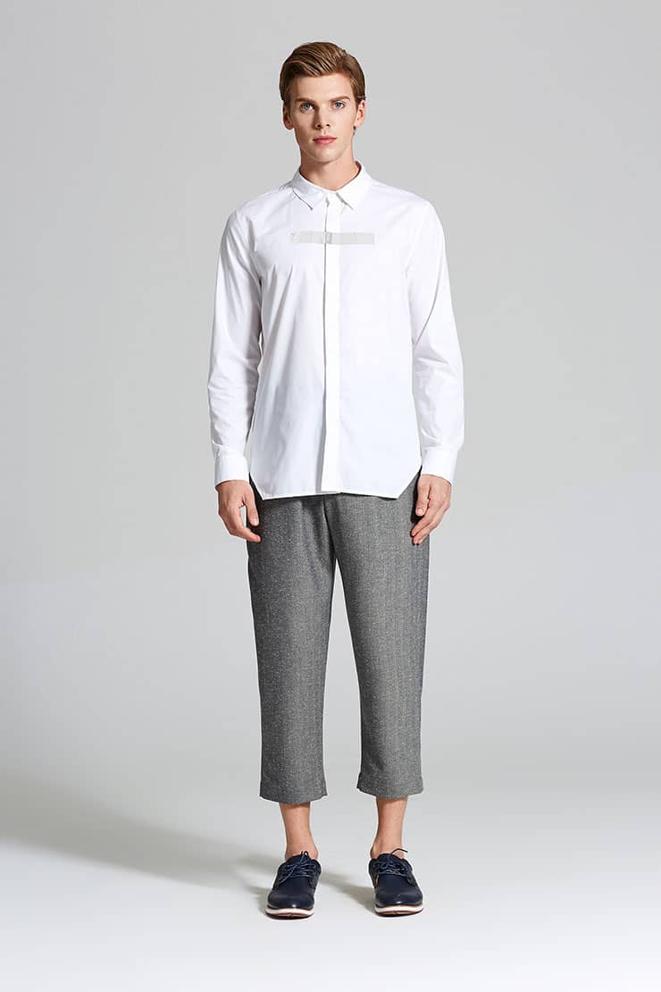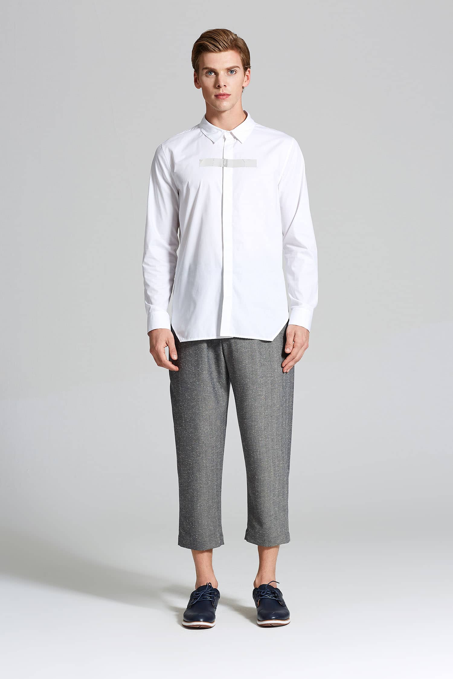 人字纹提花面料,宽边橡筋腰,两侧对称插缝袋,后幅个性口袋设计,宽松宽脚口的萝卜裤型,落裆,八分裤长,干净利落,简约又不失考究。