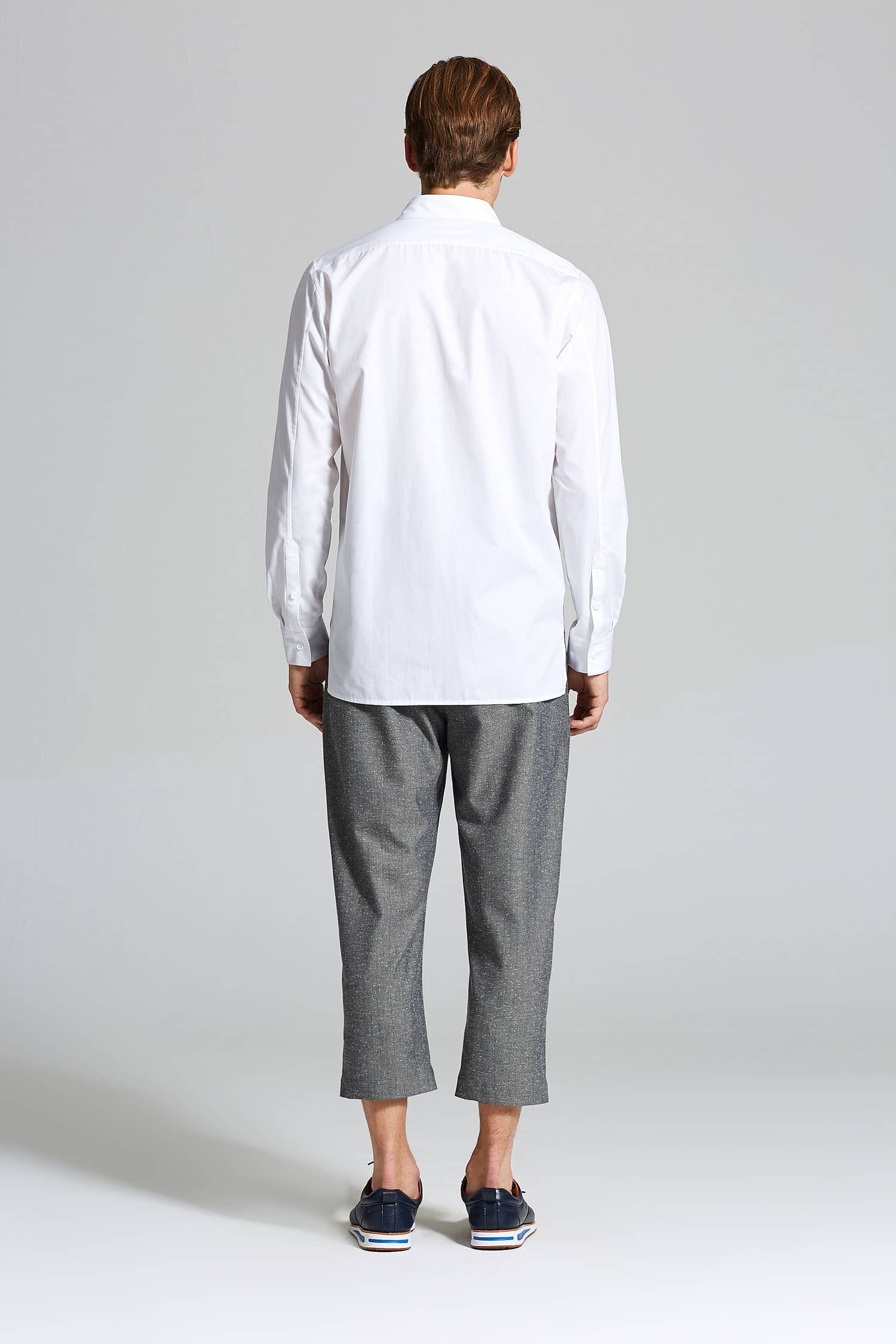 格纹图案的混纺直筒九分裤,腰头服帖,门襟拉链,两侧设有对称斜插袋,后幅一字口袋,单侧扣袢钉扣,直筒微收脚口西裤结构,单褶裥,烫挺缝线,挺括有型。