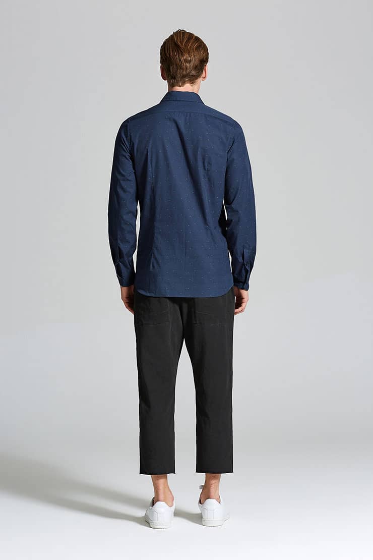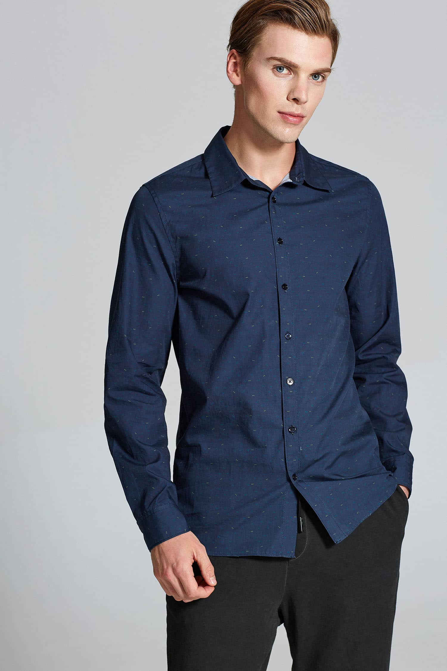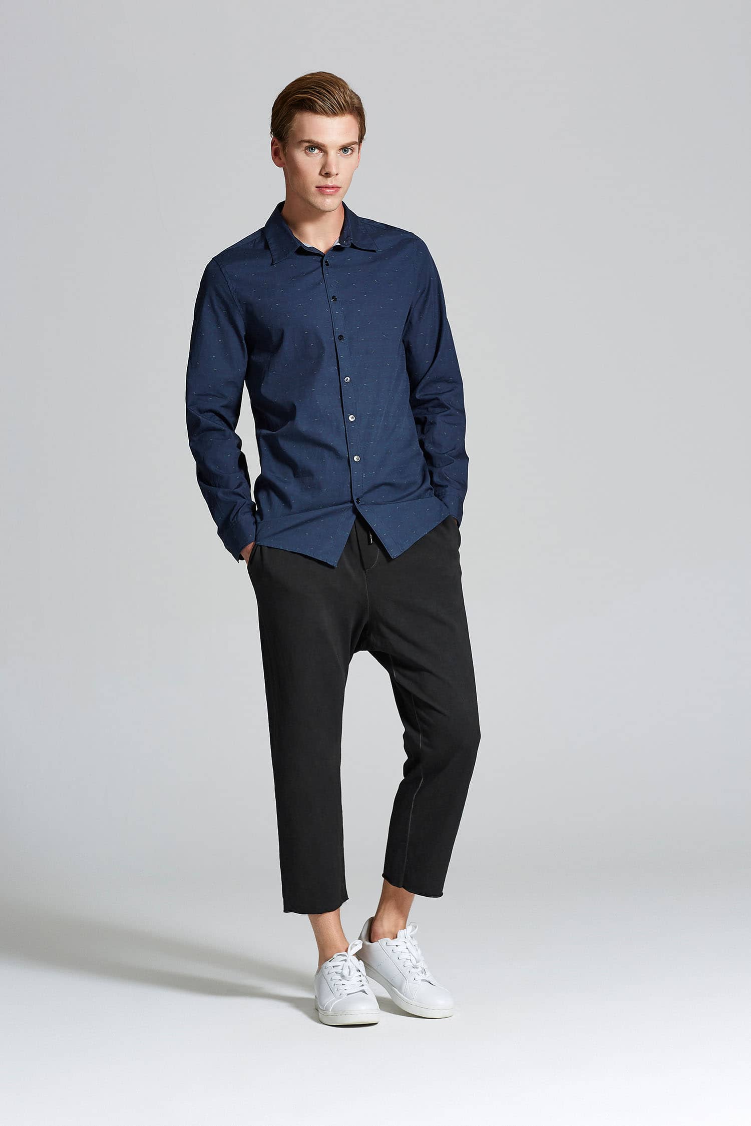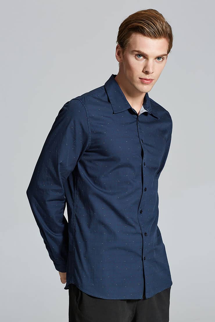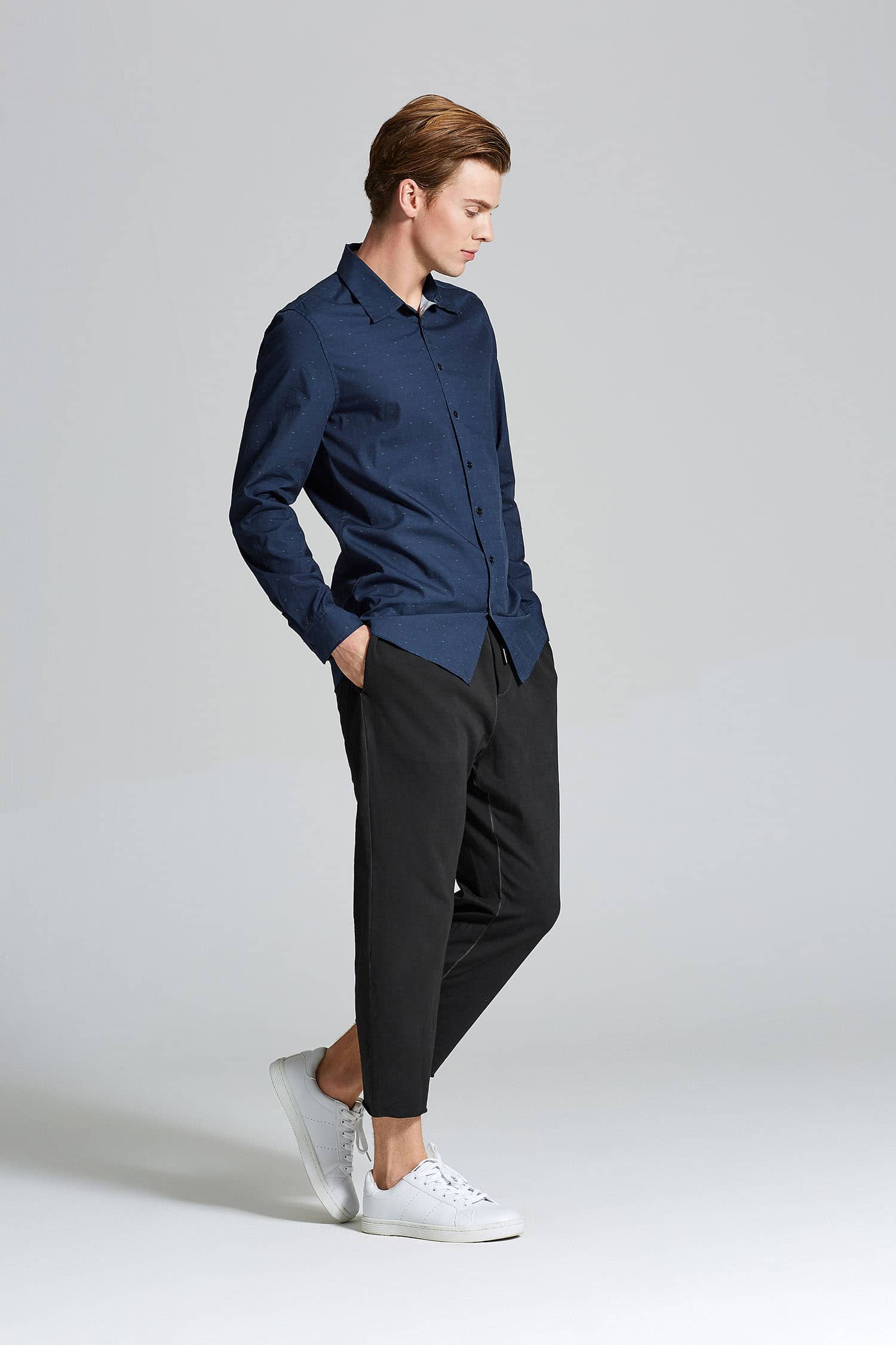 纯棉印花长袖衬衣,方角企领,经典门襟,后腰、侧缝收腰,经典的合体版型,圆弧下摆,很好的修饰身材,突显男士魅力。
