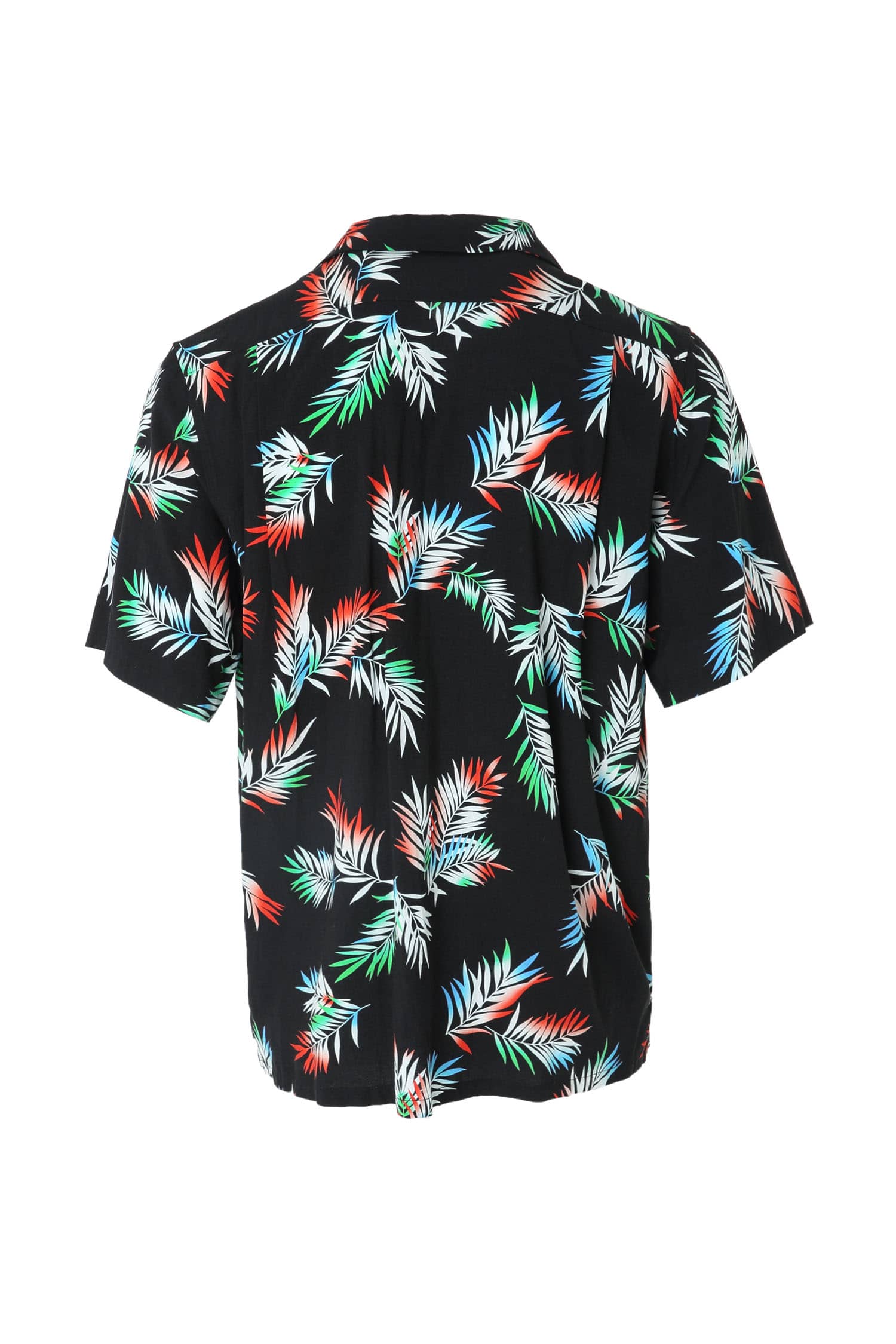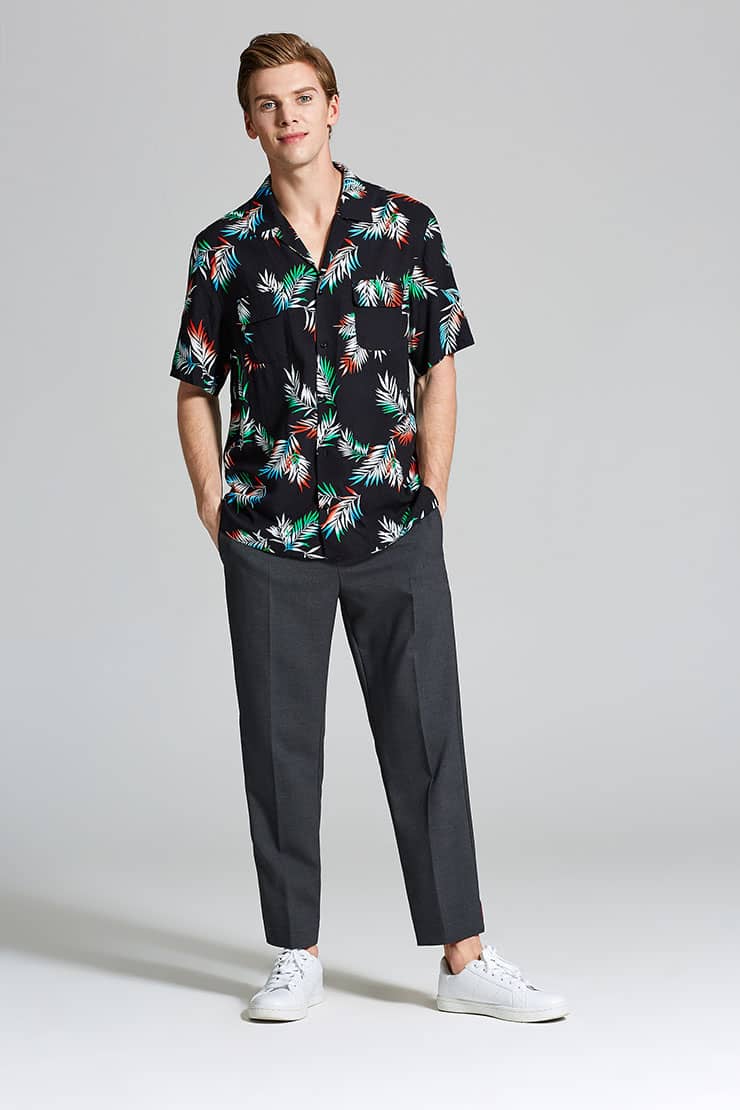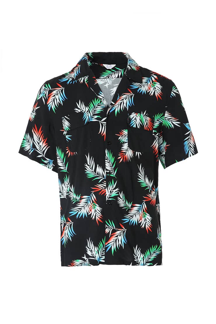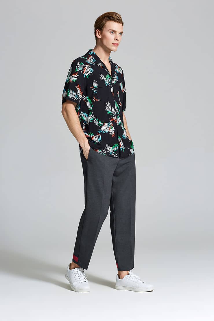 人棉印花短袖衬衣,翻领,胸前对称圆角贴袋配翻盖,门襟钉纽扣,直筒宽松式落肩短袖剪裁,平直下摆,舒适自如。