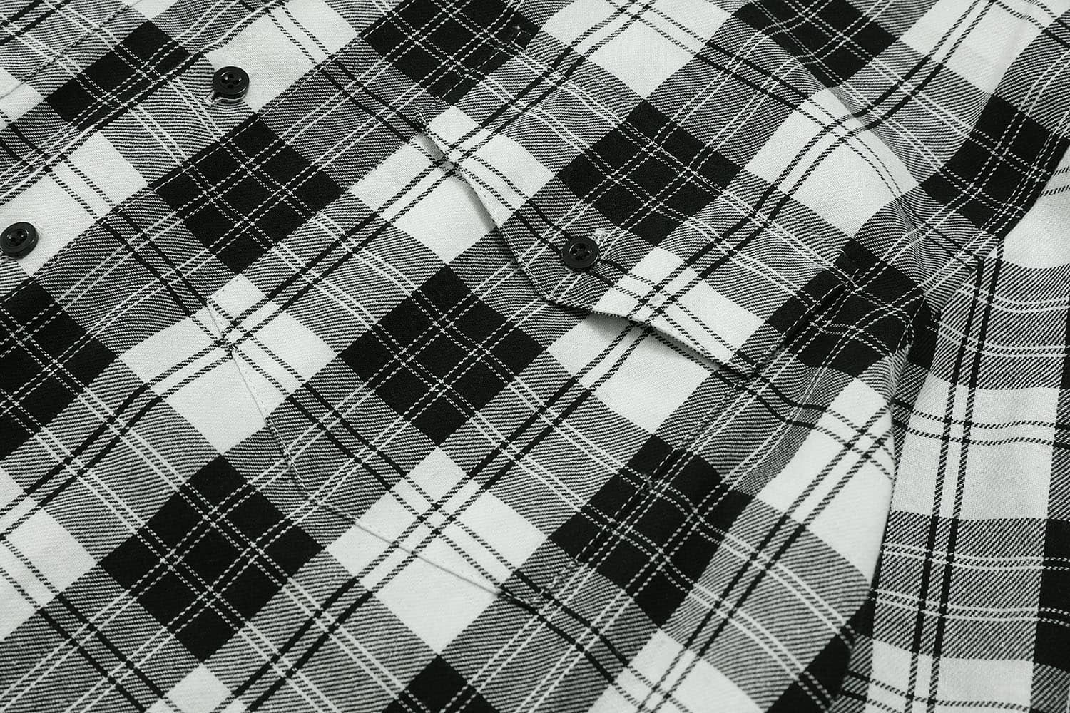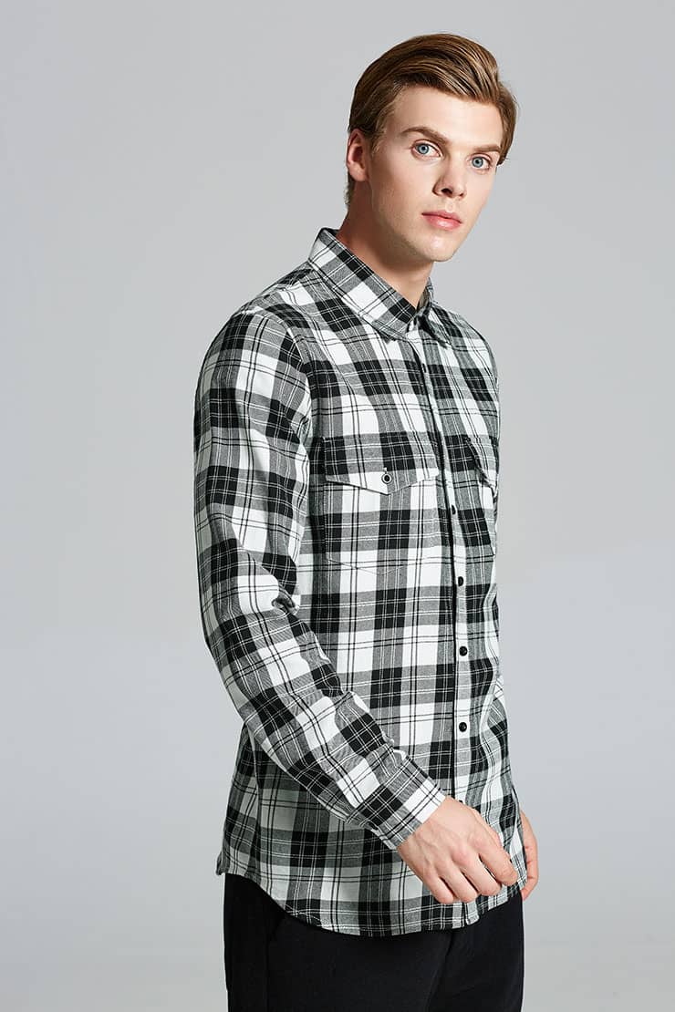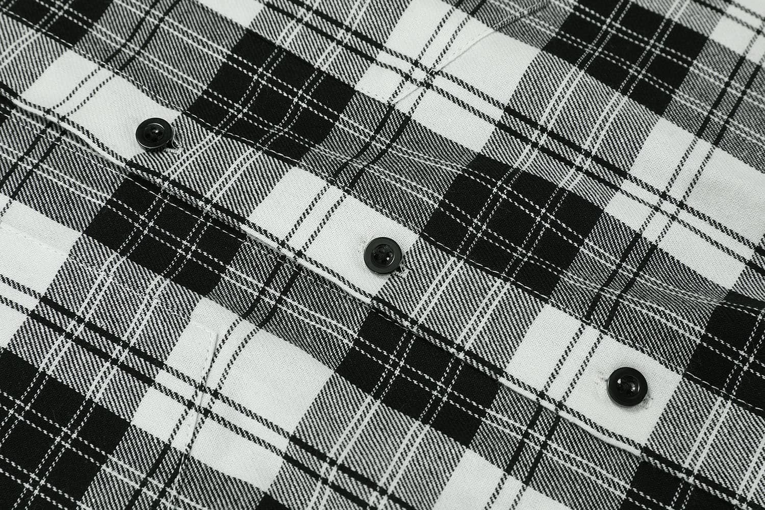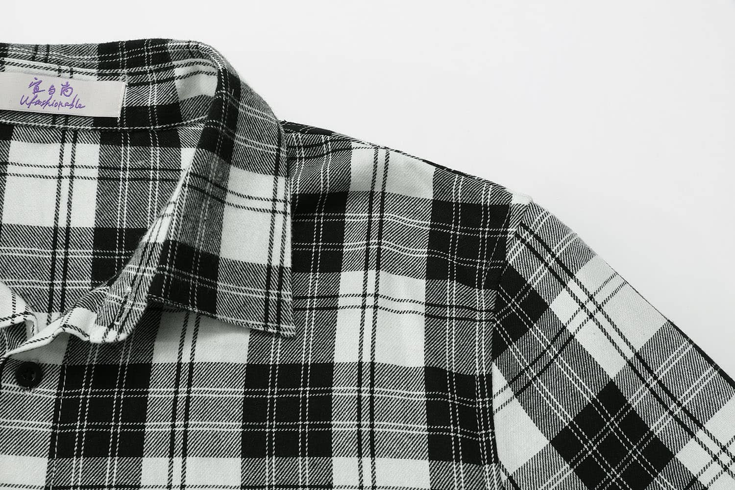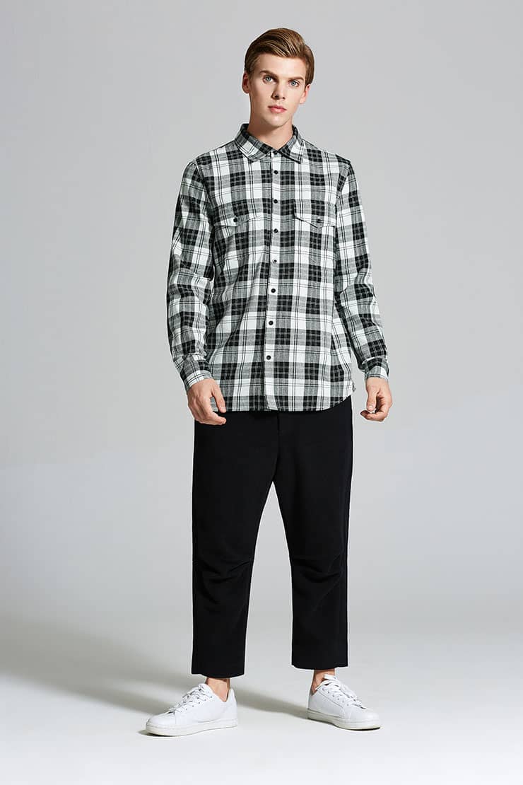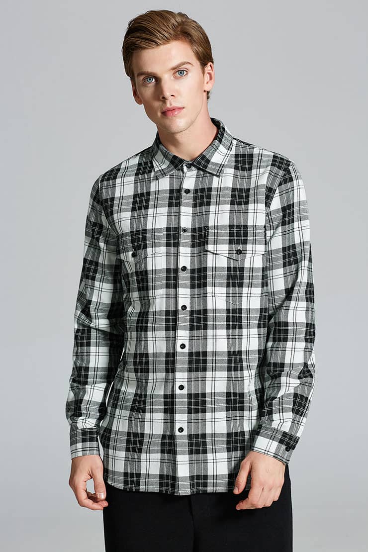 全棉长袖衬衣,尖角企领,胸前对称贴袋配翻盖,拼格与衫身融为一体,圆弧下摆,舒适休闲的版型,彰显气质,活动自由。