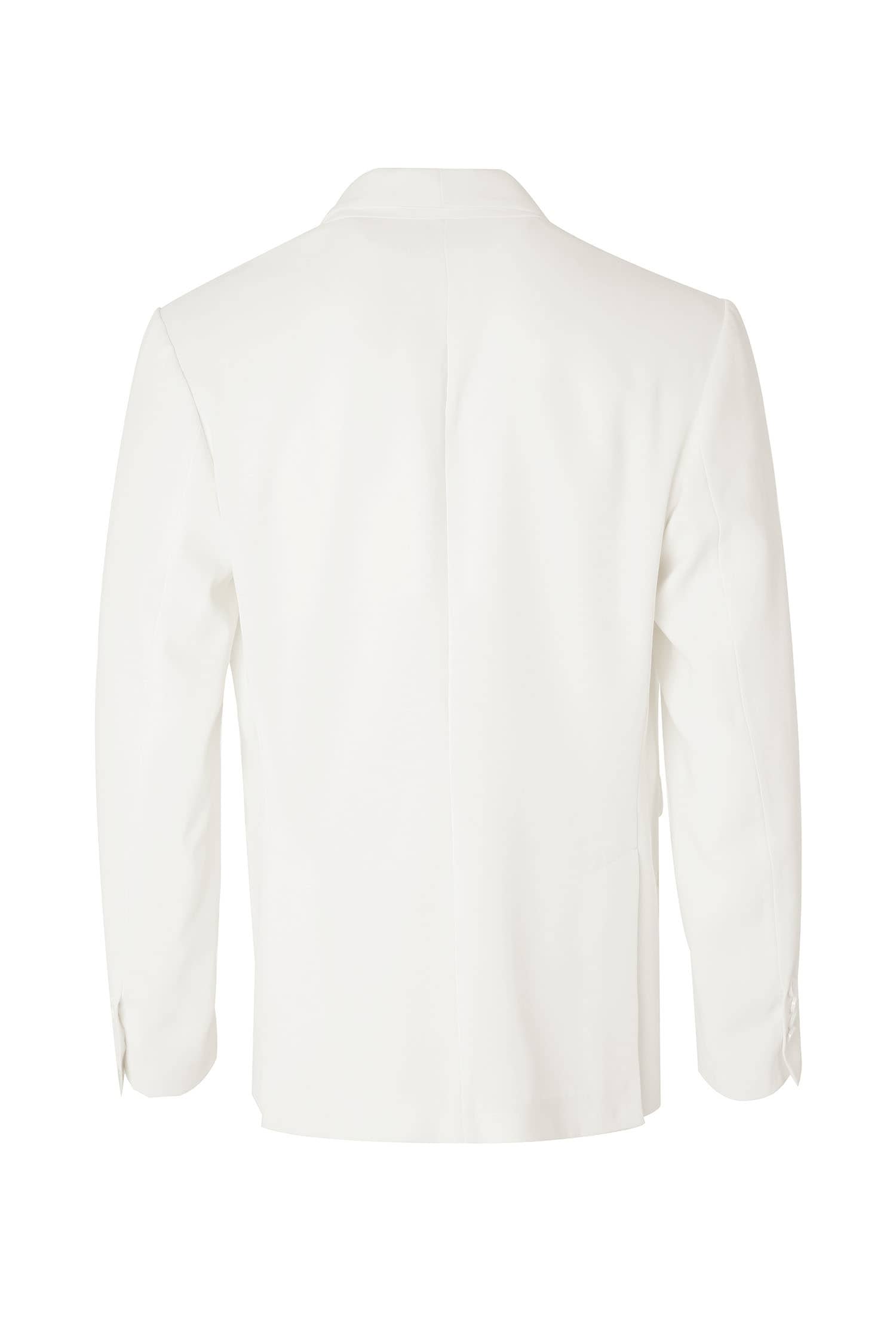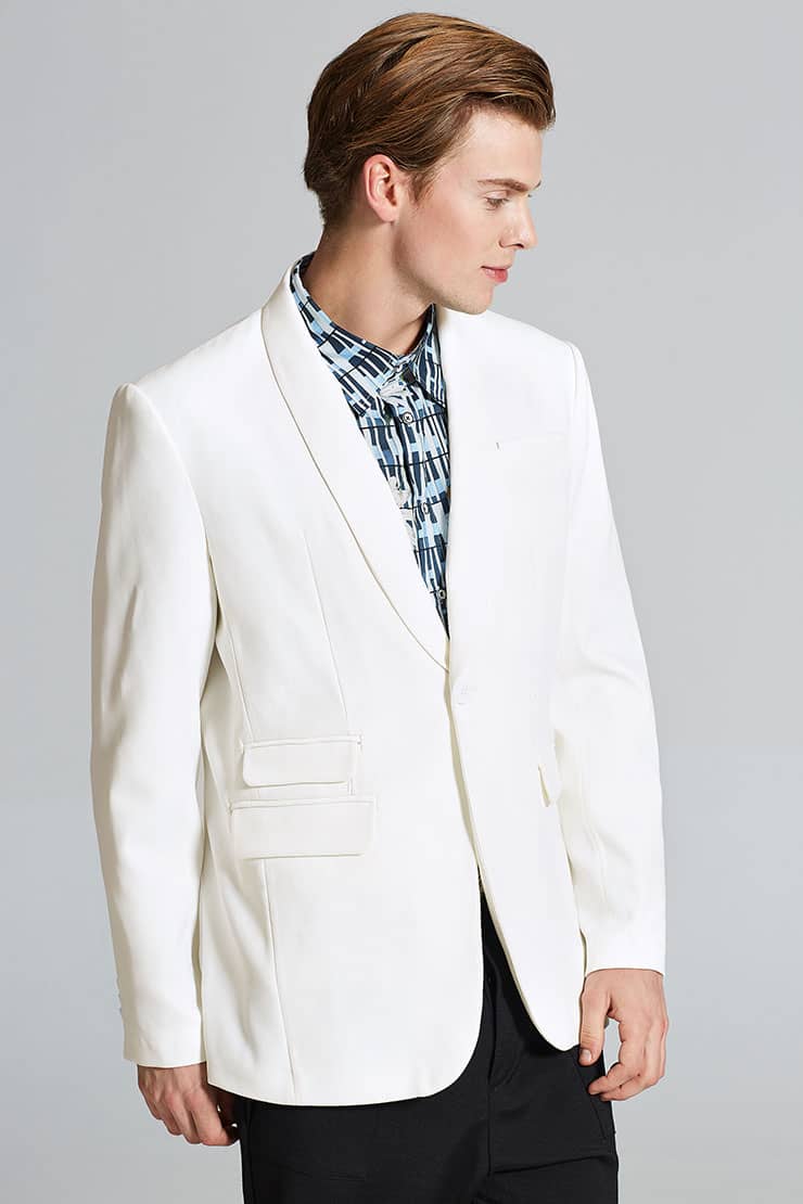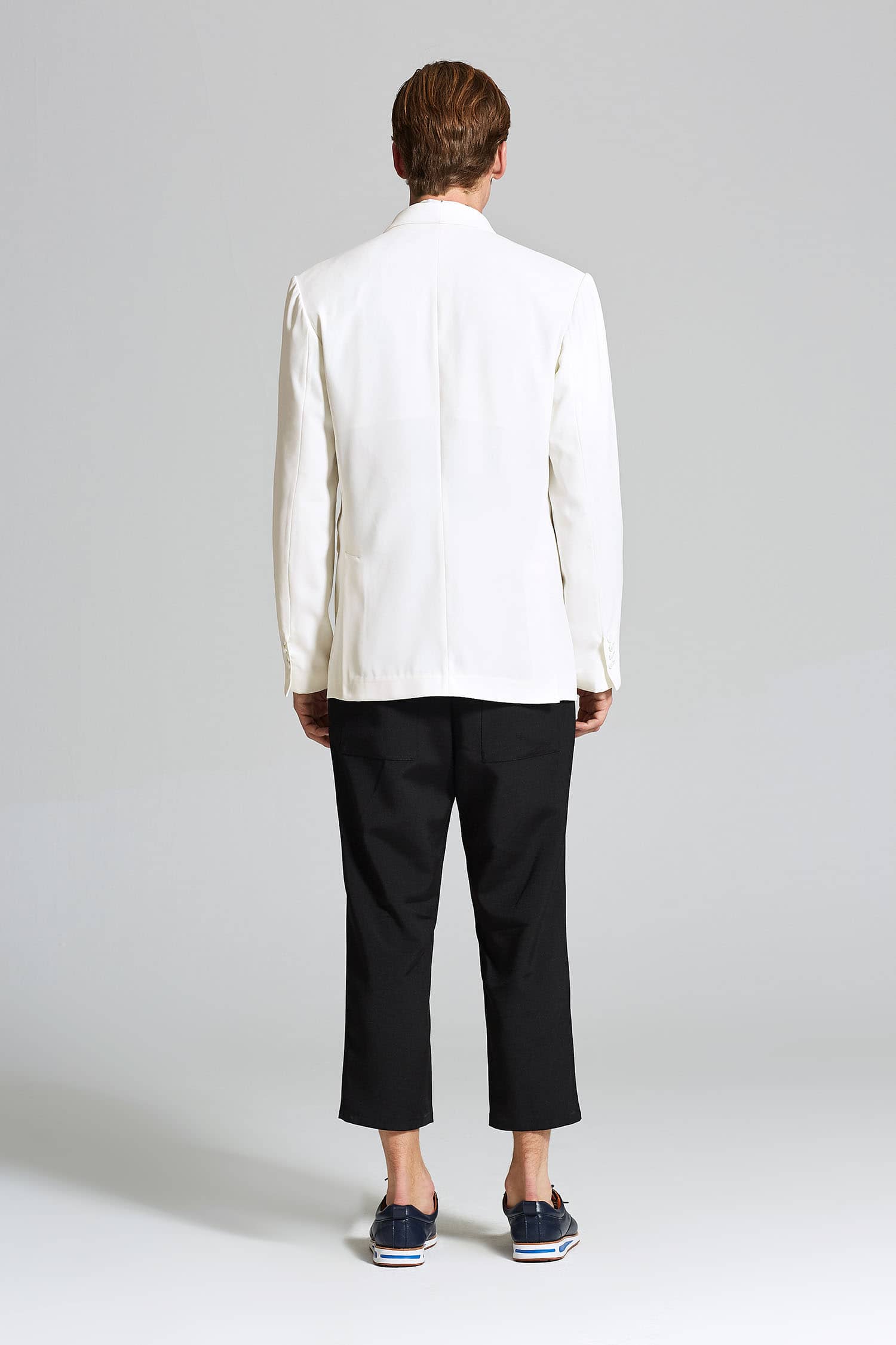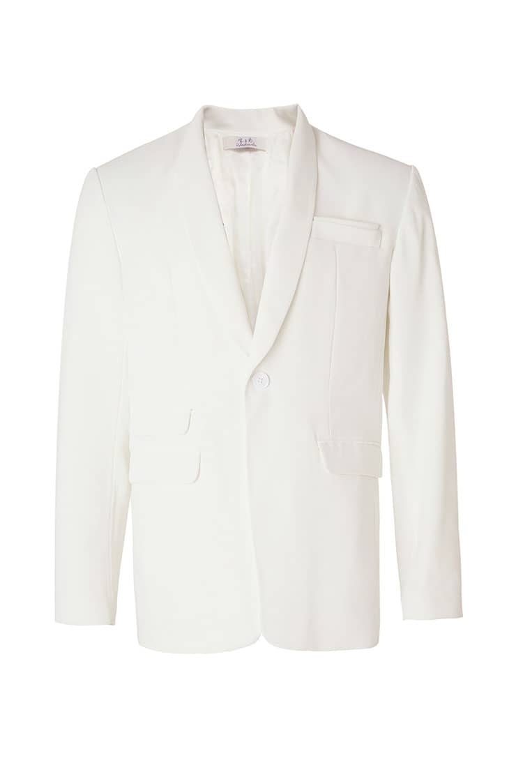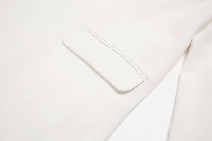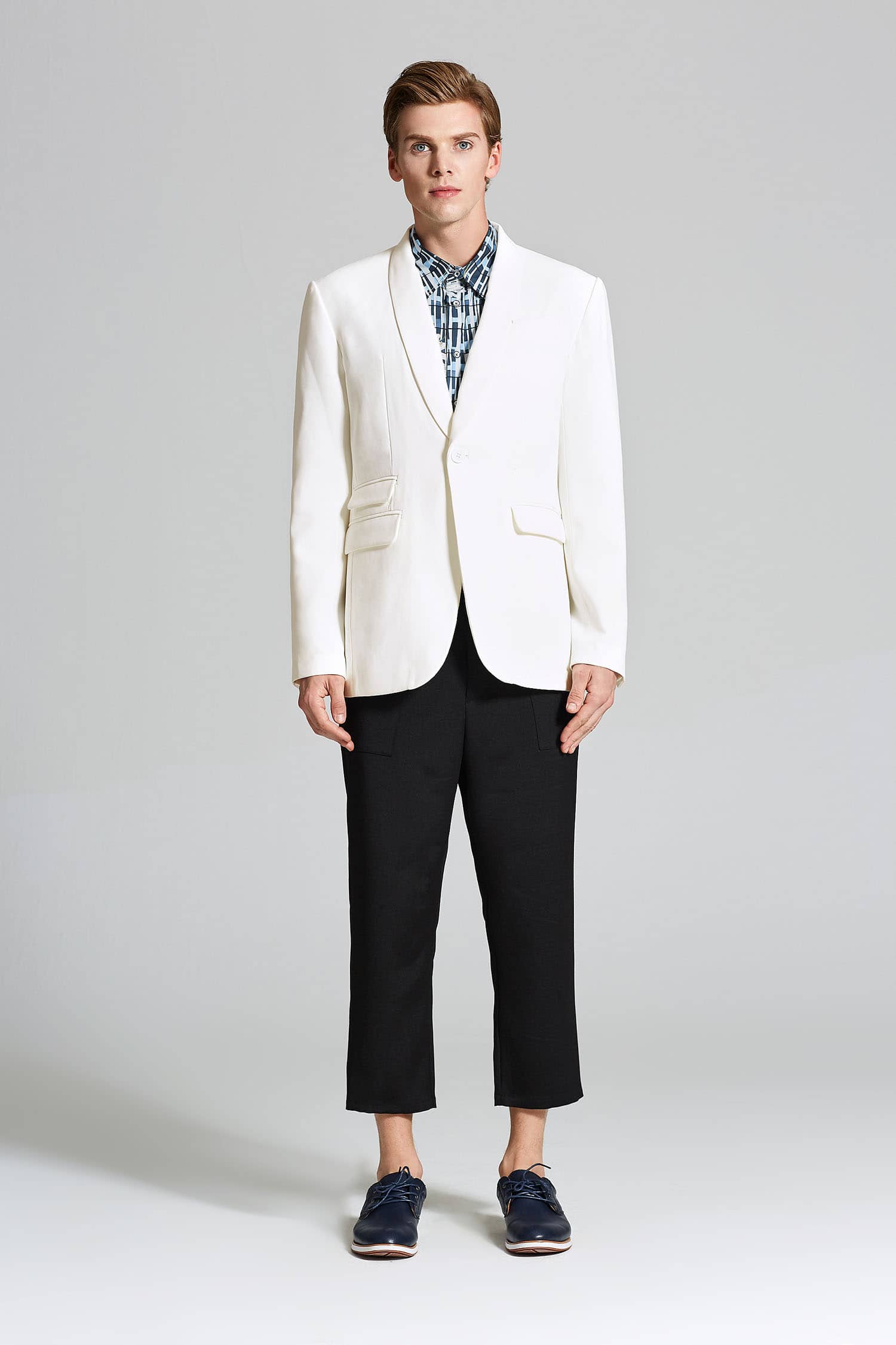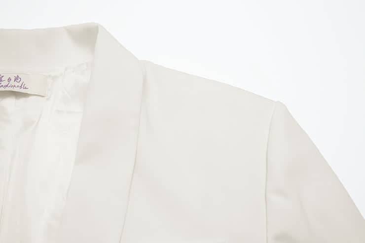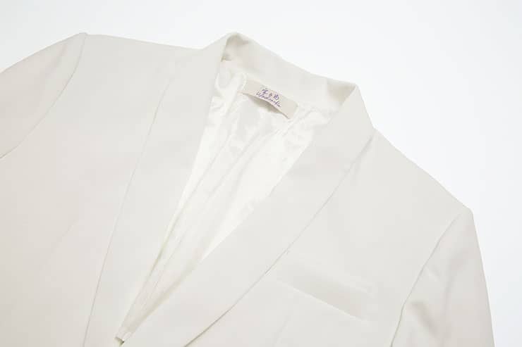 采用优质聚酯纤维,质地爽滑平实,挺括有型;青果领设计,门襟单纽扣,左胸重叠手巾袋,下边多个袋盖的一字袋,修身的版型,后下摆开叉设计,优雅有型。