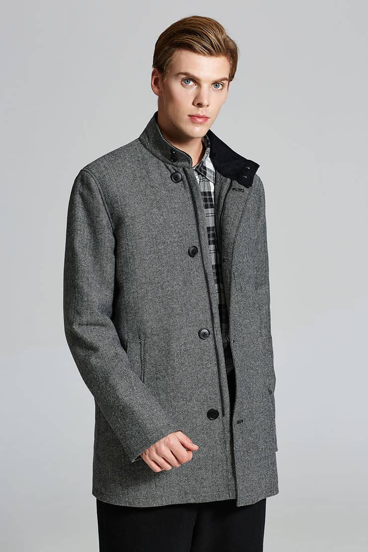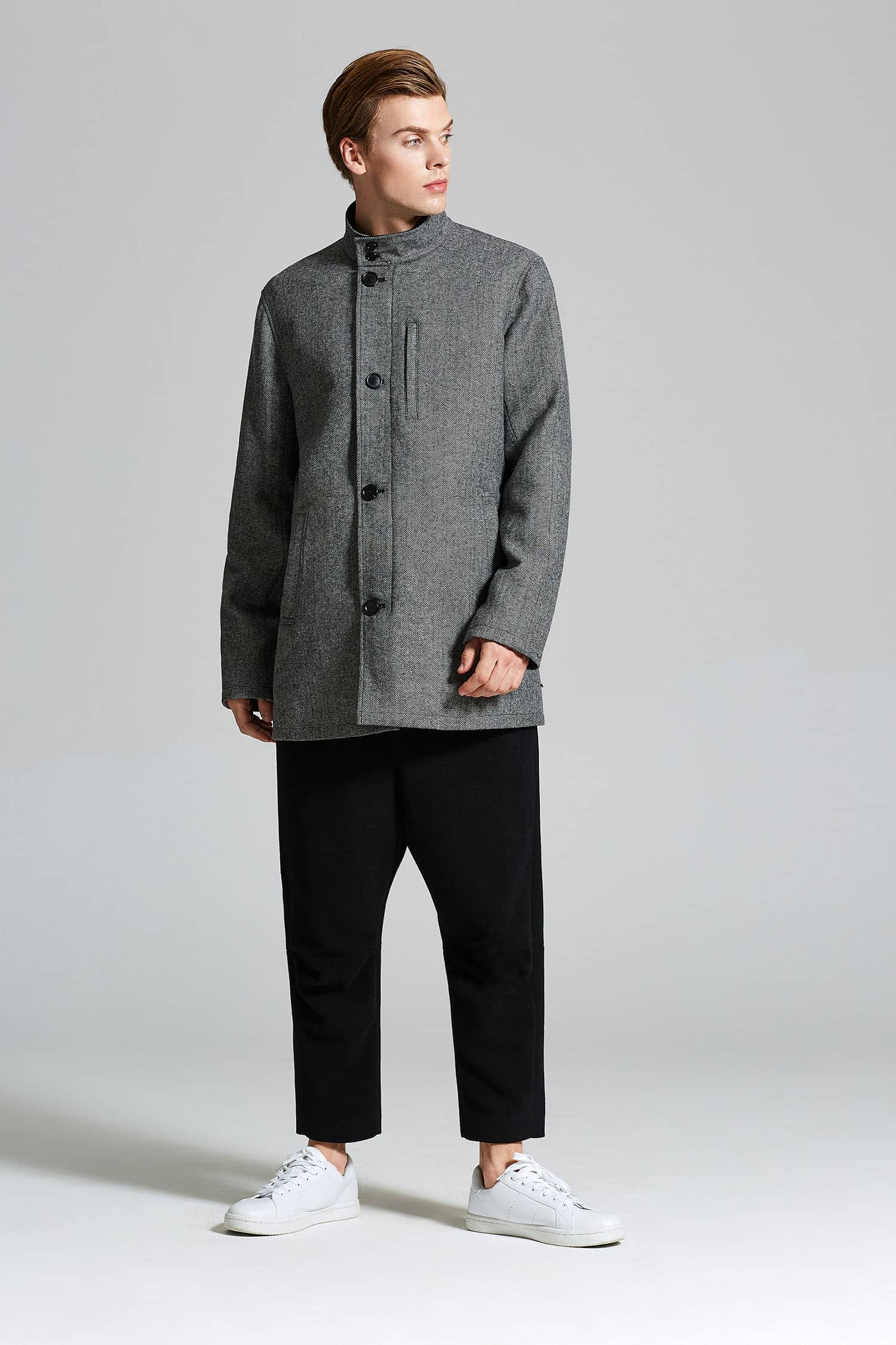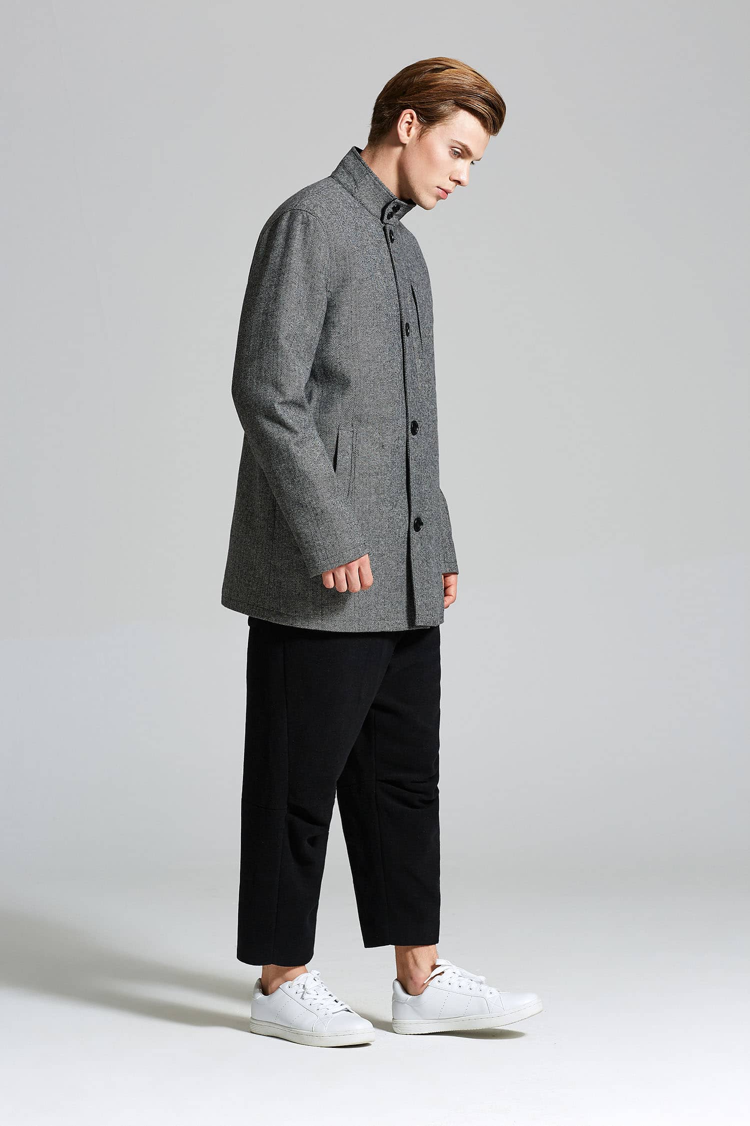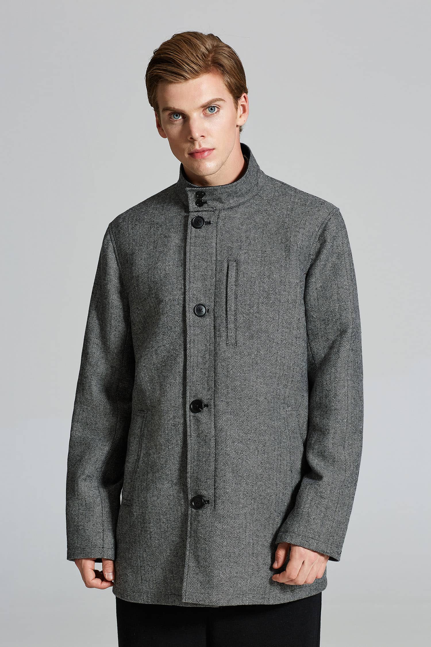 羊毛混纺面料,厚实、保暖,立领,门襟拉链加纽扣,前胸单唇袋藏拉链袋口,下边两侧斜插单唇袋,合体版型剪裁,后腰部合理分割,打造成熟稳重的男人魅力。