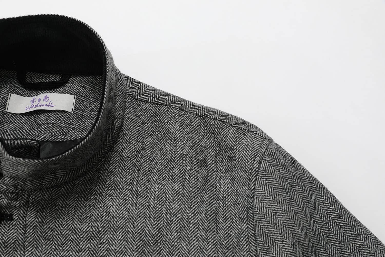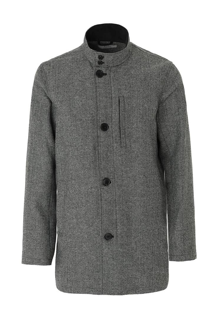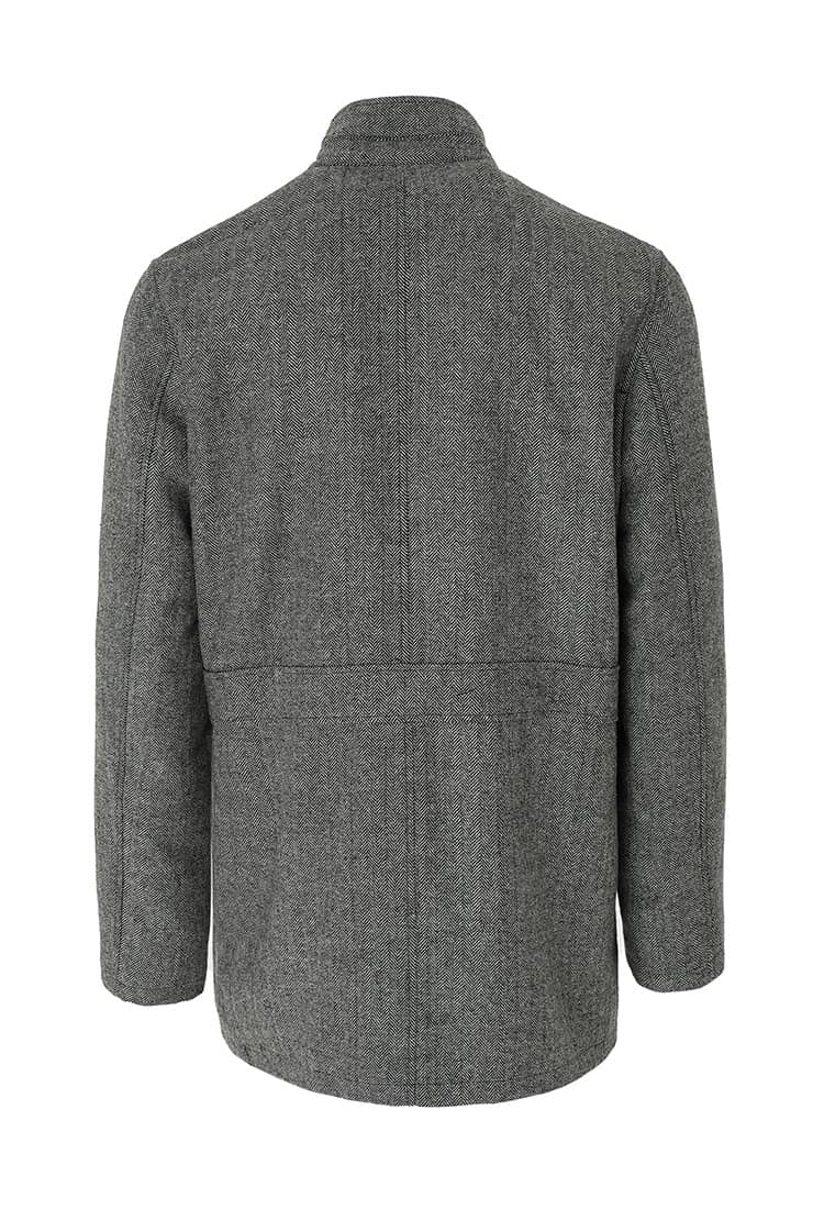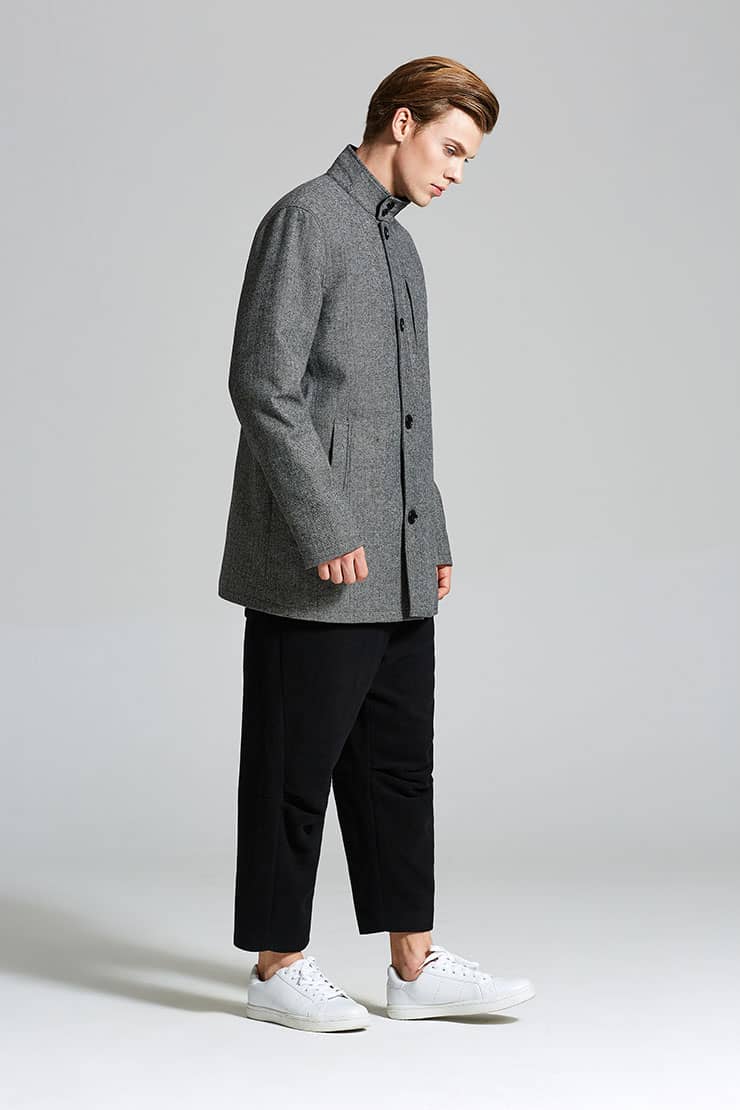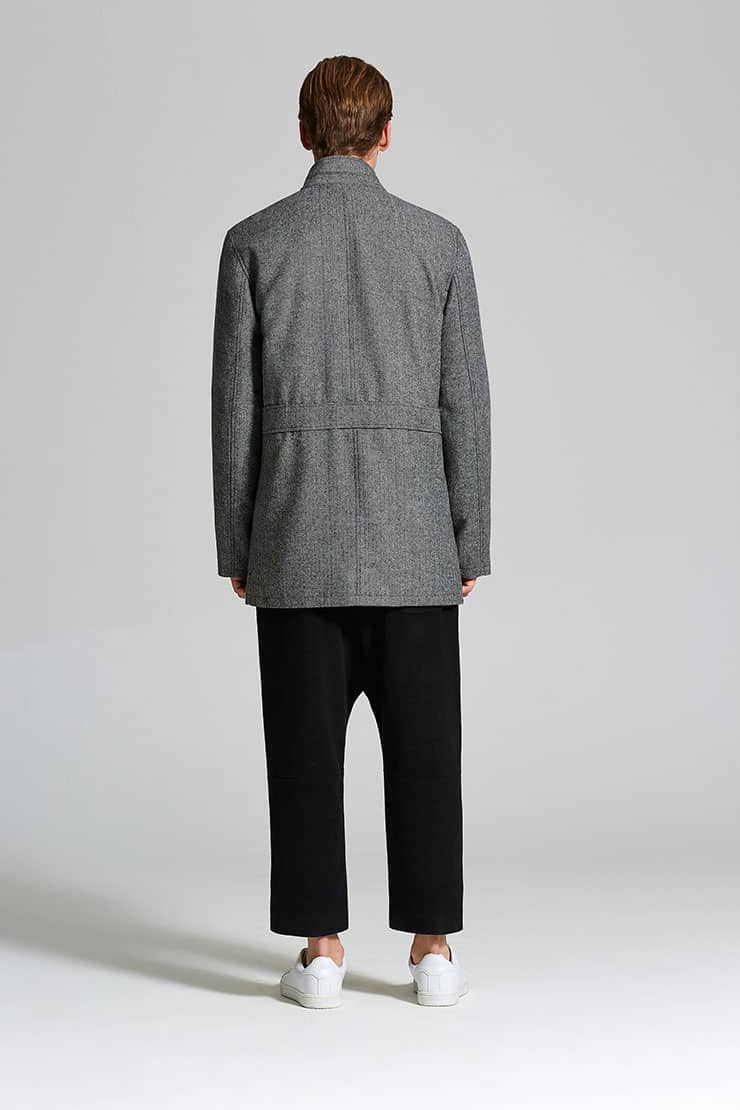 羊毛混纺面料,厚实、保暖,立领,门襟拉链加纽扣,前胸单唇袋藏拉链袋口,下边两侧斜插单唇袋,合体版型剪裁,后腰部合理分割,打造成熟稳重的男人魅力。