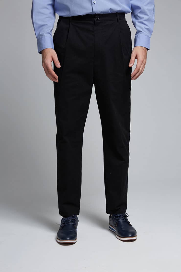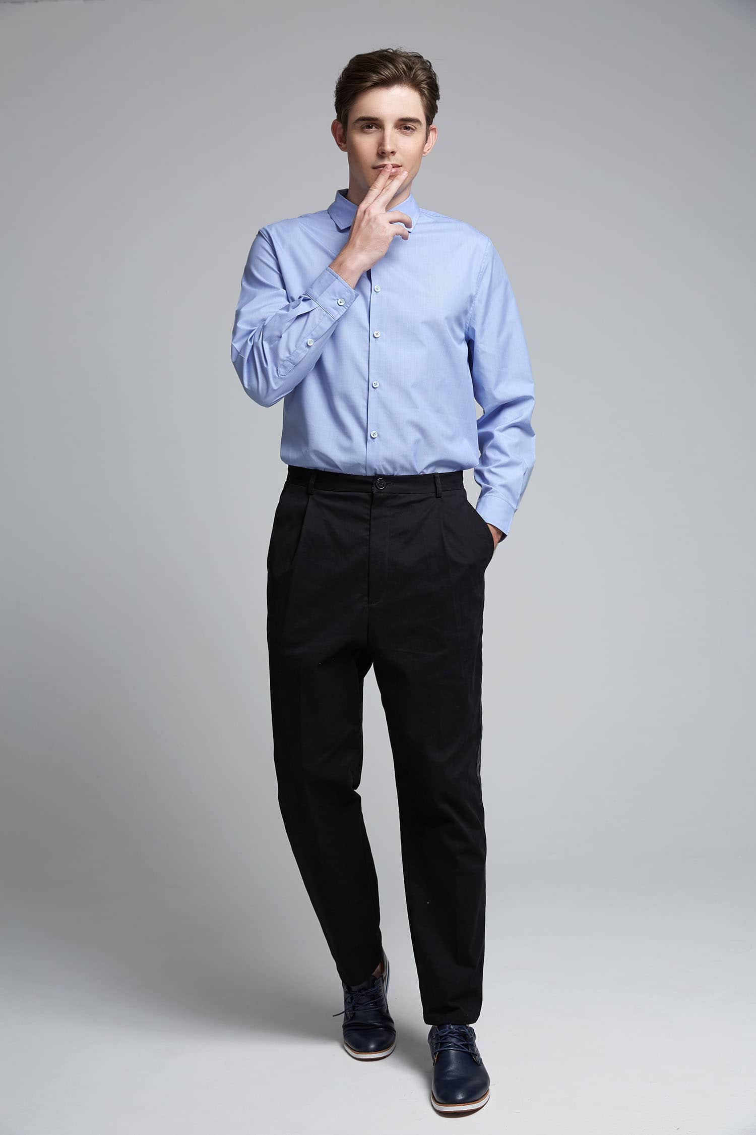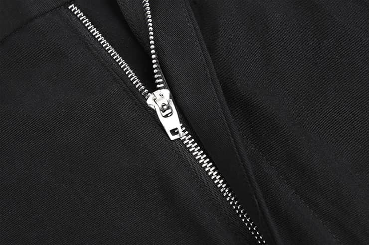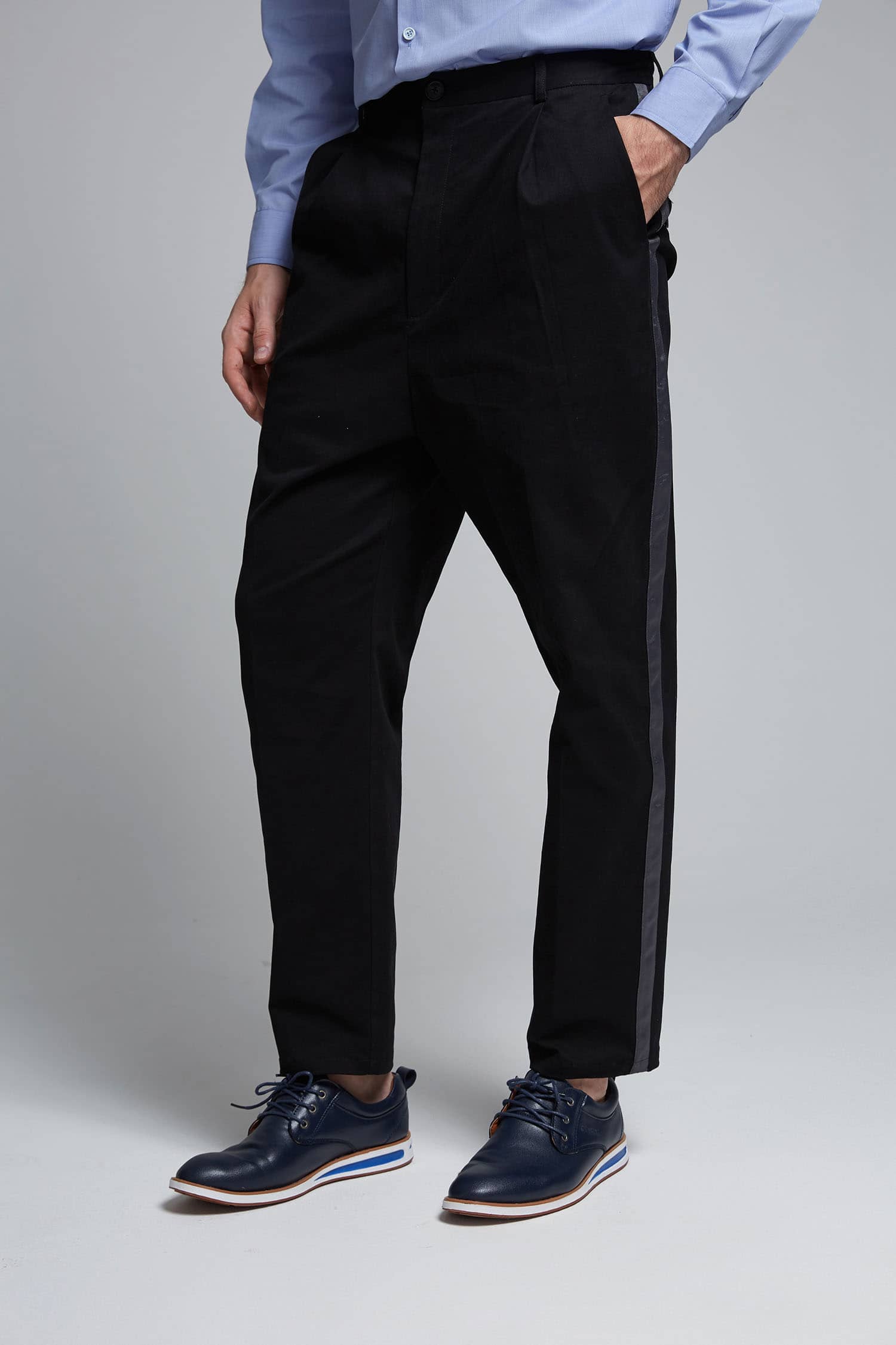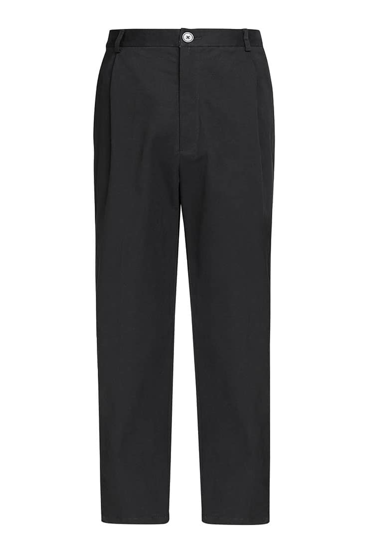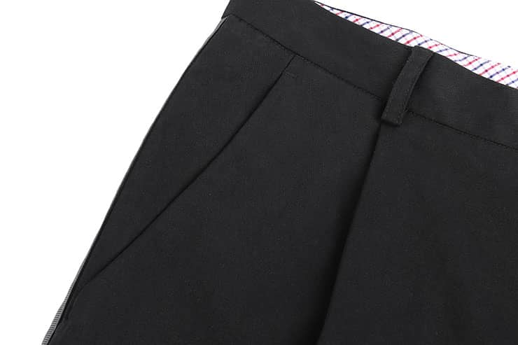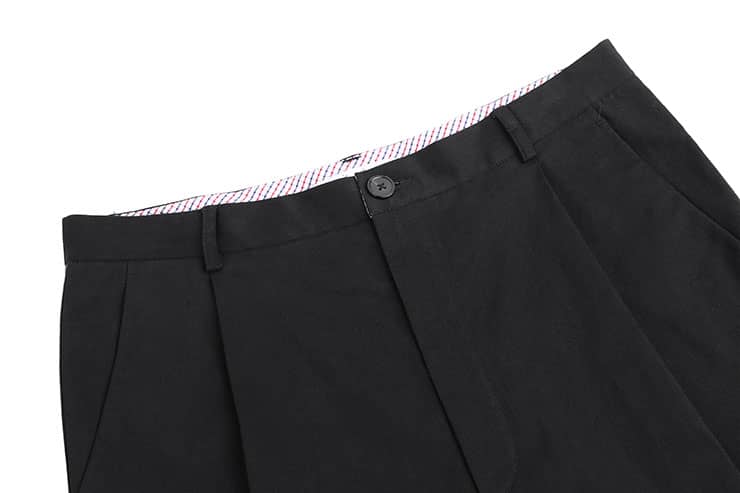 简约的裤腰,腰里用纯棉格仔面料,前中开拉链钉扣子,侧缝拼接撞色织带,后幅开线袋订扣,合体舒适的九分裤型,裤腿微松,版型随性休闲。