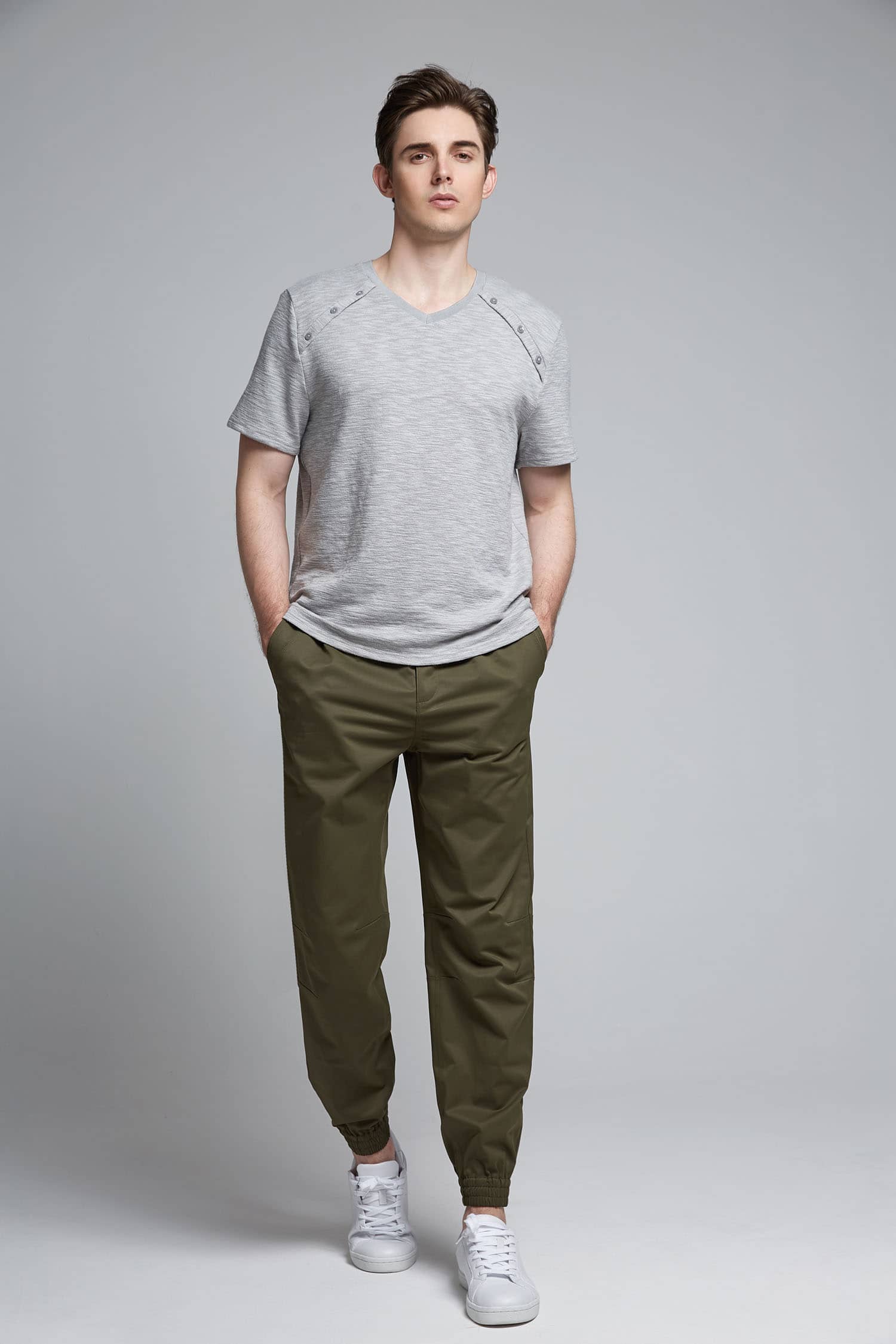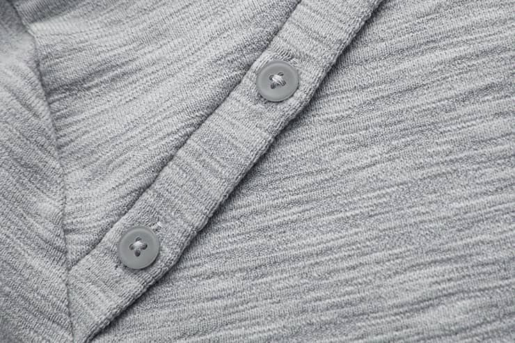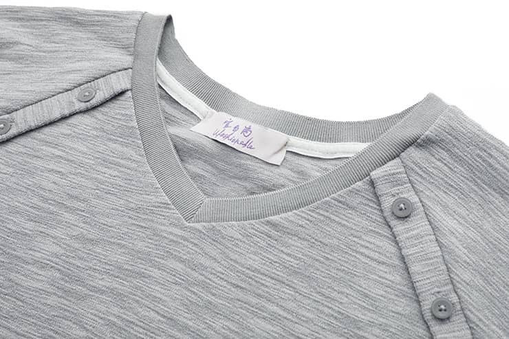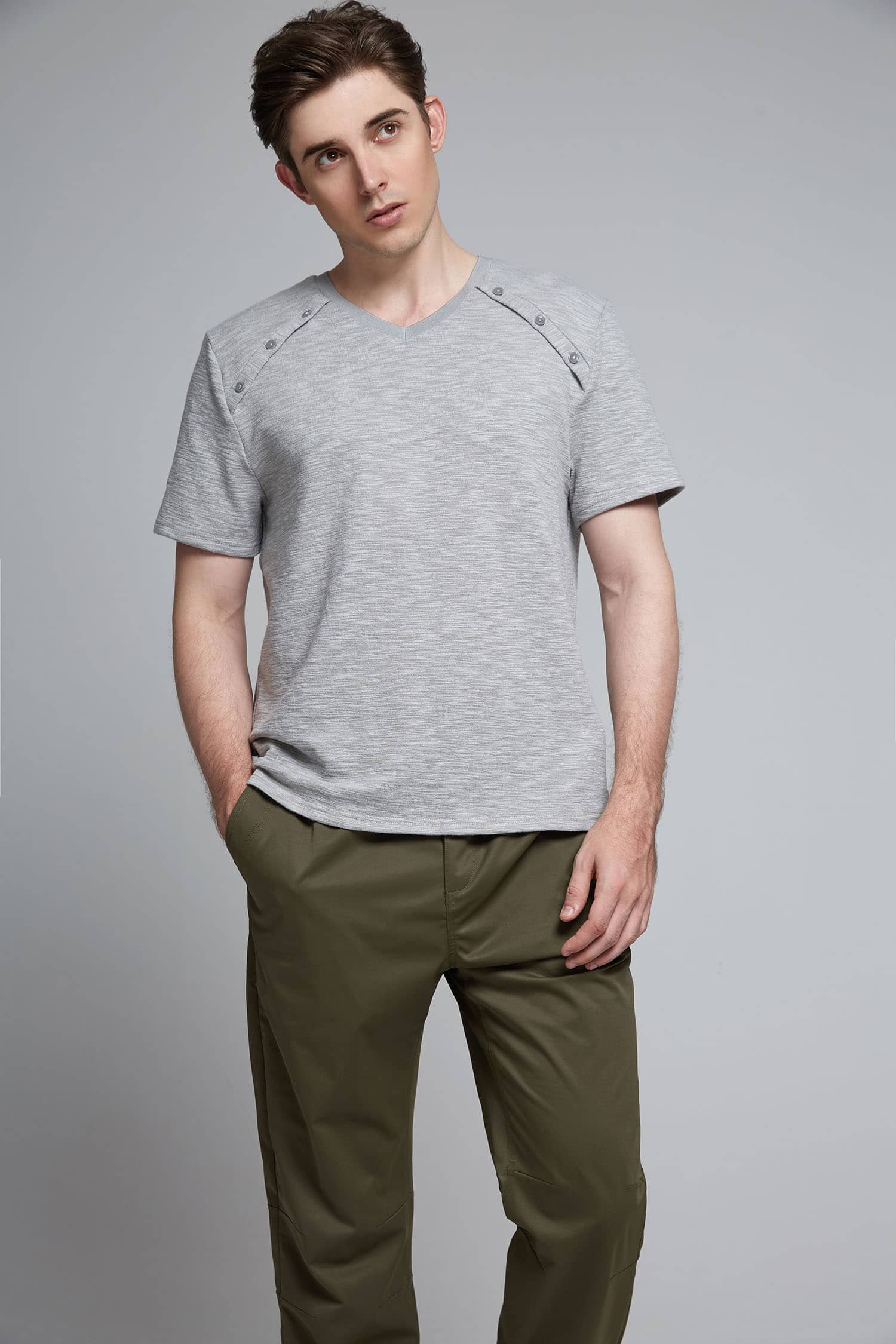 针织面料,合体短袖T恤, V领,肩部风琴订纽扣装饰,下摆及袖口平整的双针走线,版型舒适,做工精细。
