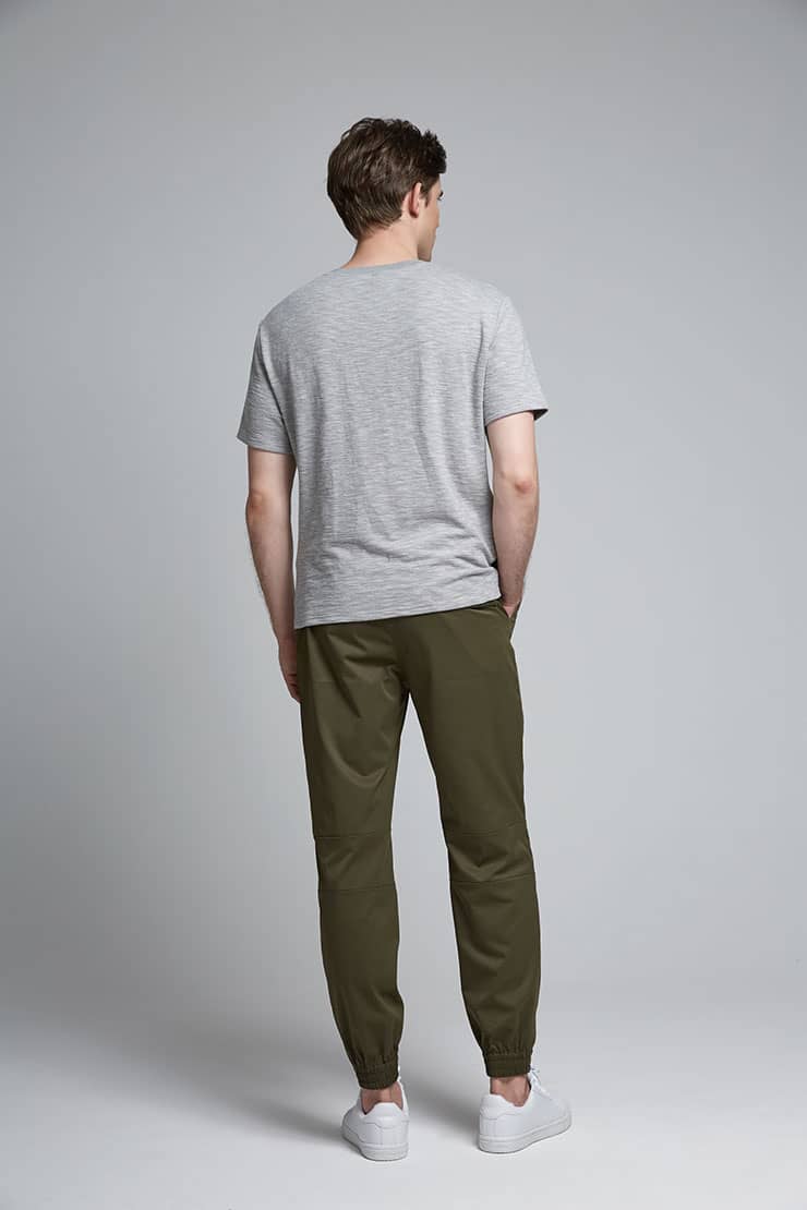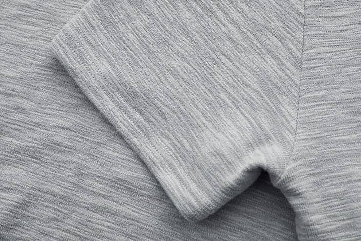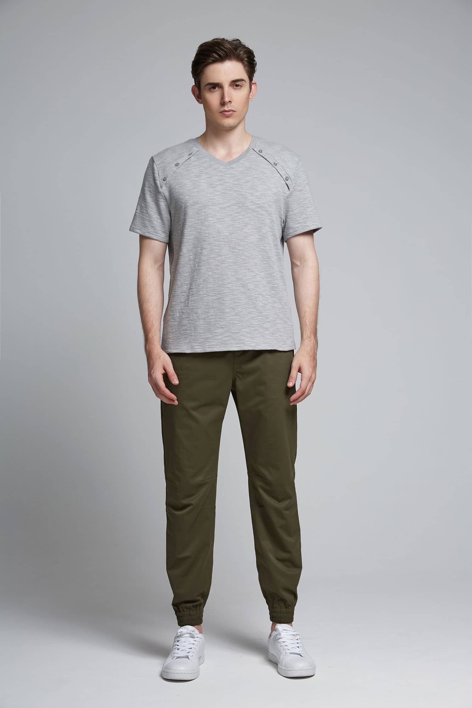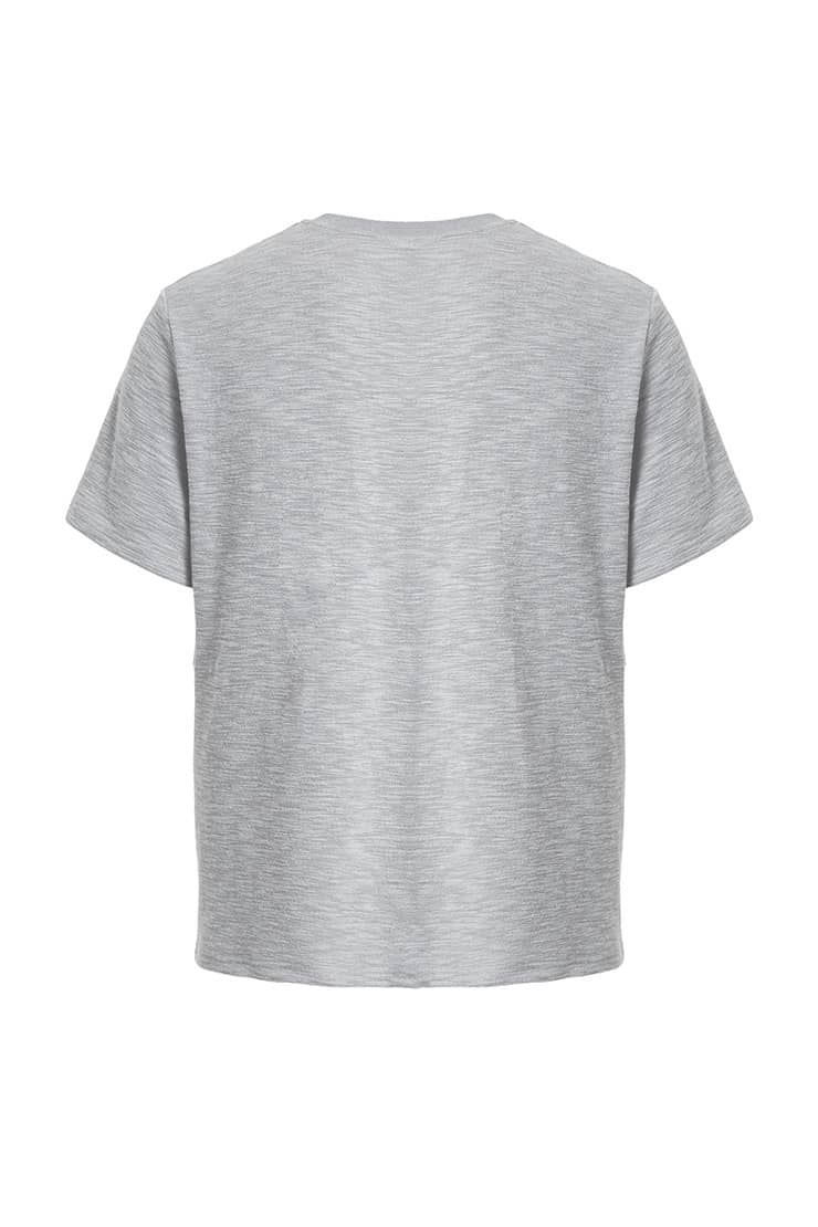 针织面料,合体短袖T恤, V领,肩部风琴订纽扣装饰,下摆及袖口平整的双针走线,版型舒适,做工精细。