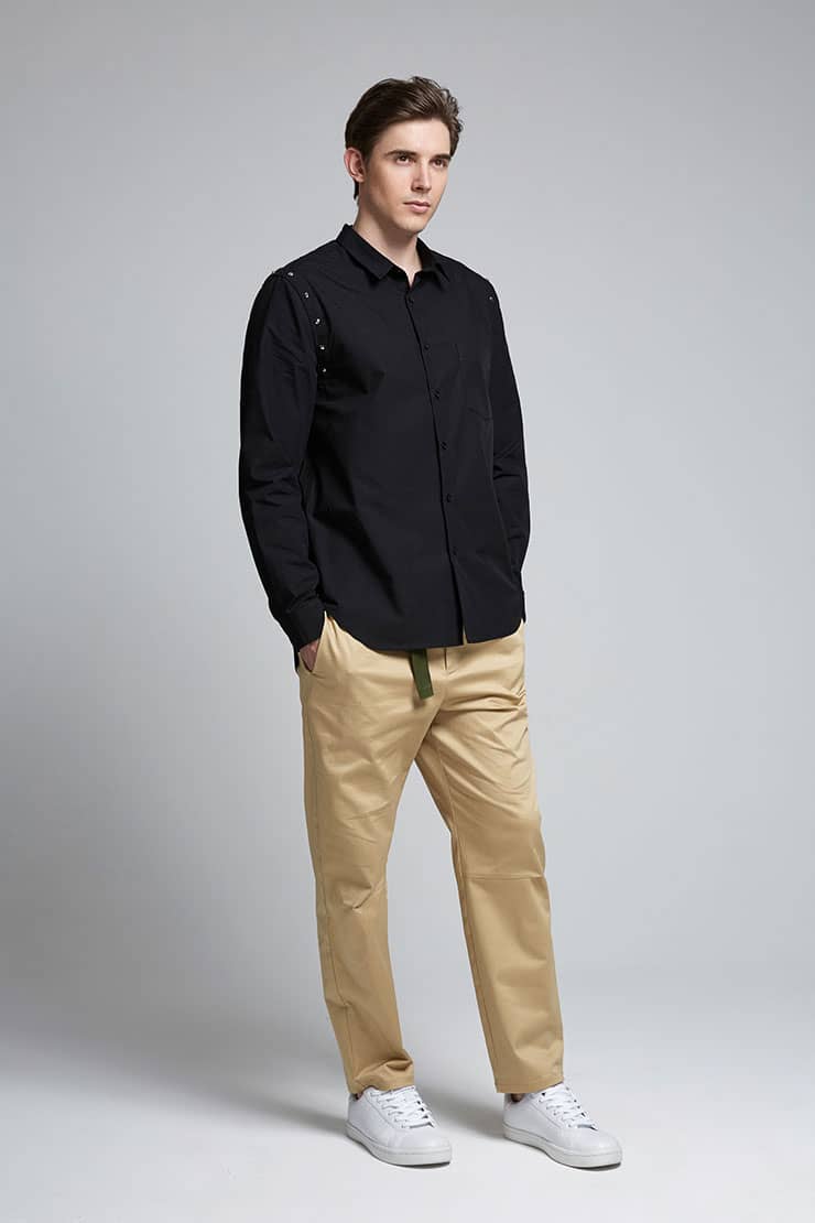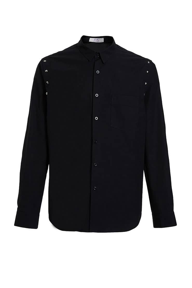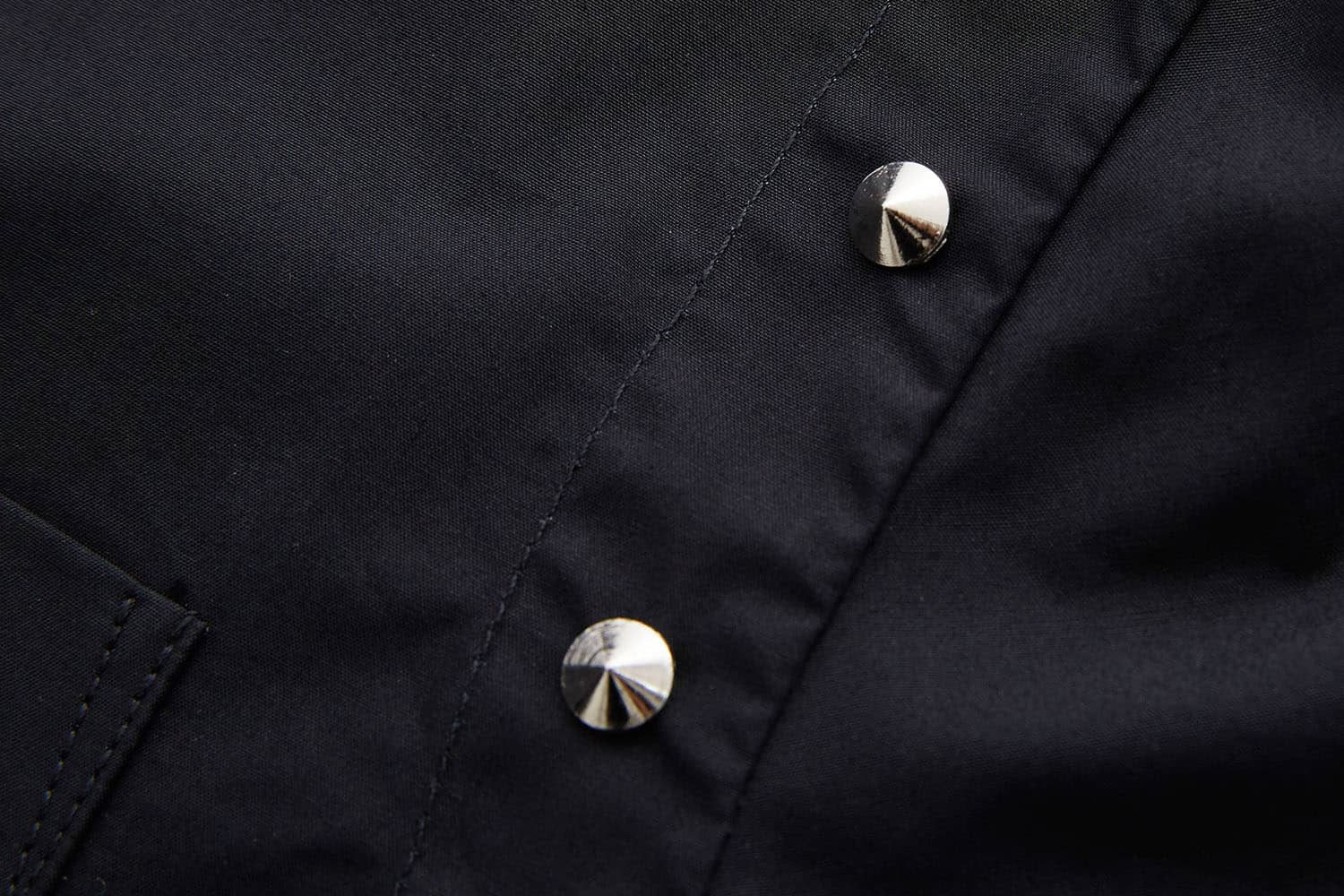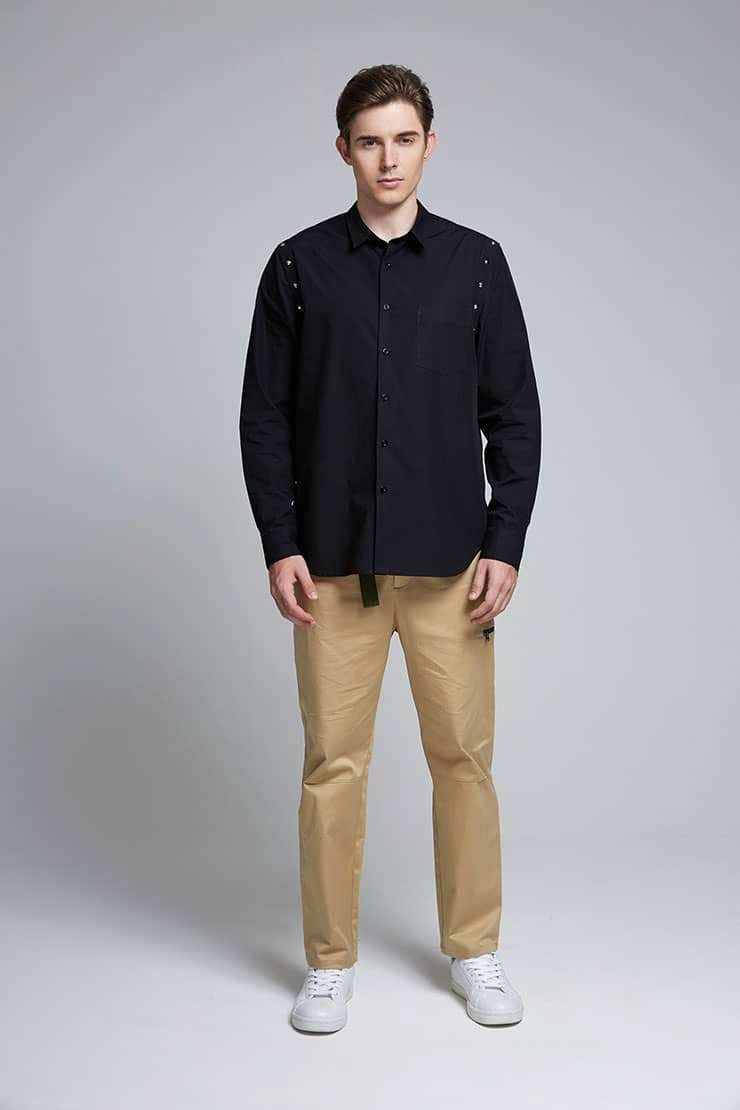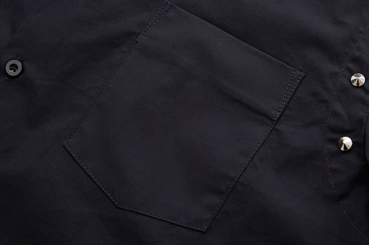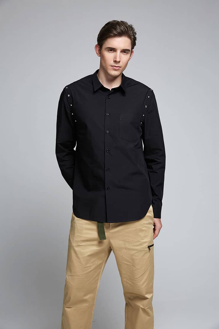 纯棉衬衫面料,方角企领,经典前襟,左胸贴袋,夹圈金属铆钉装饰,合体版型剪裁,弧形下摆,打造挺括身形。
