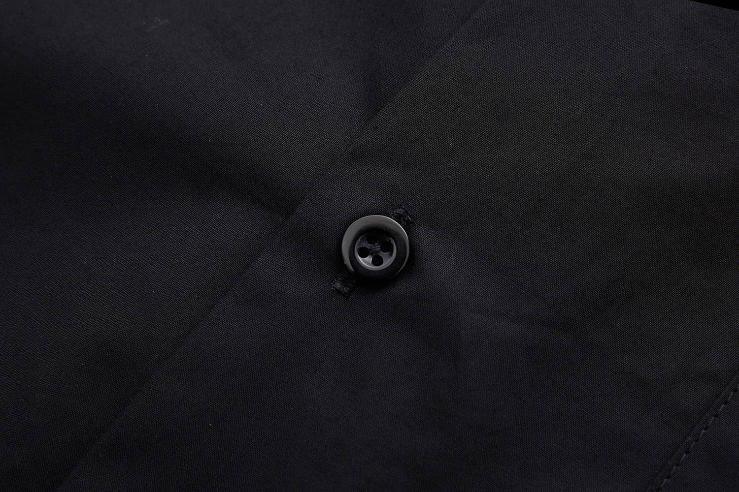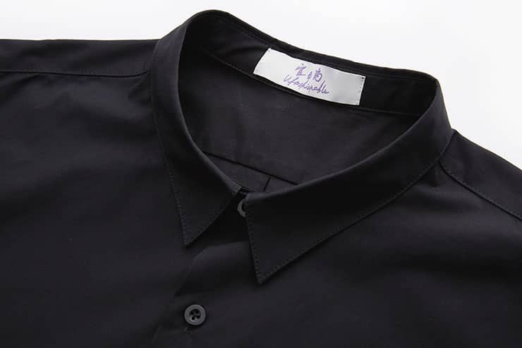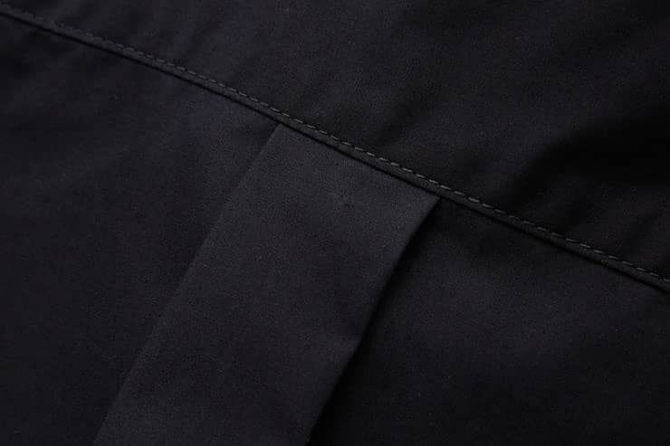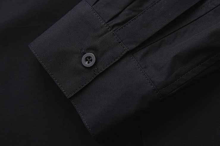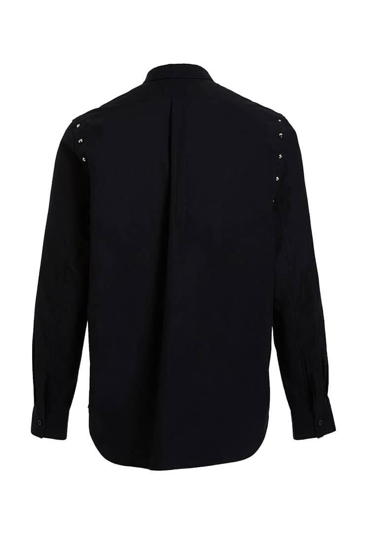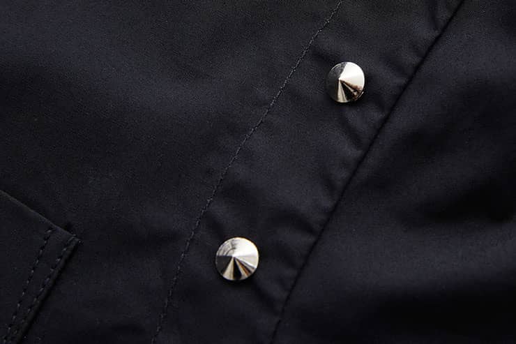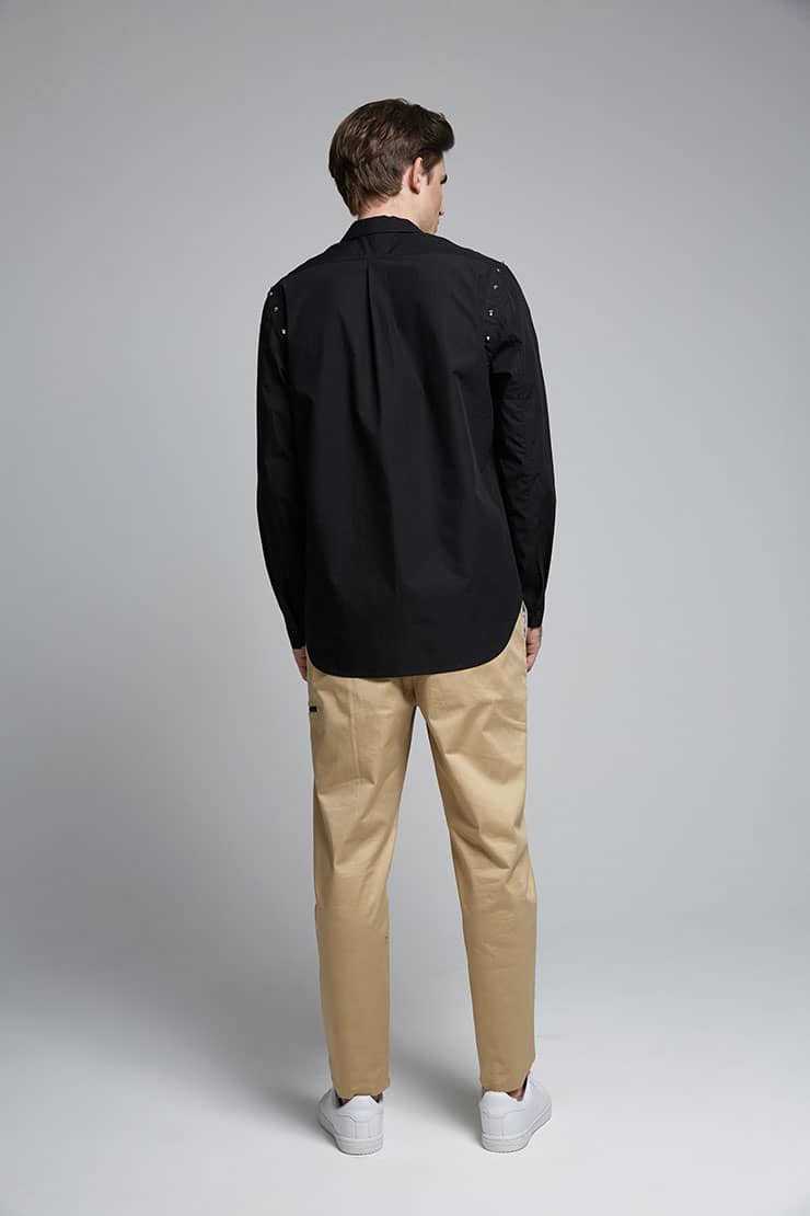 纯棉衬衫面料,方角企领,经典前襟,左胸贴袋,夹圈金属铆钉装饰,合体版型剪裁,弧形下摆,打造挺括身形。