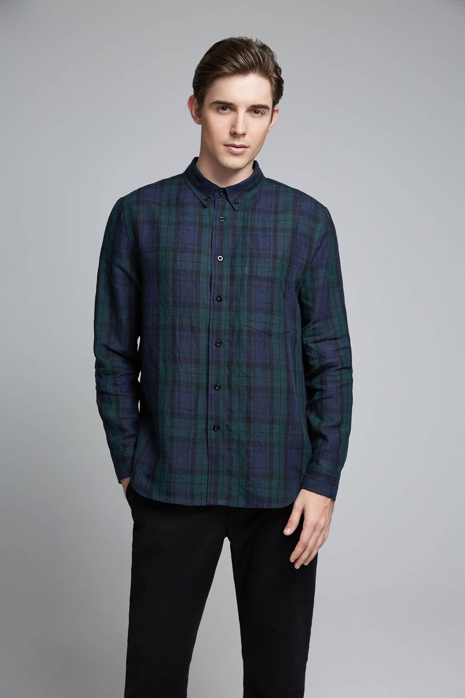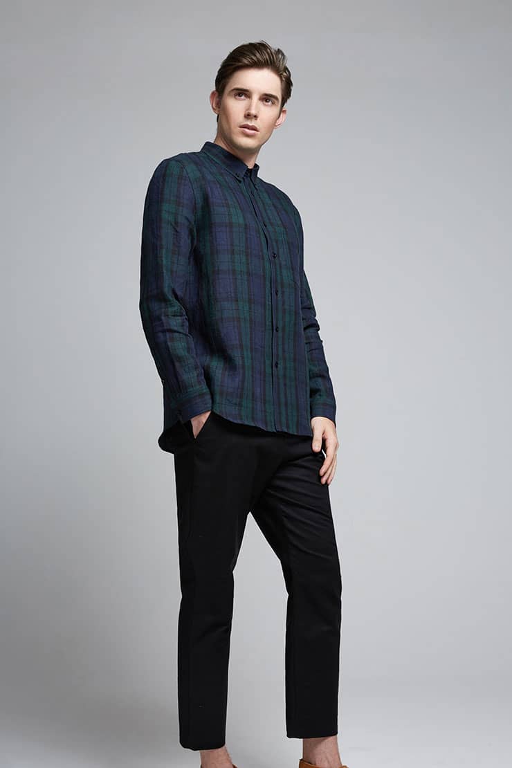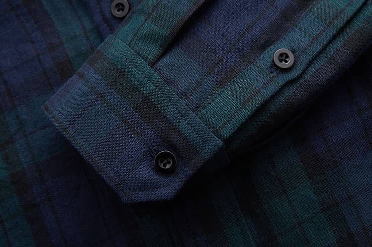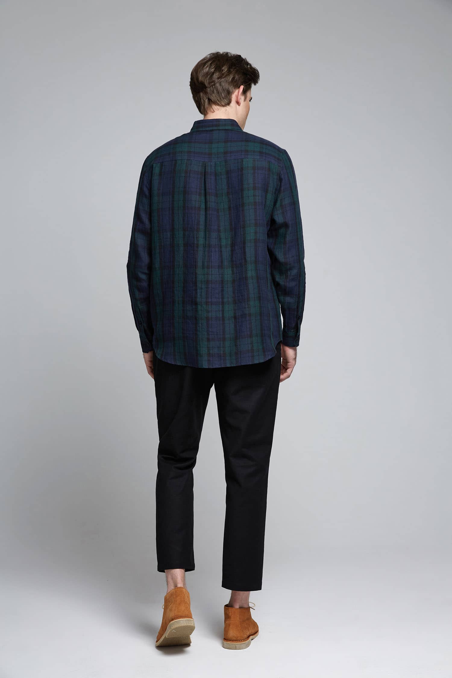亚麻色织面料休闲西装,经过后期水洗处理,增加面料的柔软性及怀旧性;翻驳领,单排三粒扣,下边两侧圆角大贴袋,无袖衩,后中下摆开衩。