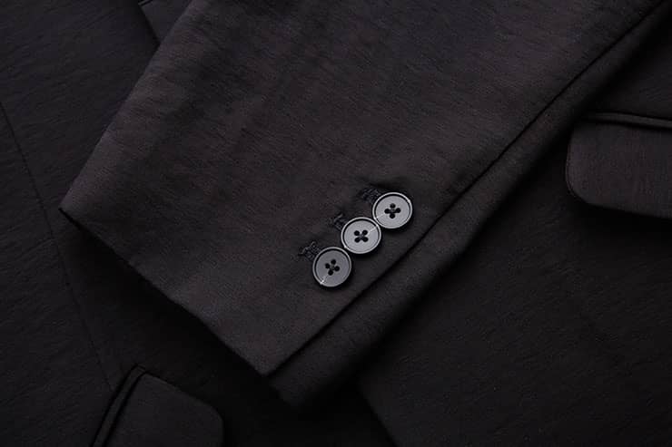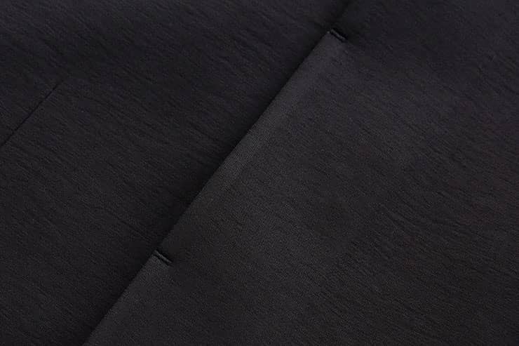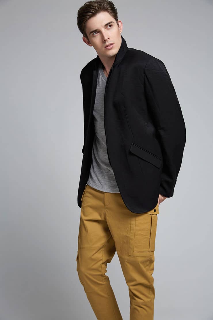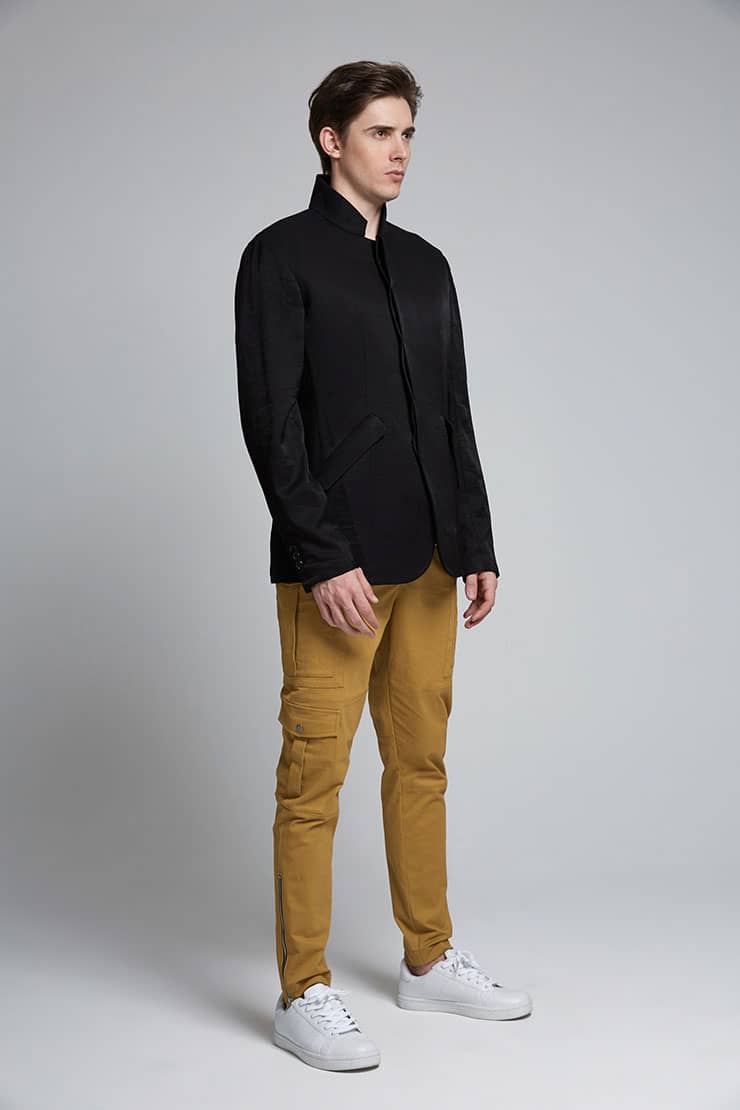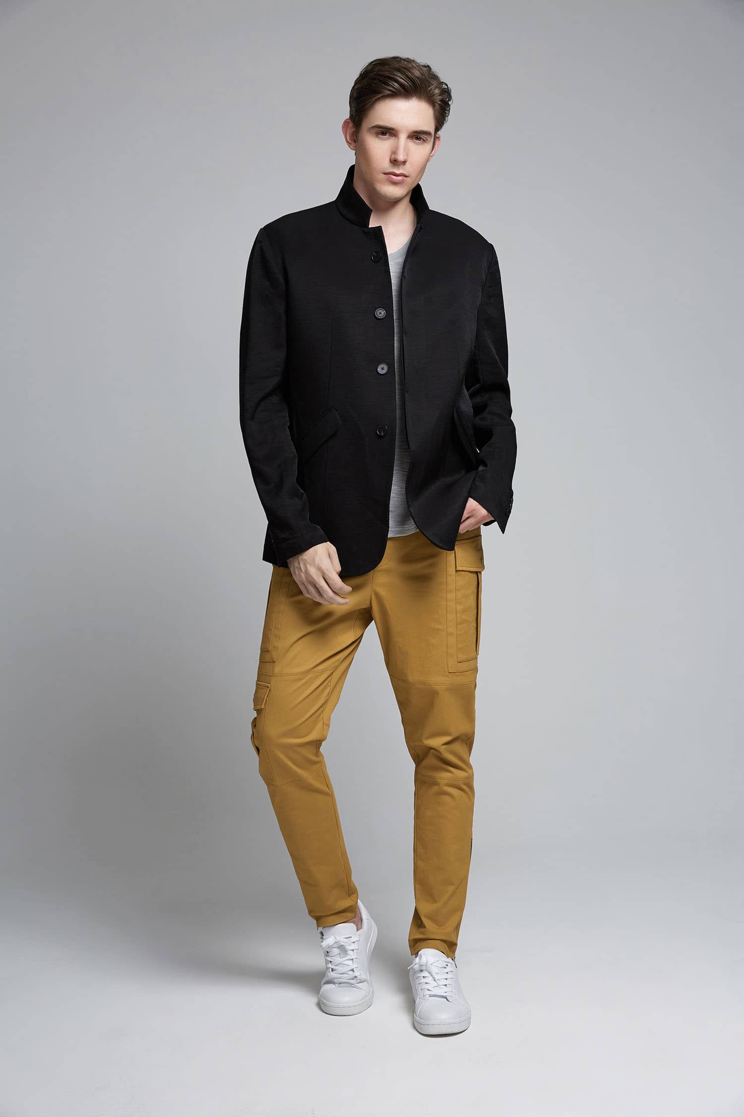 高密支的梭织面料,防风、挺括舒适,立领,暗门襟,圆角下摆,前幅下边两侧设有斜插夹袋盖的双嵌线衣袋,袖子倾斜分割,袖叉设有三粒扣。
