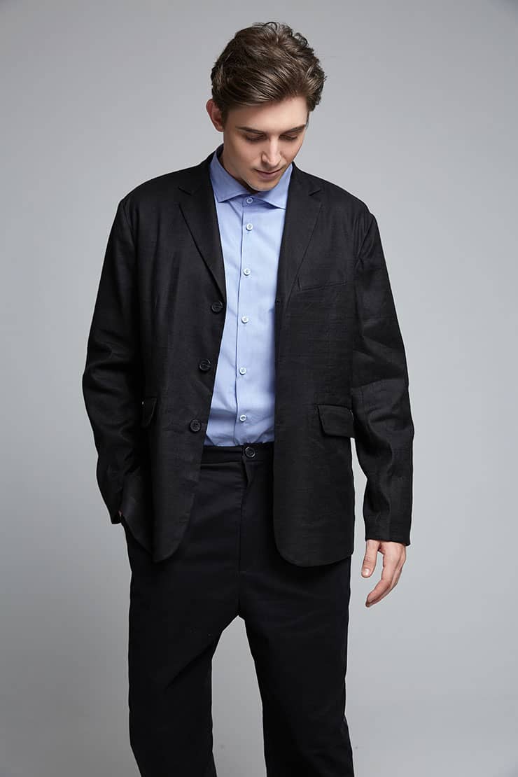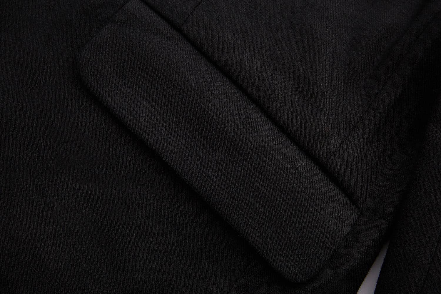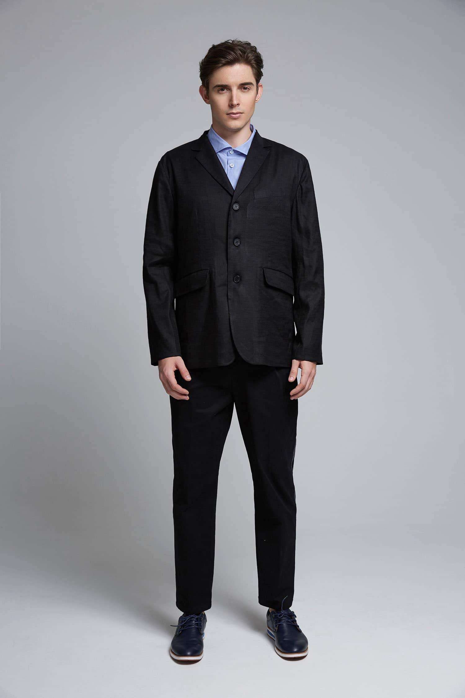 采用优质压麻面料,翻驳领,三粒扣,圆摆,左胸有手巾袋,下边两侧设有夹袋盖的单嵌线衣袋,无袖衩,后中下摆开衩。