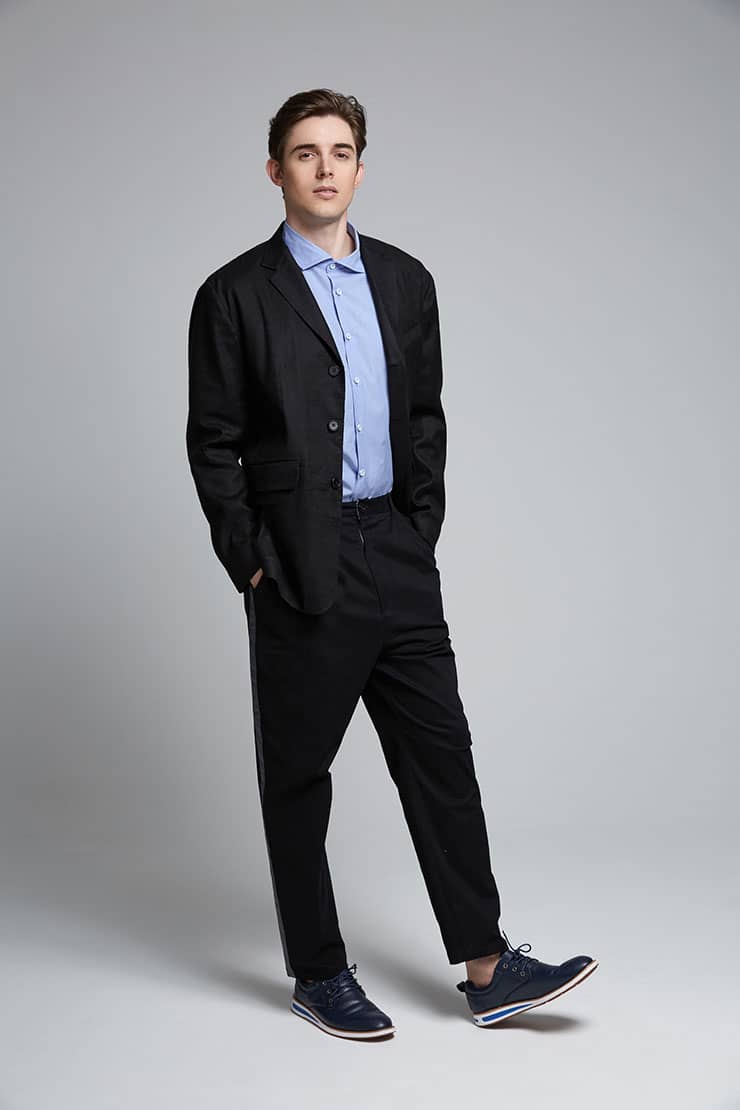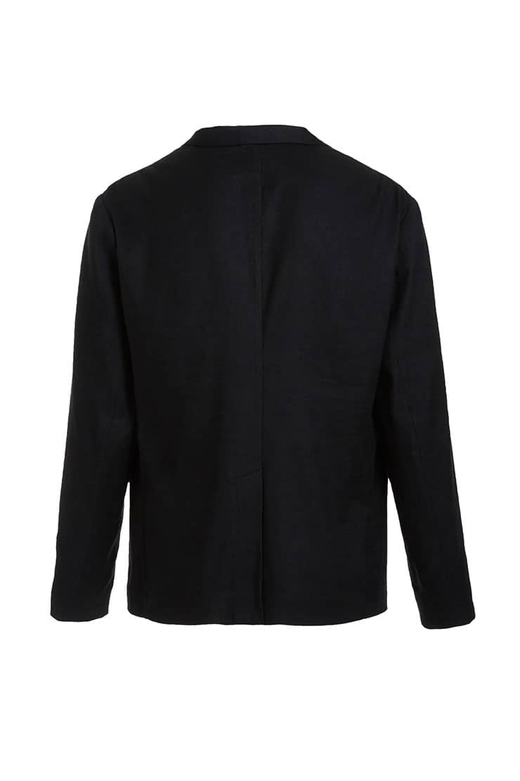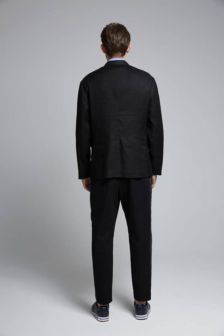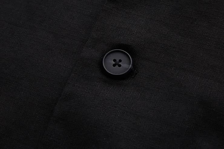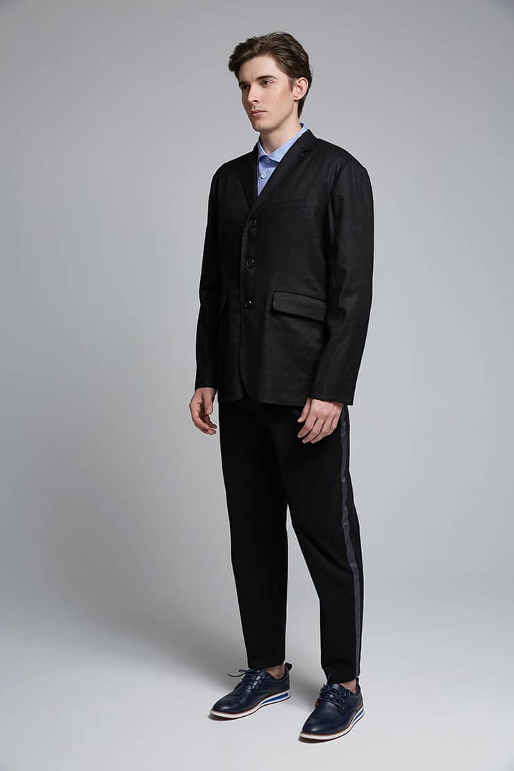 采用优质压麻面料,翻驳领,三粒扣,圆摆,左胸有手巾袋,下边两侧设有夹袋盖的单嵌线衣袋,无袖衩,后中下摆开衩。