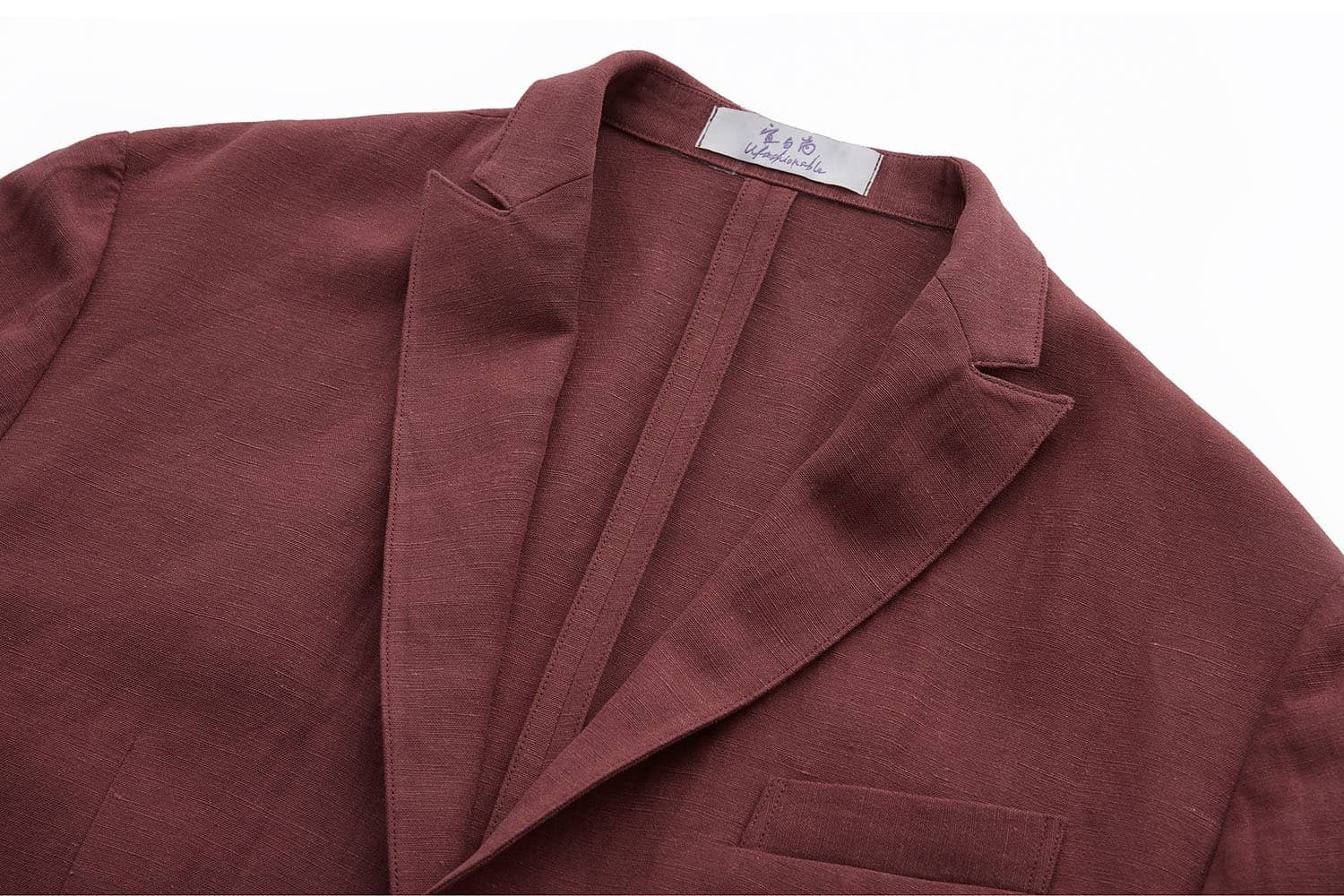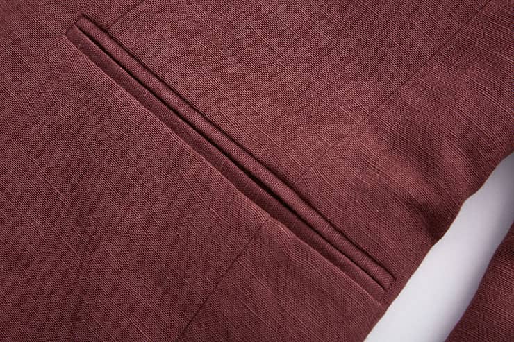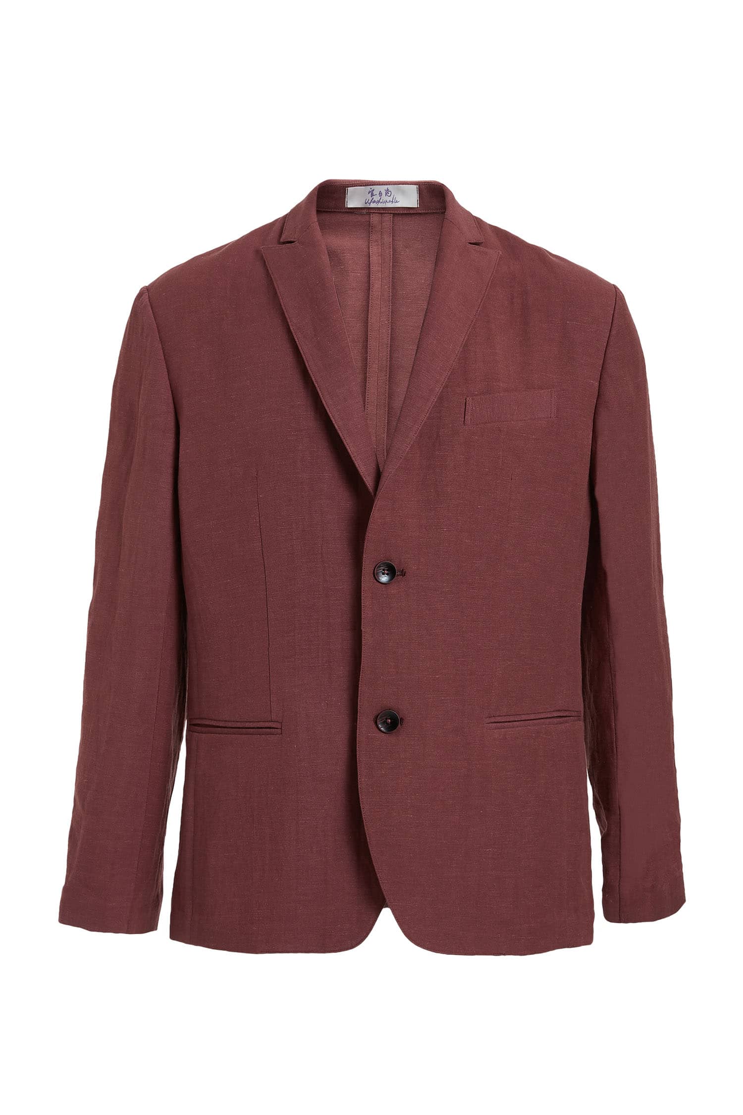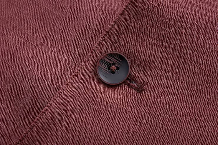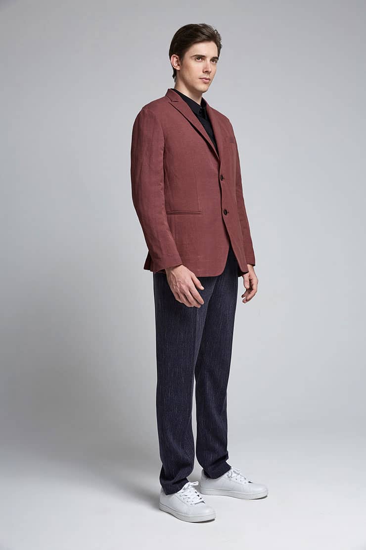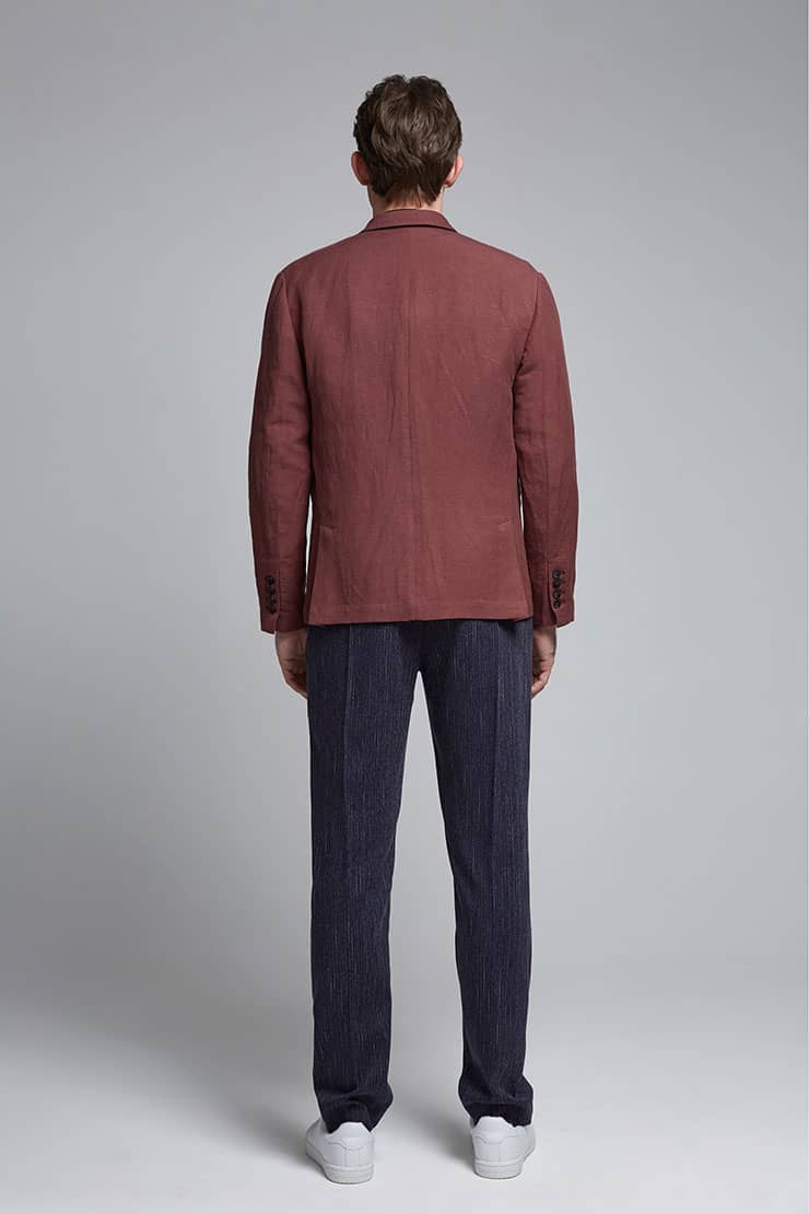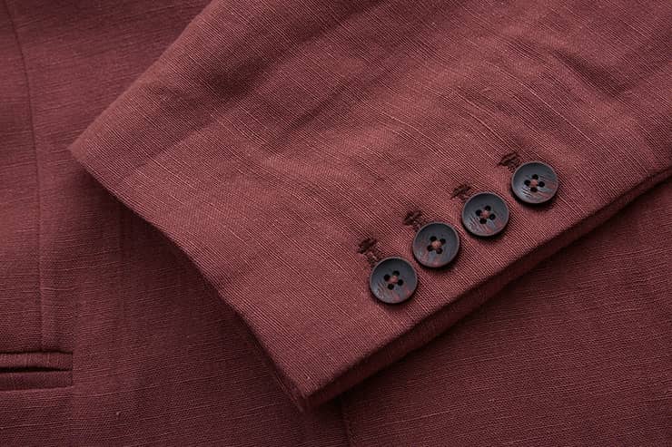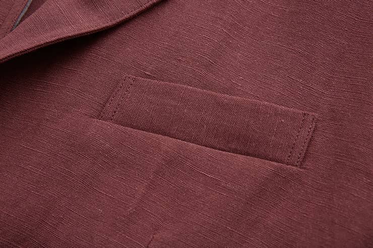 棉麻混纺休闲西装外套,两粒扣戗驳领,领边及门襟边缘走同色粗线,左胸有手巾袋,下边两侧设有双嵌线袋,袖叉有四粒饰扣,后下摆侧开叉。