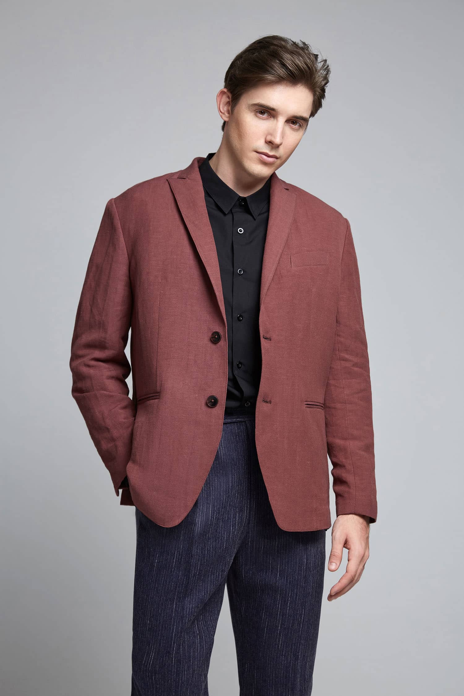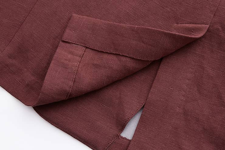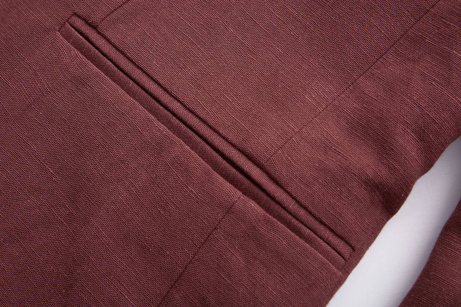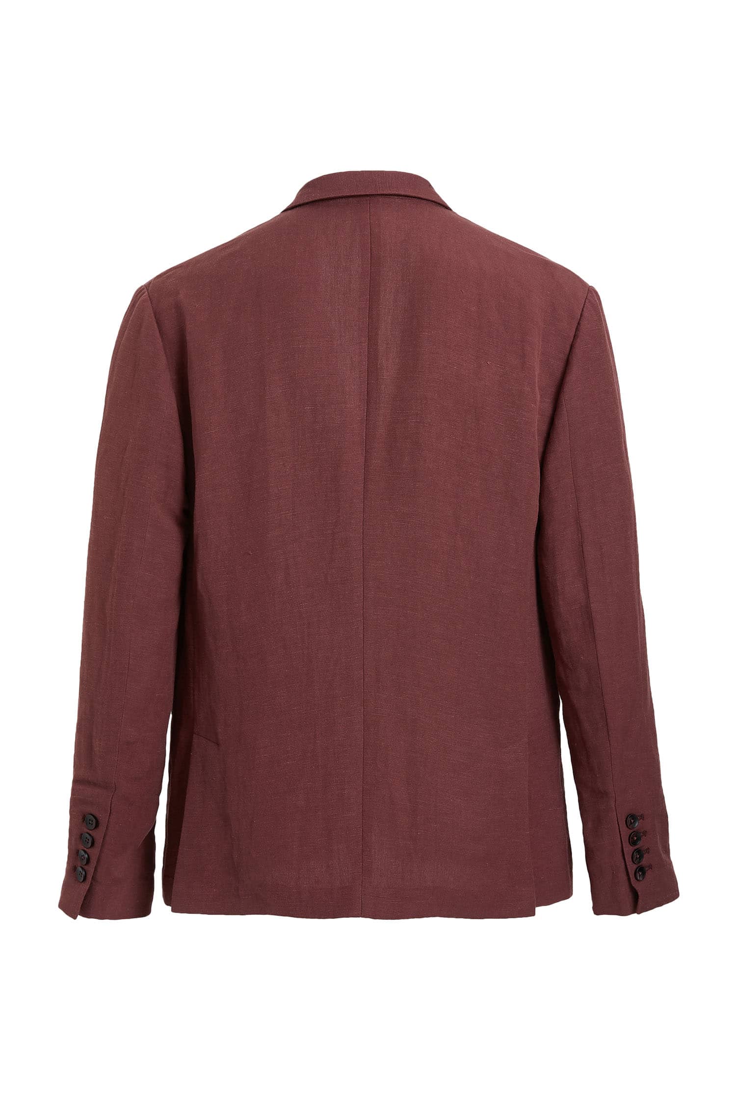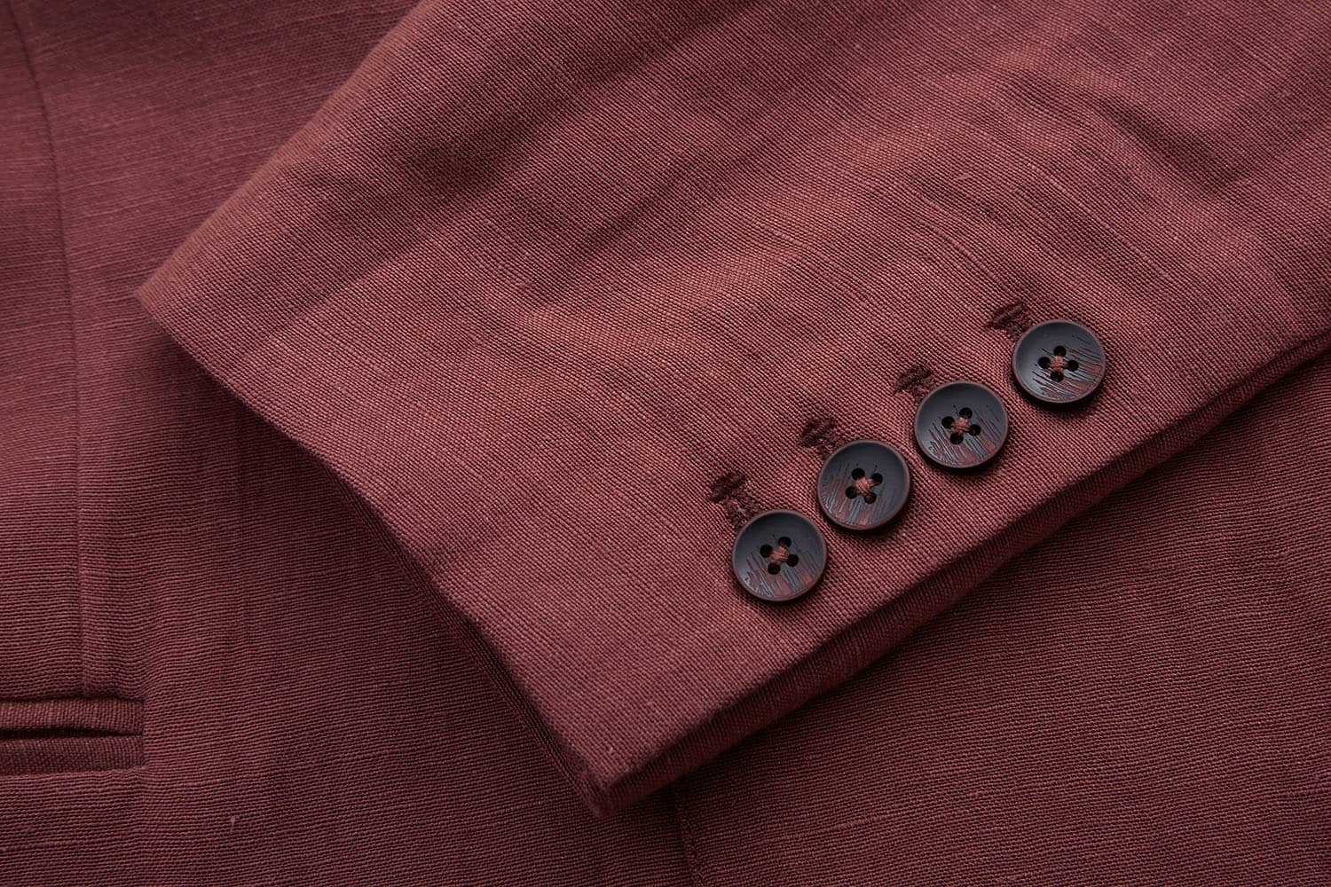 棉麻混纺休闲西装外套,两粒扣戗驳领,领边及门襟边缘走同色粗线,左胸有手巾袋,下边两侧设有双嵌线袋,袖叉有四粒饰扣,后下摆侧开叉。