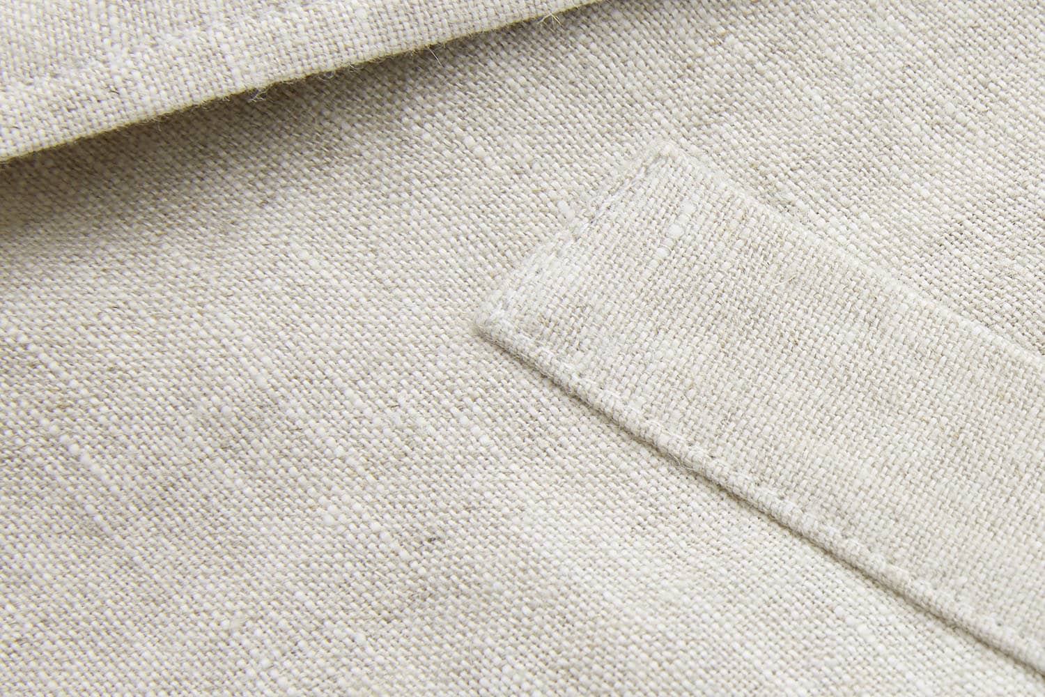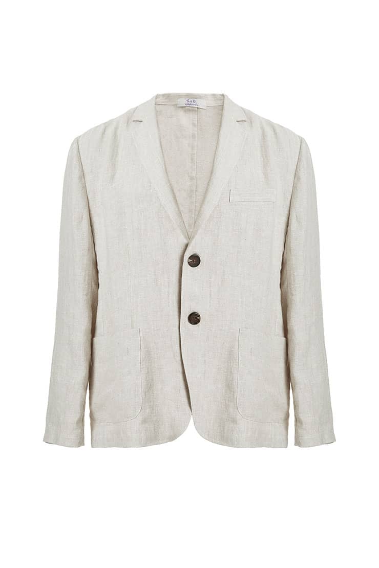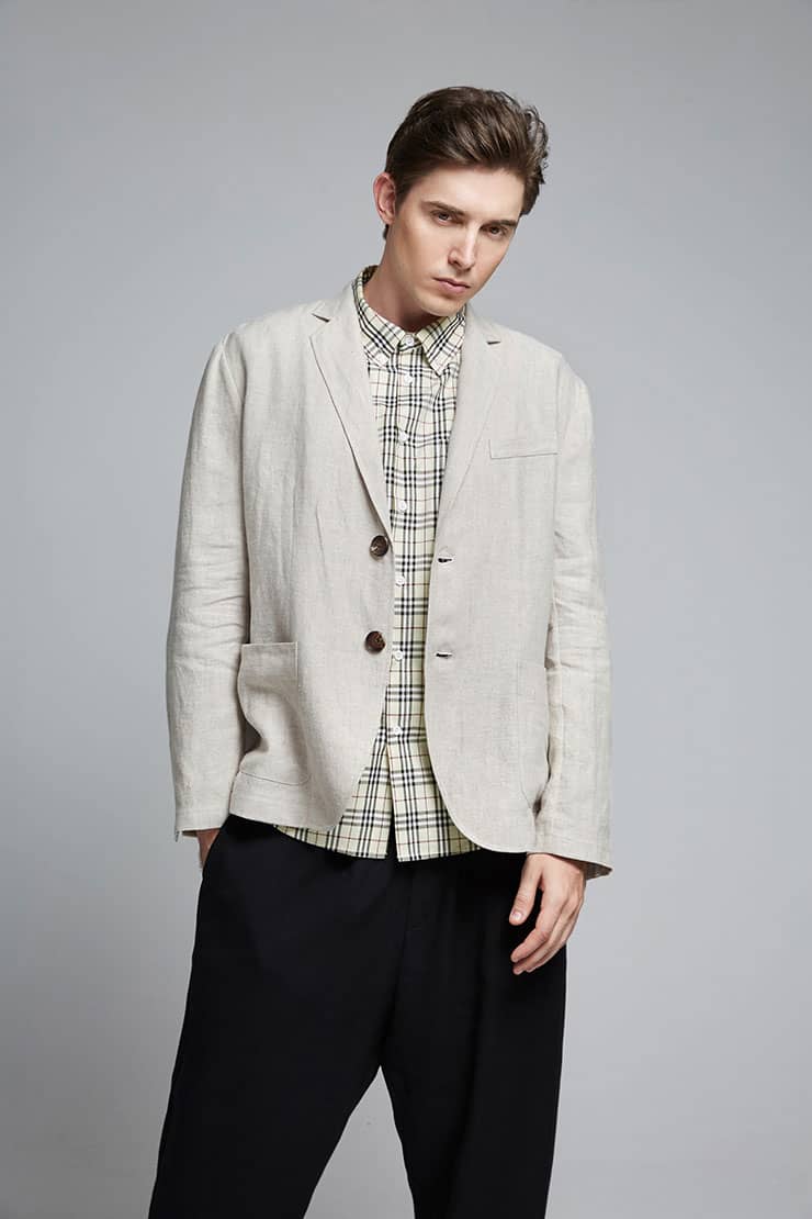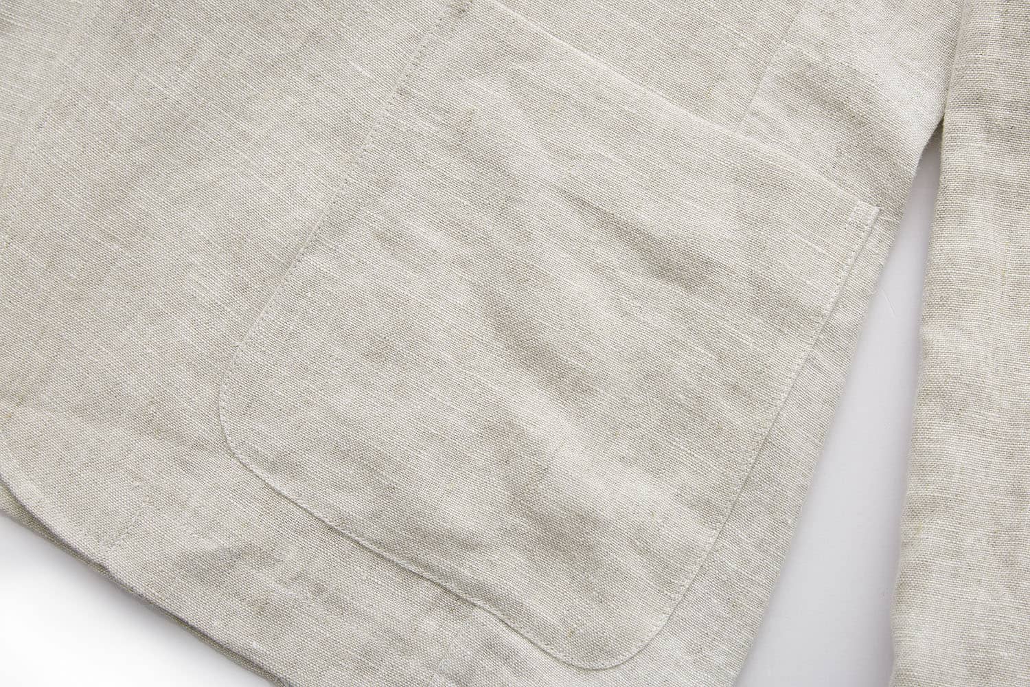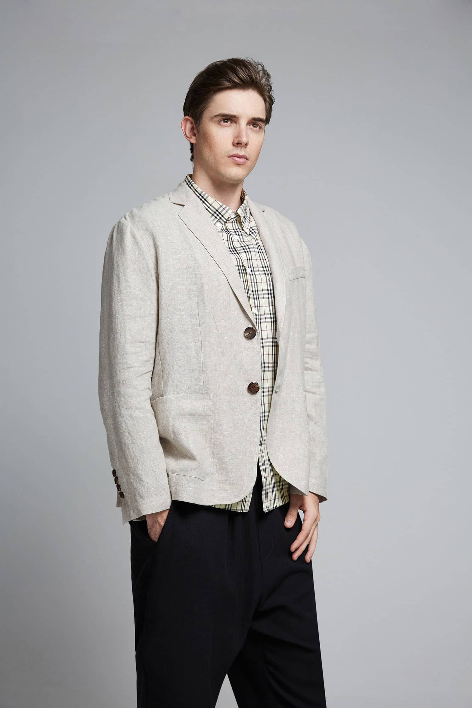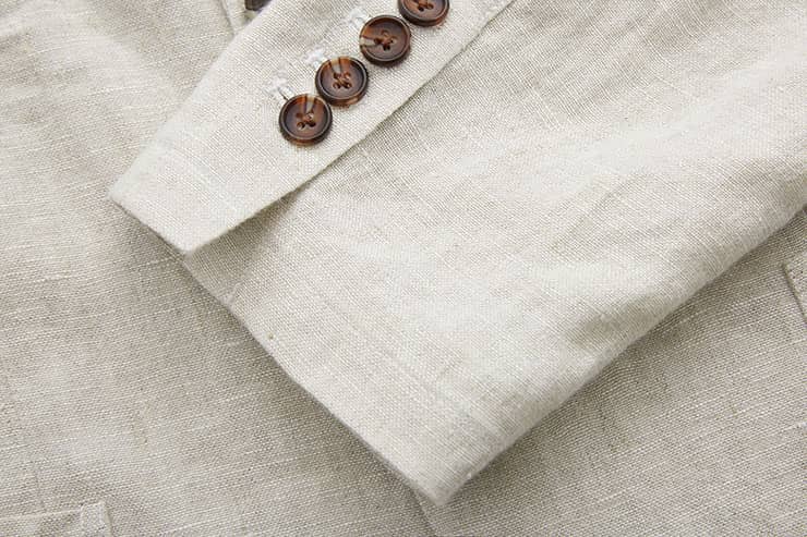 亚麻色织休闲西装外套,翻驳领,单排两粒扣,圆摆,左胸有手巾袋,下边两侧圆角大贴袋,袖衩四粒饰扣,后身下摆侧开衩。