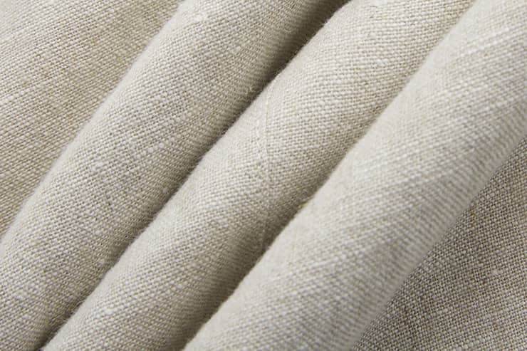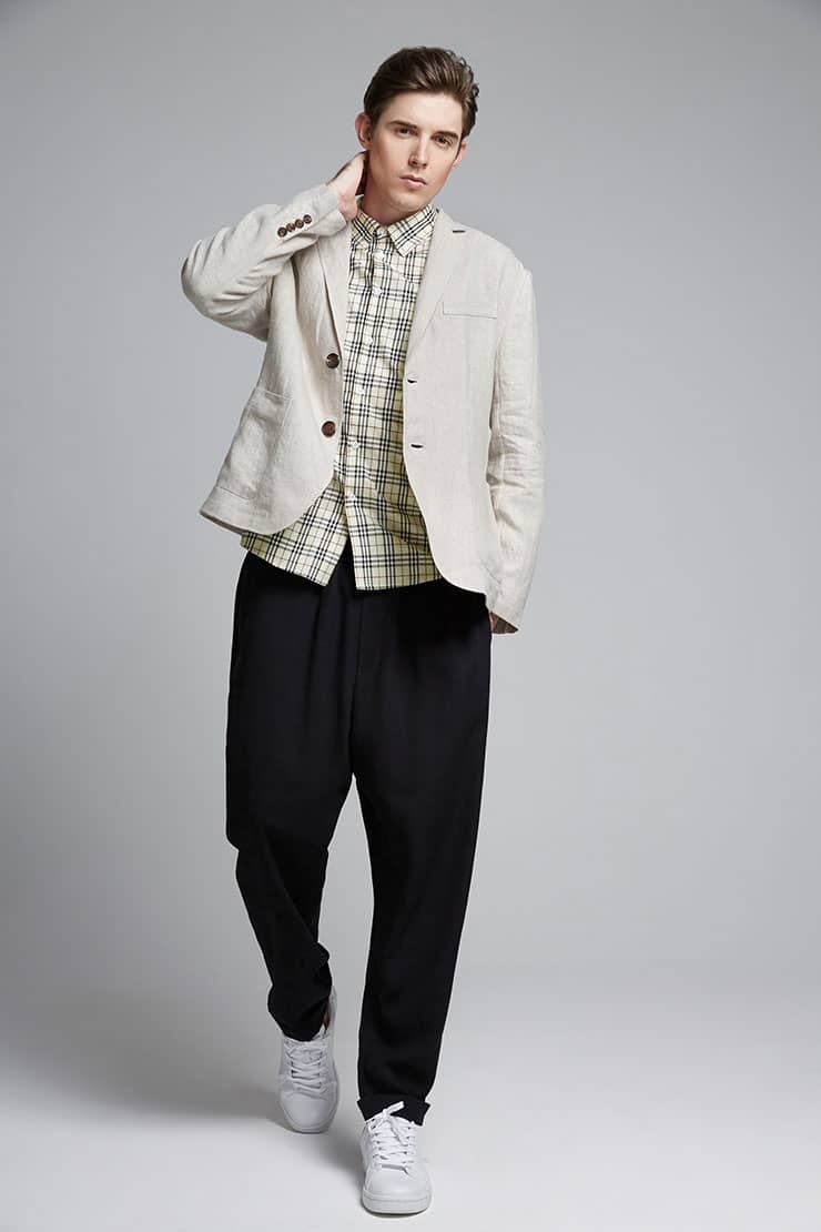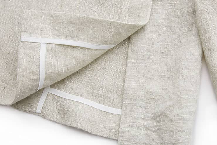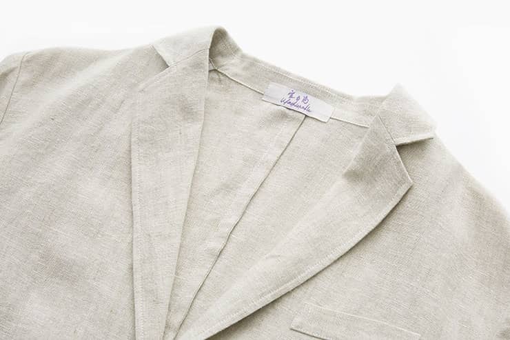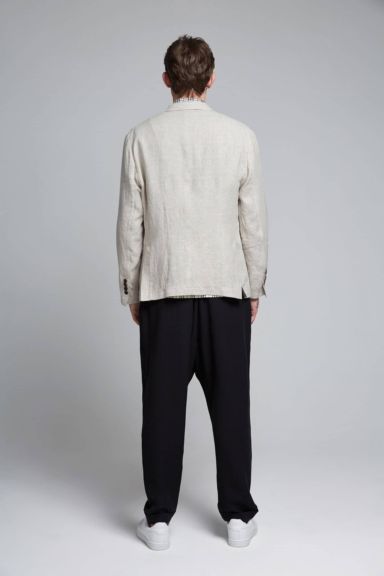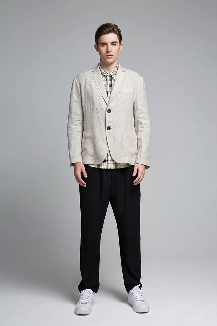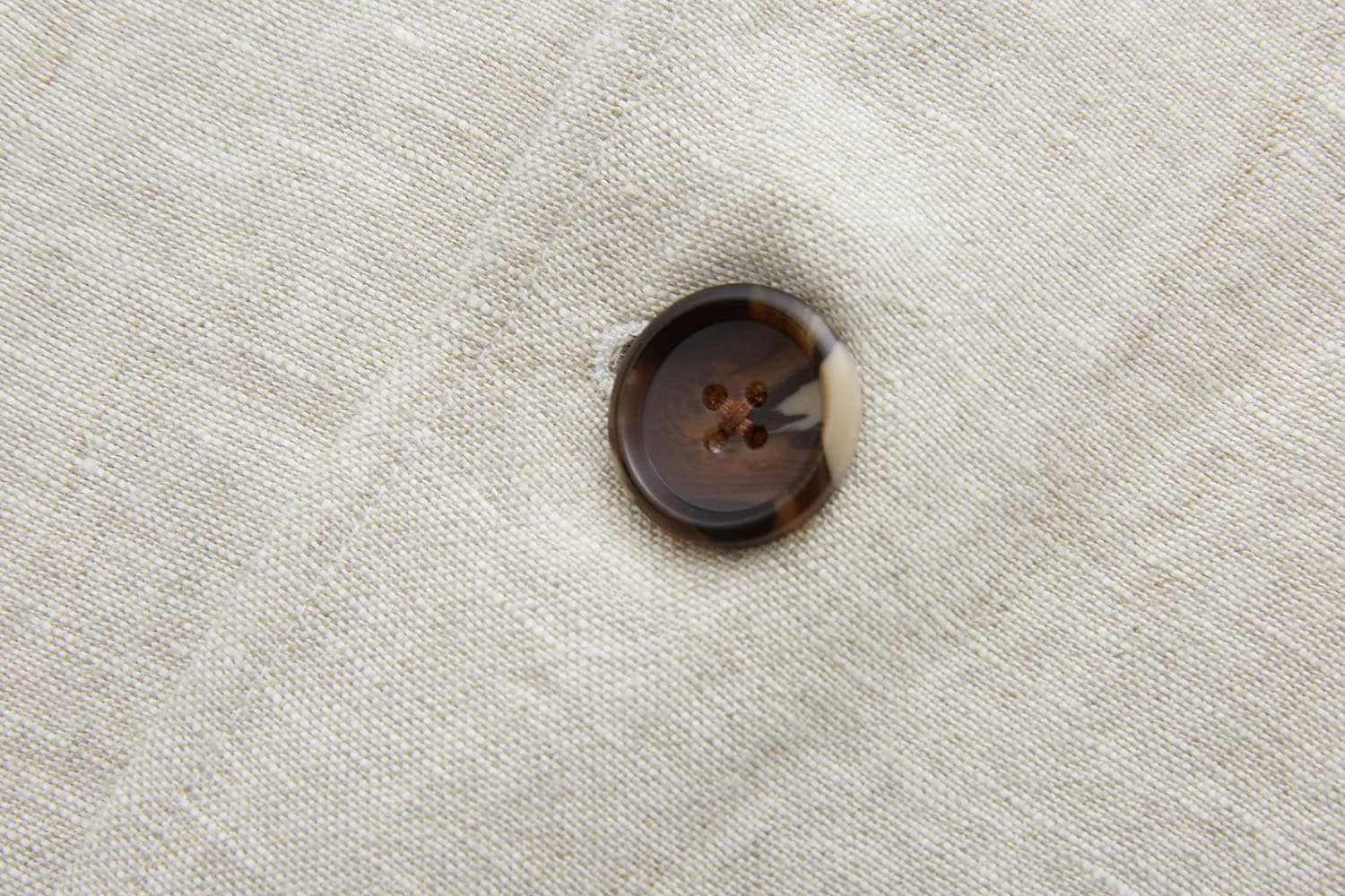 亚麻色织休闲西装外套,翻驳领,单排两粒扣,圆摆,左胸有手巾袋,下边两侧圆角大贴袋,袖衩四粒饰扣,后身下摆侧开衩。