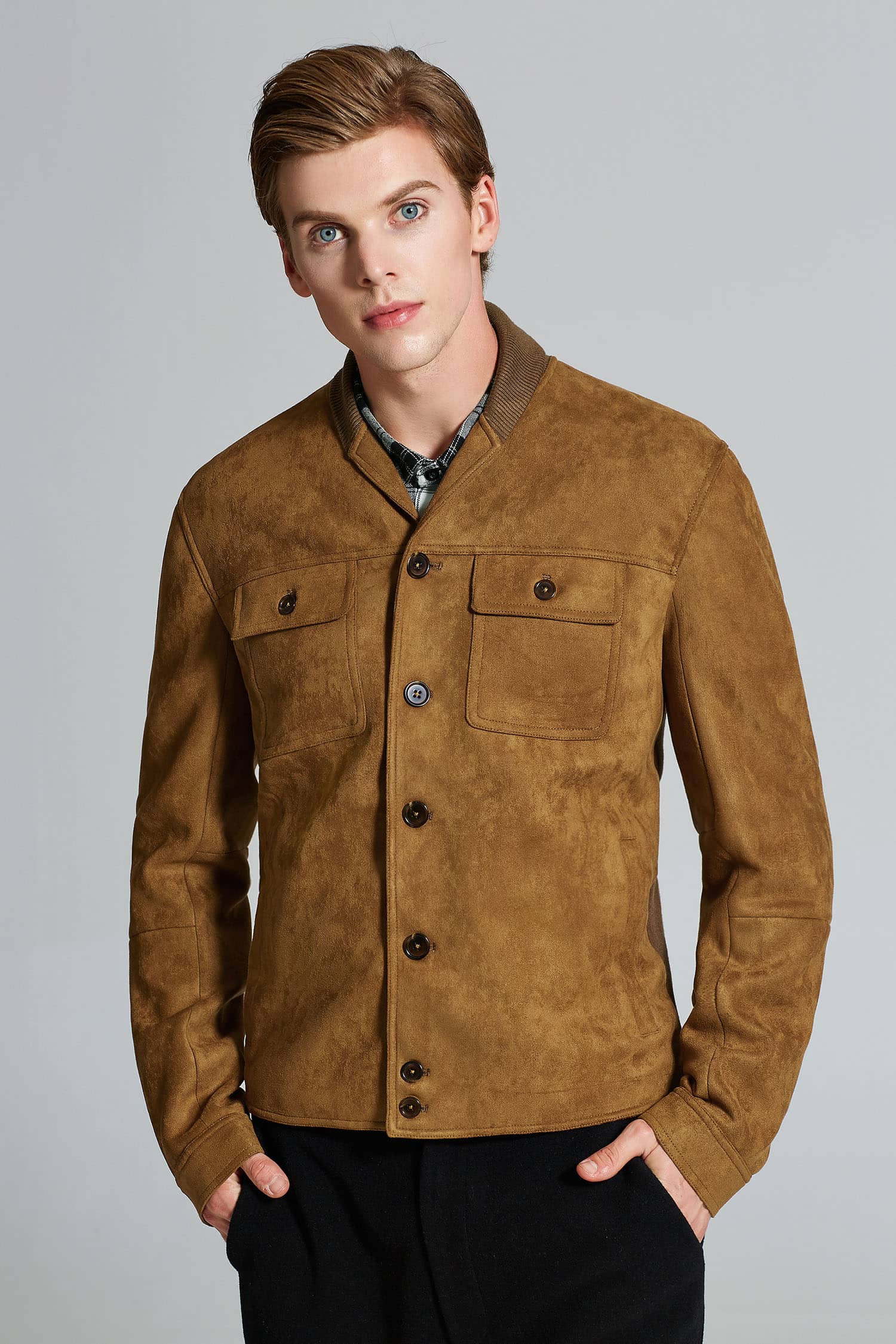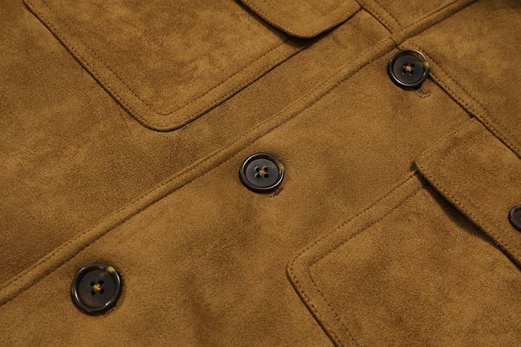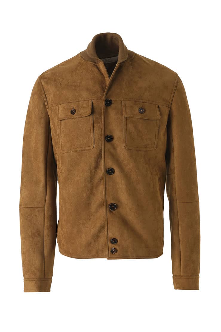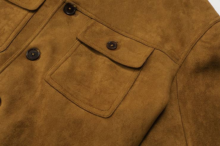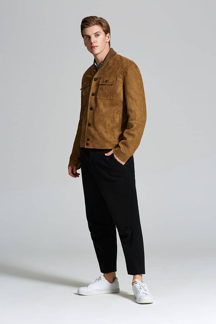 麂皮绒夹克外套,同色罗纹翻领拼接,门襟大树脂纽扣,前幅对称大翻盖口袋,衣身两侧竖插袋,后幅搭配同色的罗纹面料,夹克收腰版型,打造随意街头造型。