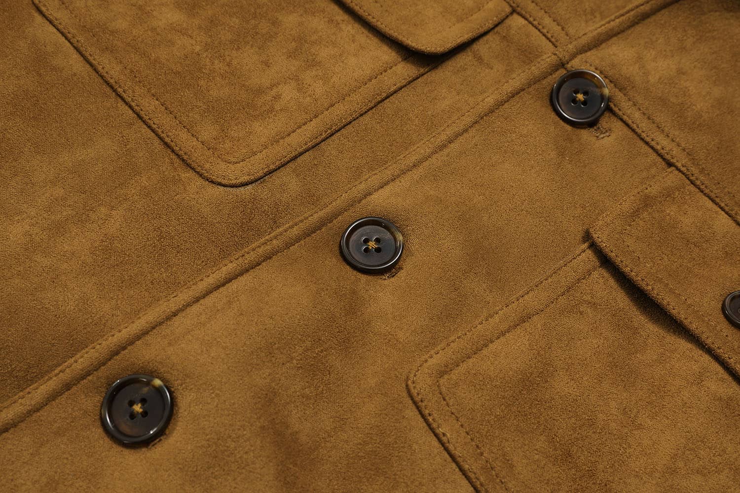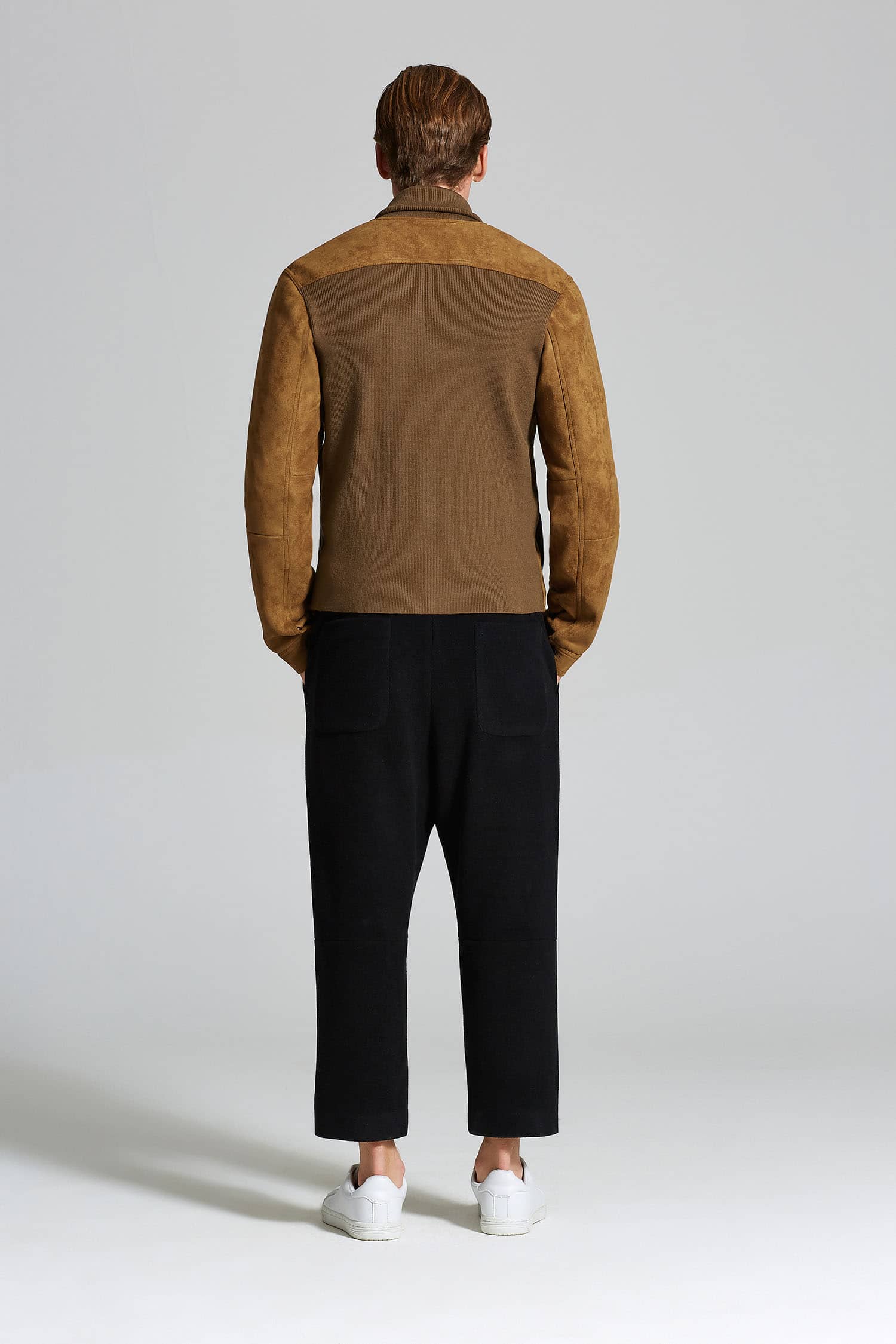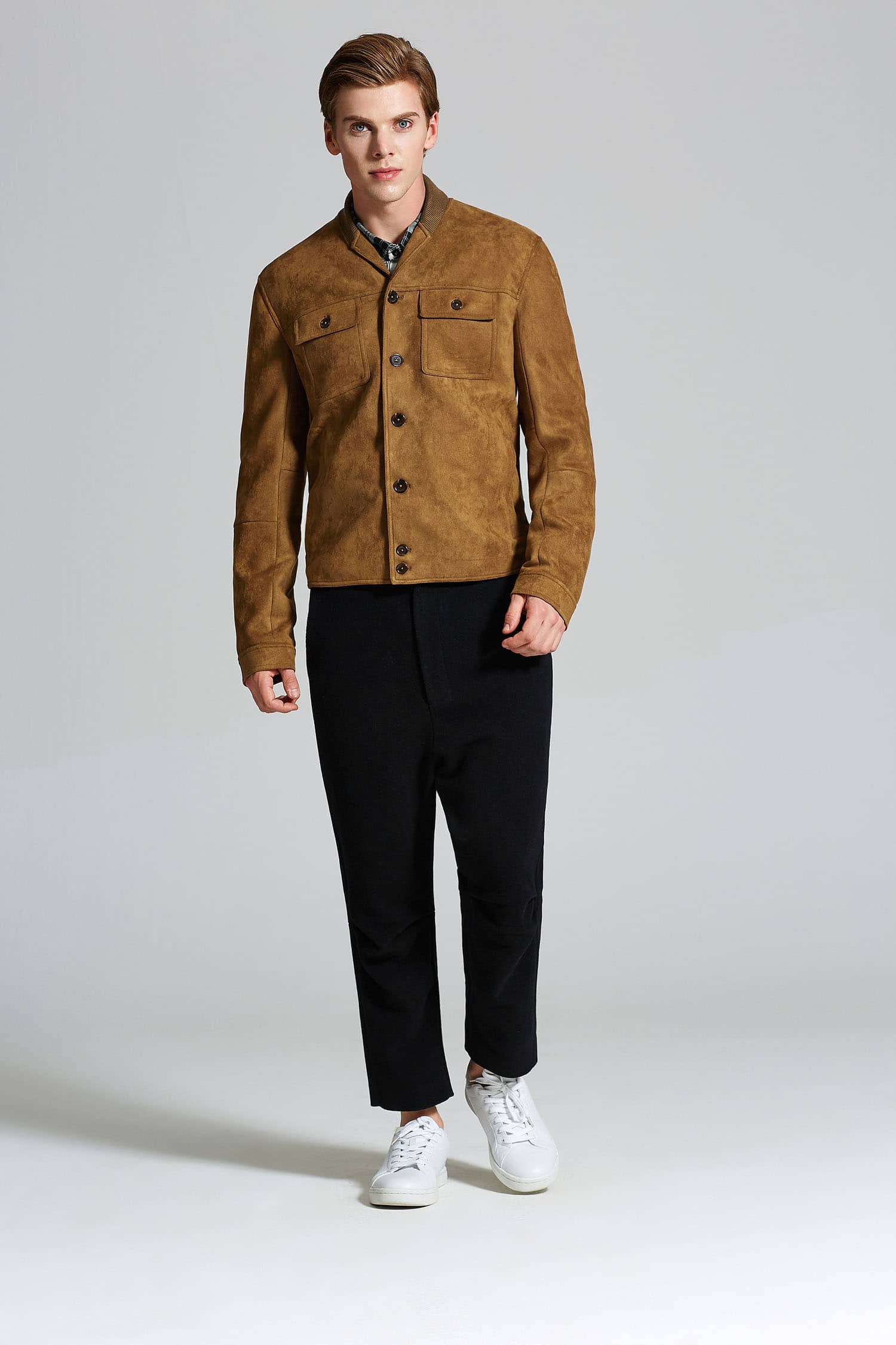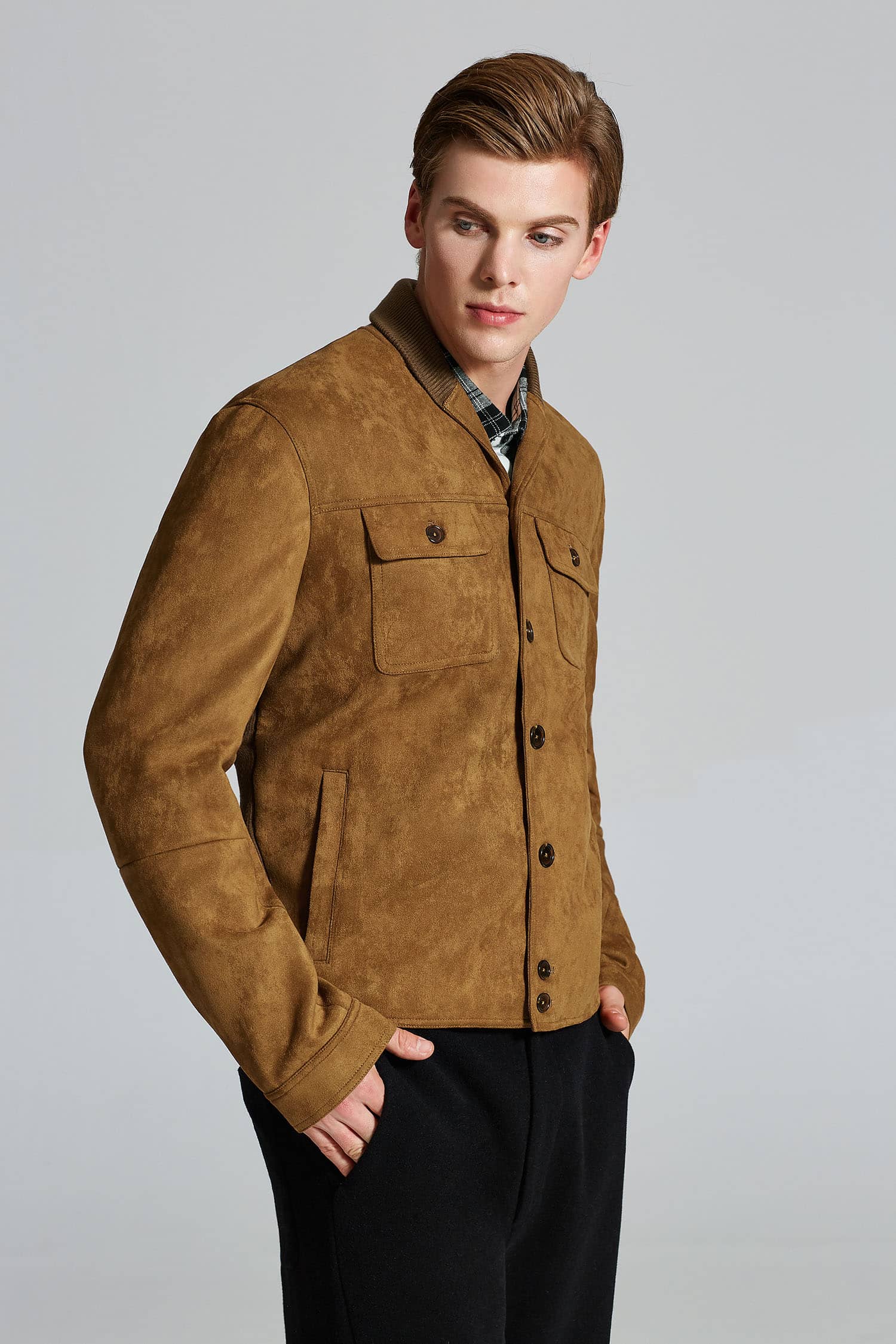 麂皮绒夹克外套,同色罗纹翻领拼接,门襟大树脂纽扣,前幅对称大翻盖口袋,衣身两侧竖插袋,后幅搭配同色的罗纹面料,夹克收腰版型,打造随意街头造型。