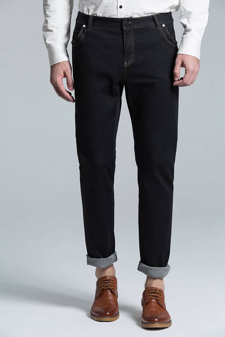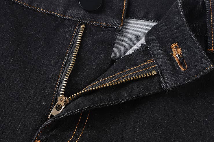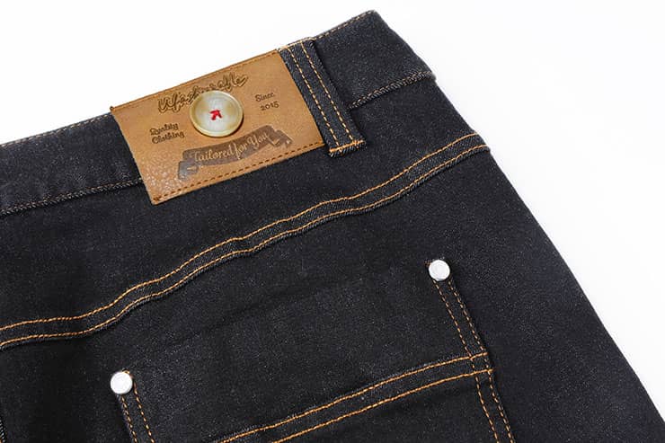 月牙口袋,袋口两端用装饰柳钉套死,金属拉链,开合顺畅;后腰金色复古贴牌,时尚别致;整件采用古铜双线缝纫,工艺结实美观。