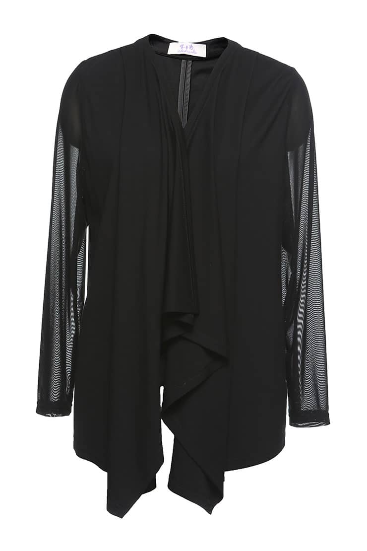 混纺针织面料,触感温润细腻,针织小开衫,前片大面积垂落,呈现不规则的下摆,袖子拼接氨纶面料,具有极好的回弹性,修饰手臂赘肉,款式简单易搭配。