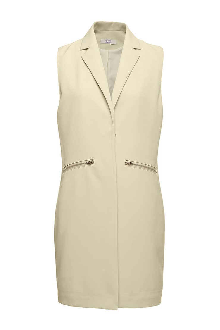 采用高档的斜纹乱麻面料,触摸柔滑吸湿透气,茧型马夹西装领款式,大身装饰实用拉链,简洁穿搭之中打造时髦感。