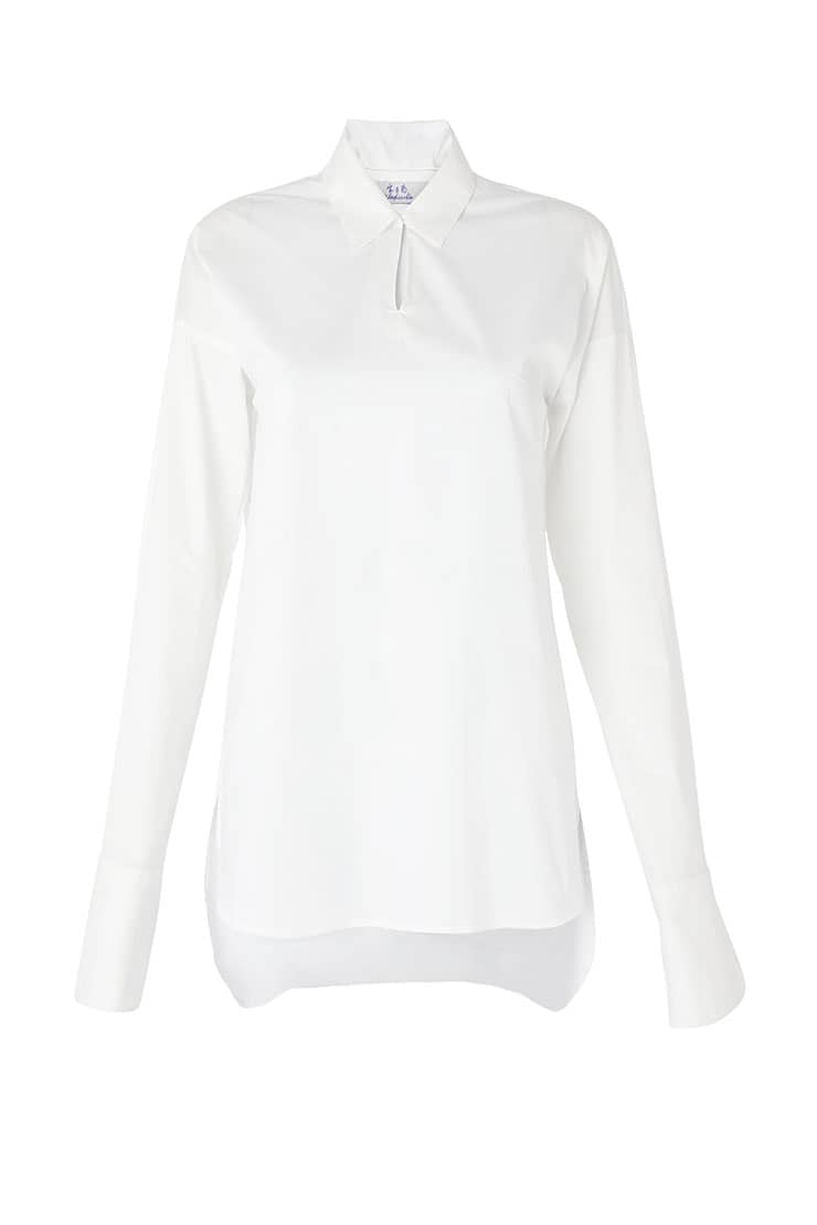 小圆领,暗门襟,宽袖头落肩长袖,前幅落肩搭片,后幅搭片伸展覆盖肩袖,落差弧形下摆;合身宽松廓形,棉质衬衫面料,舒适时尚。