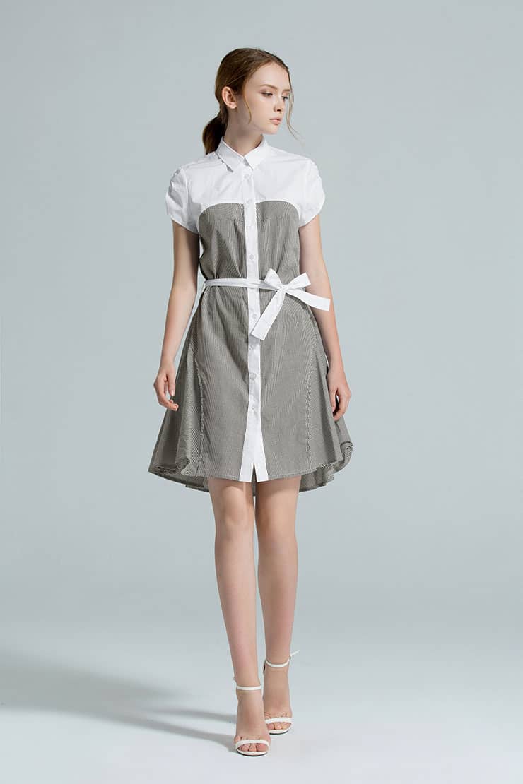 翻领衬衣款连衣裙,泡泡短袖,宽松腰围,大A摆裙,腰间有绑带装饰,细格仔与白色拼接,呈现出文静的书香气息,采用优质的棉纤维,质地柔软舒适亲肤。