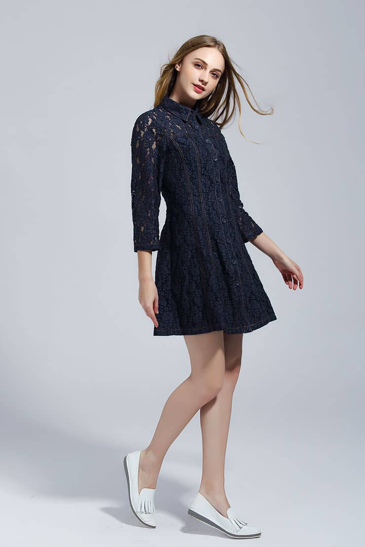 镂空蕾丝连衣裙,经典的衬衣领,前中开门襟多扣设计,多片分割剪裁,收腰省展下摆,加上肩部与手袖的镂空设计,更符合女性的性感修身理念。