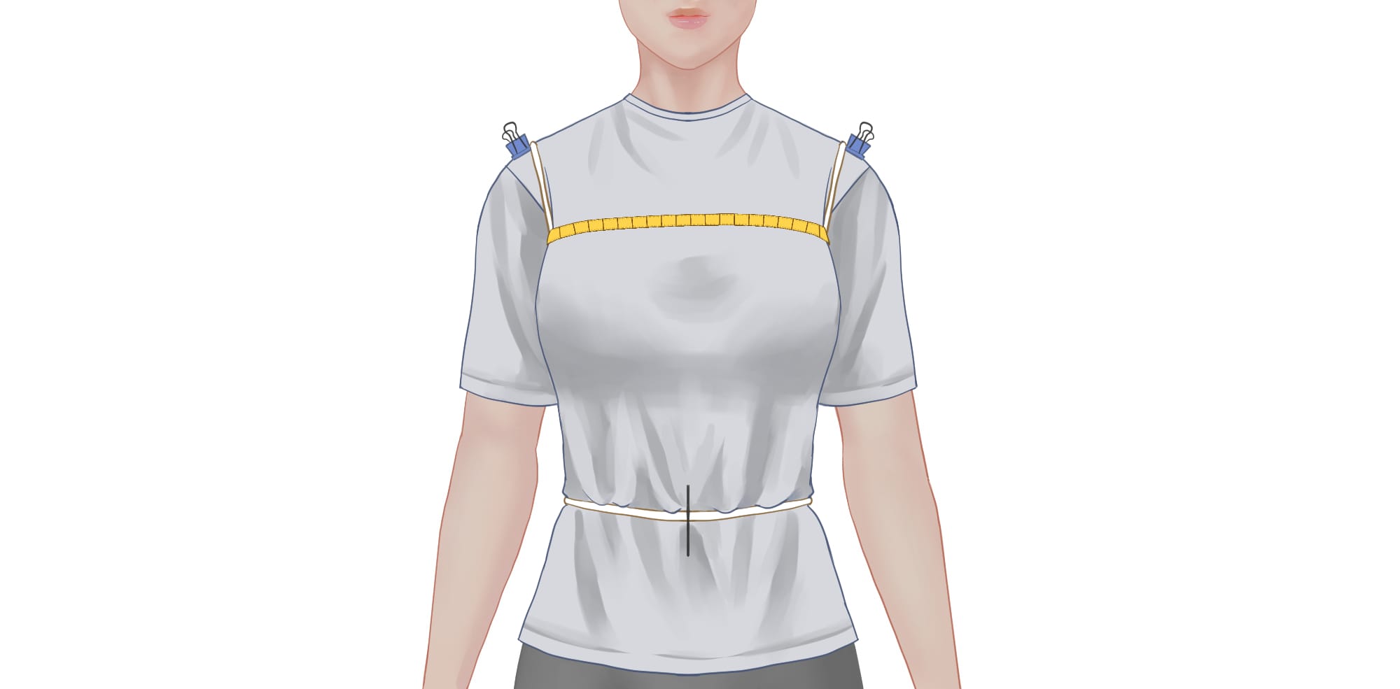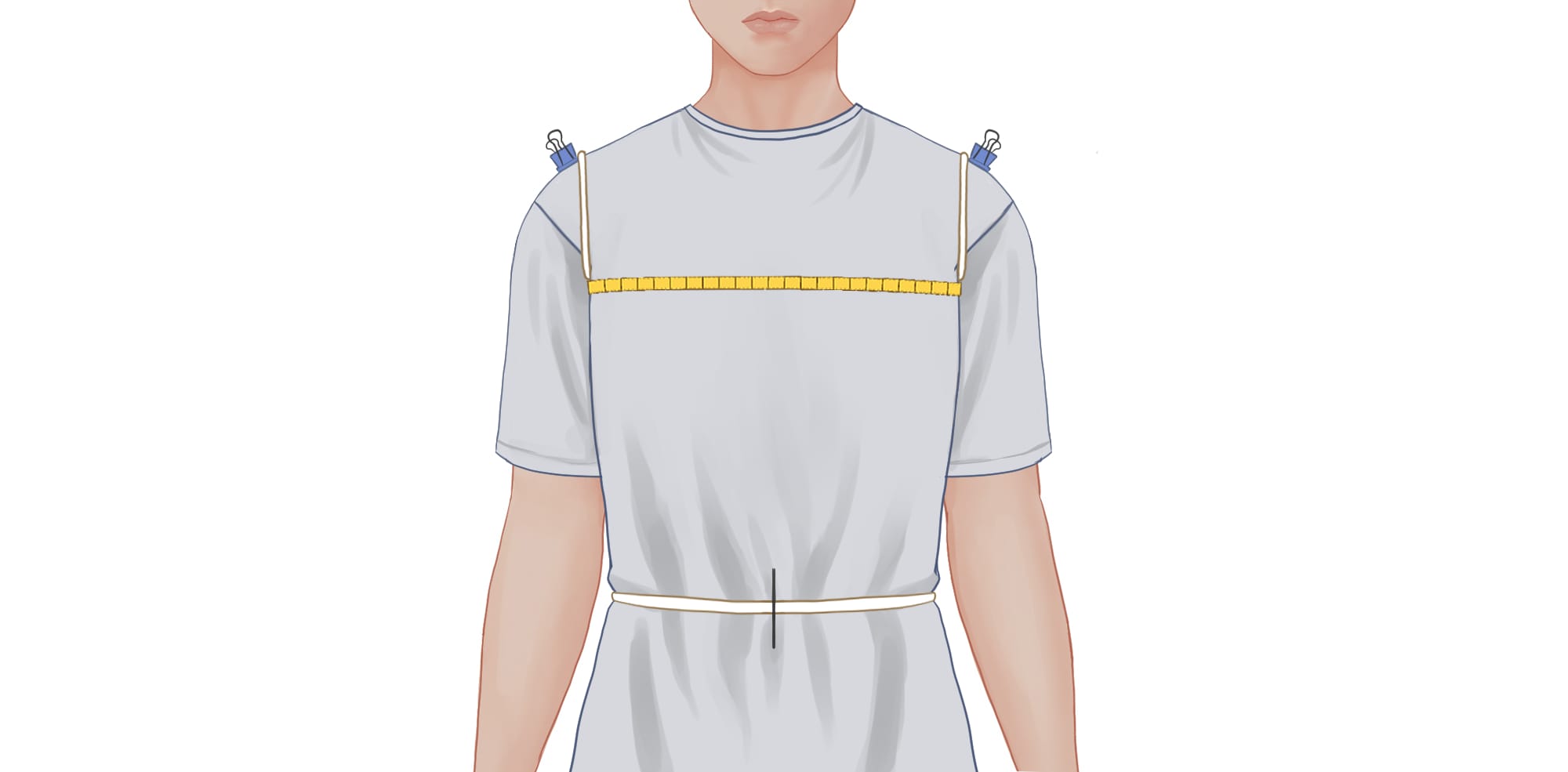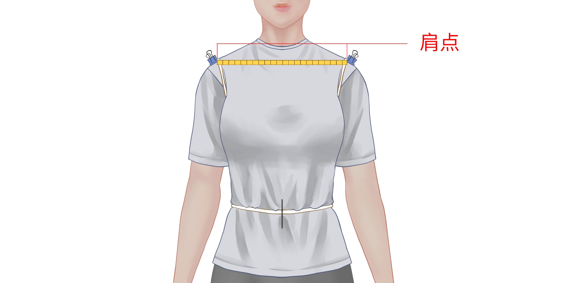 - 使用两个19毫米宽的长尾夹,分别夹在左右肩头中位靠松紧带外侧,以靠近颈部的长尾夹端头位置标记为肩点。