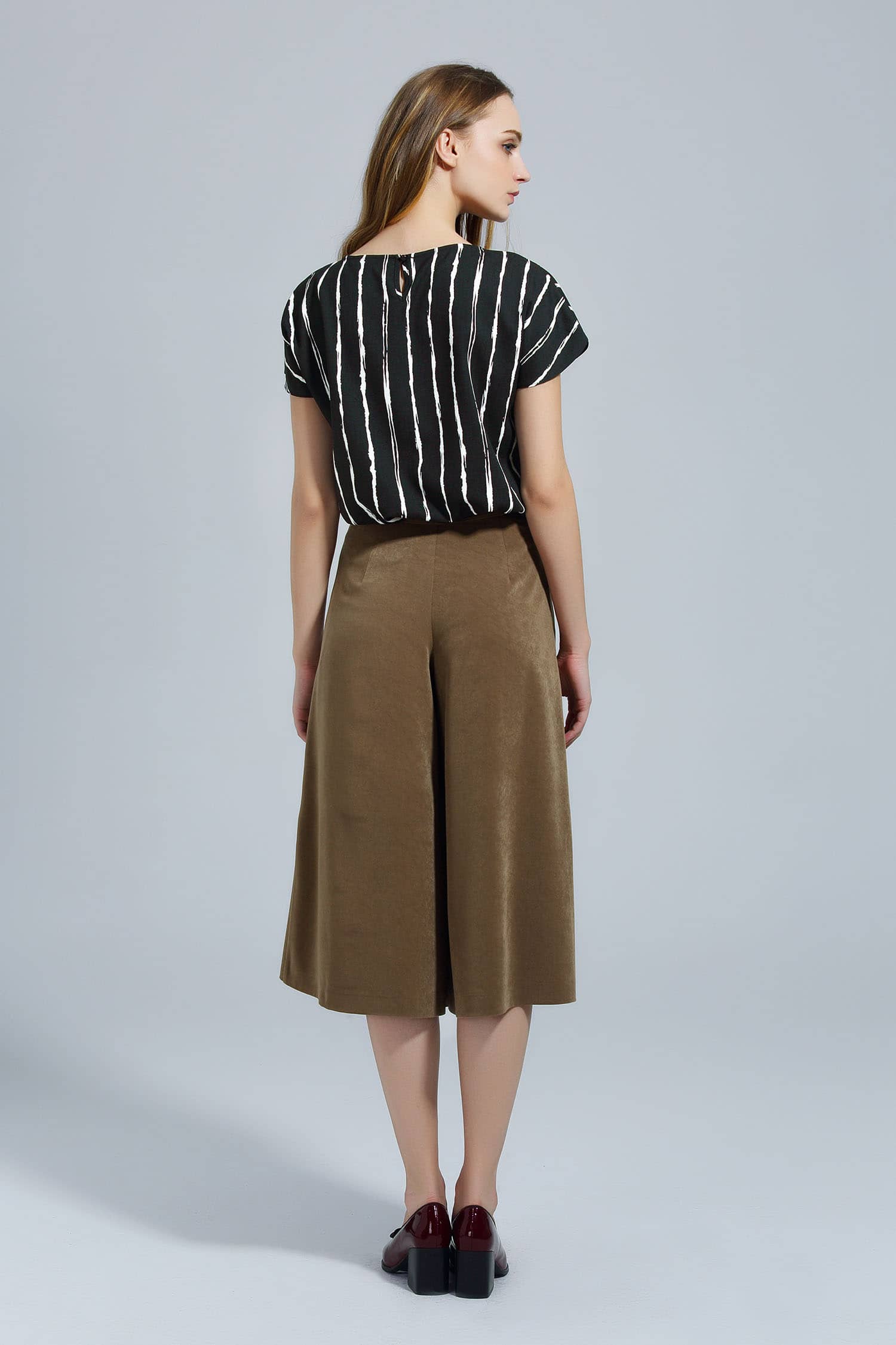 合体中腰,拉链门襟,侧边单唇竖插袋,合体七分阔腿裤廓形,可与西装外套T恤衬衫穿搭。