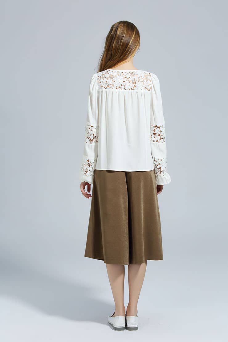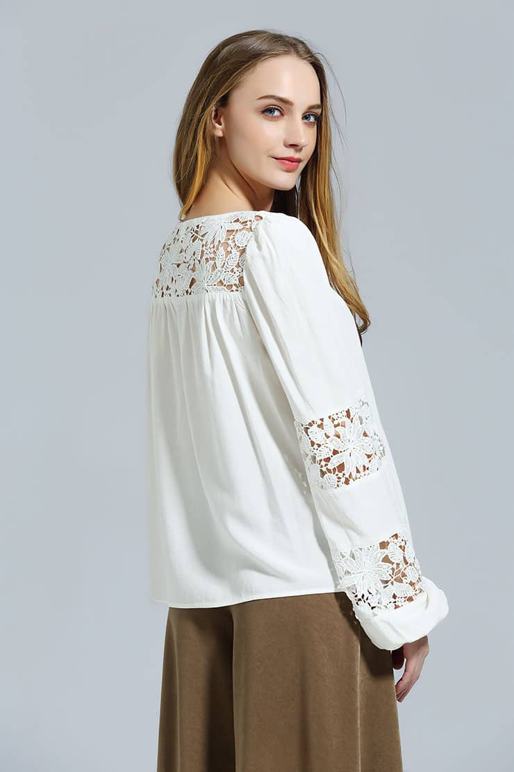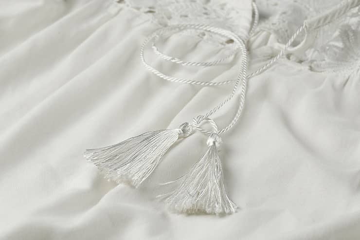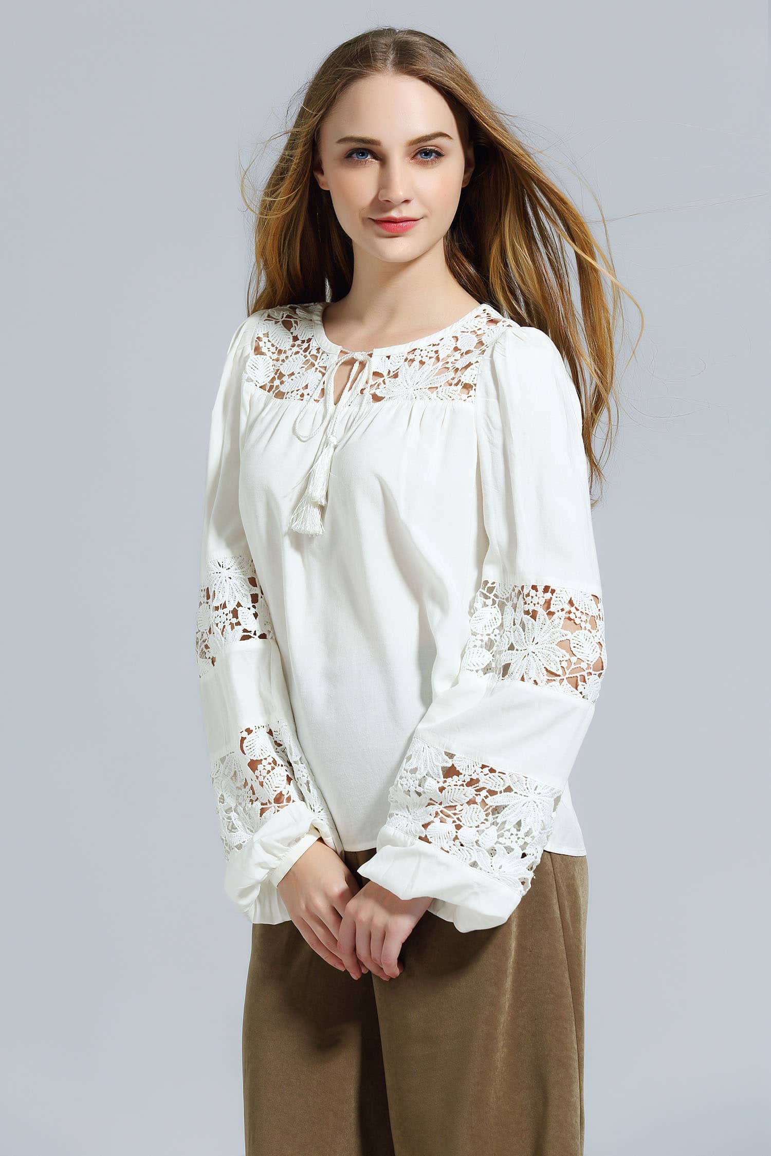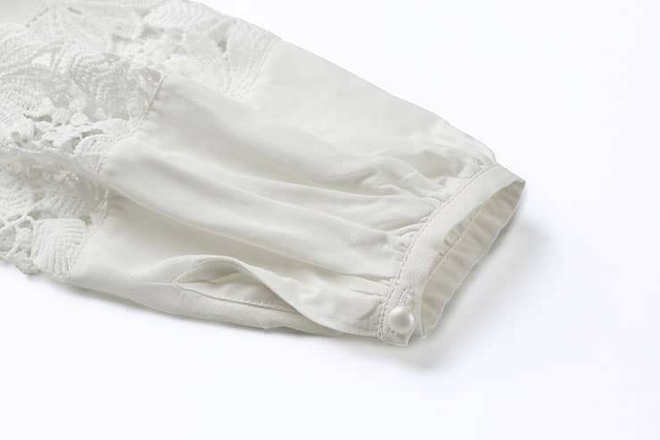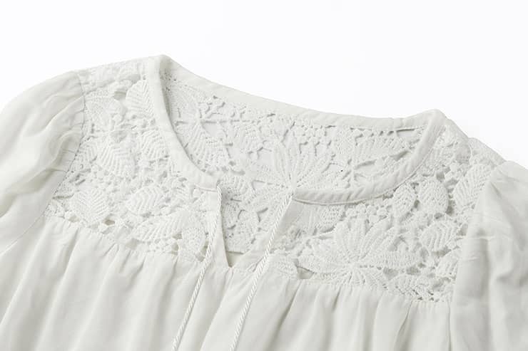 优质的人棉,镂空蕾丝拼接,圆领内穿绳系带设计,衣身及袖口大量抽碎褶,带来强烈的视觉层次感,清新可爱,优雅精致。