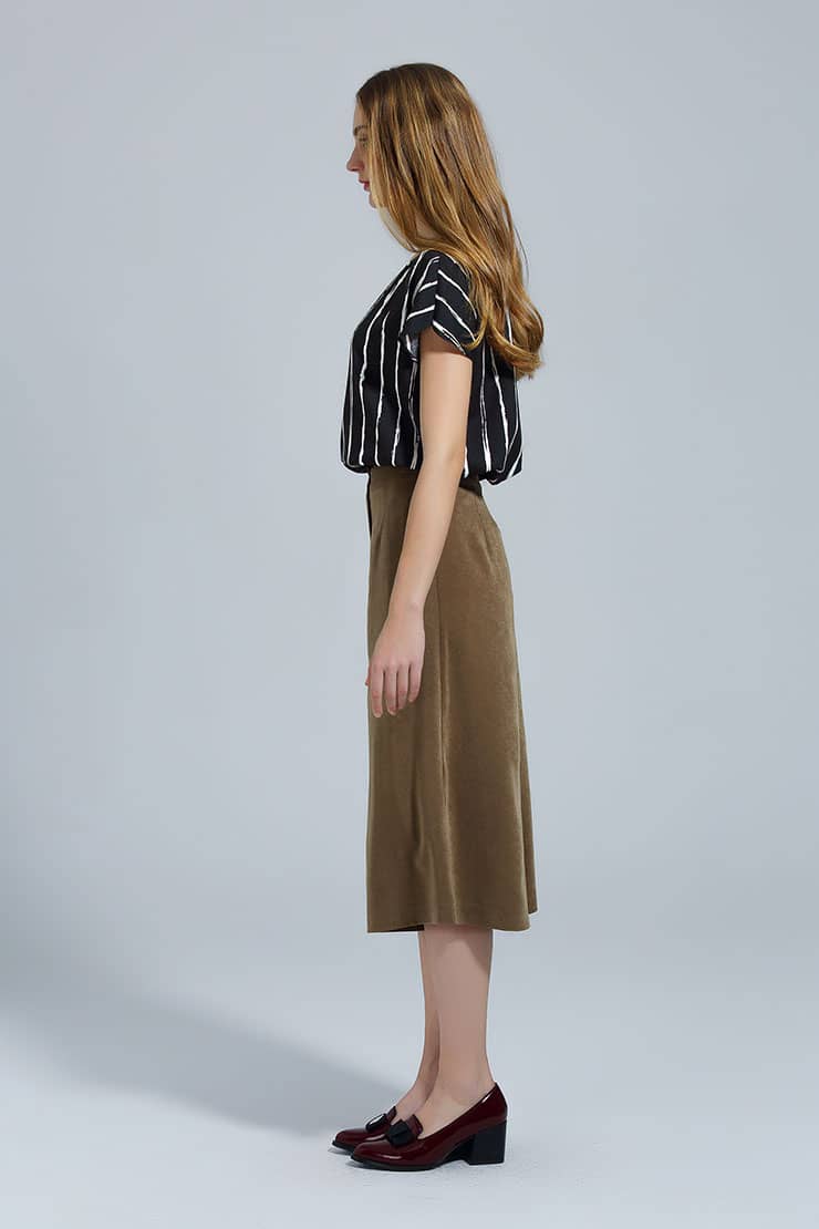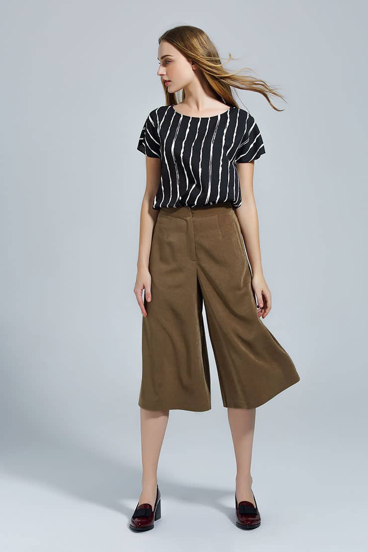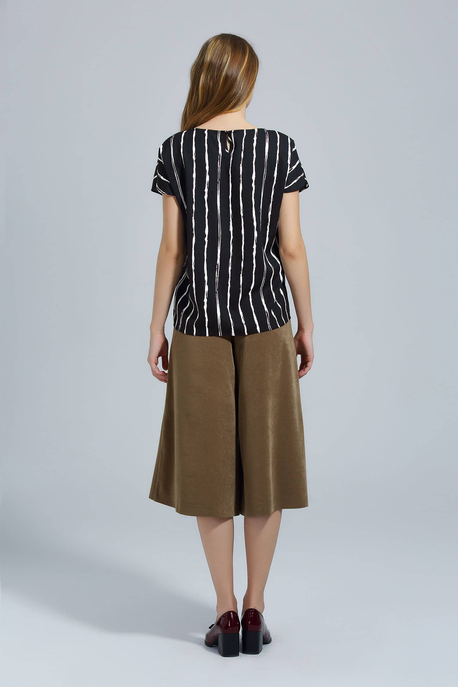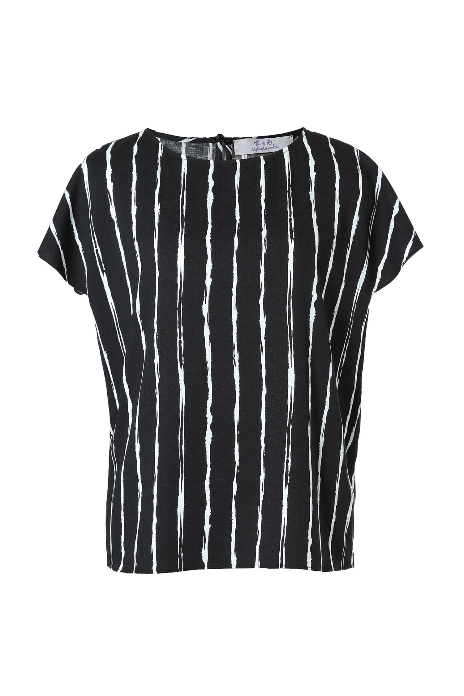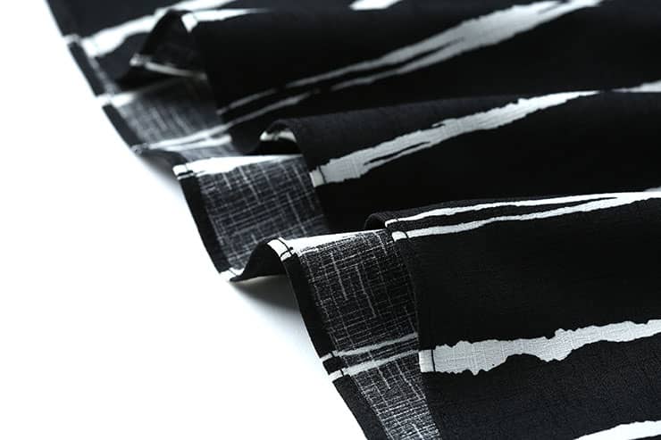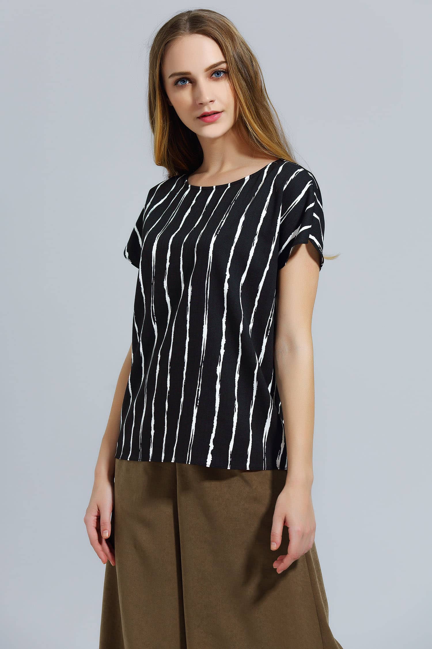 竖条纹印花面料,质感柔滑细腻,更舒适透气,搭配圆领落肩款式,修饰臂形,结构简单,时尚百搭。