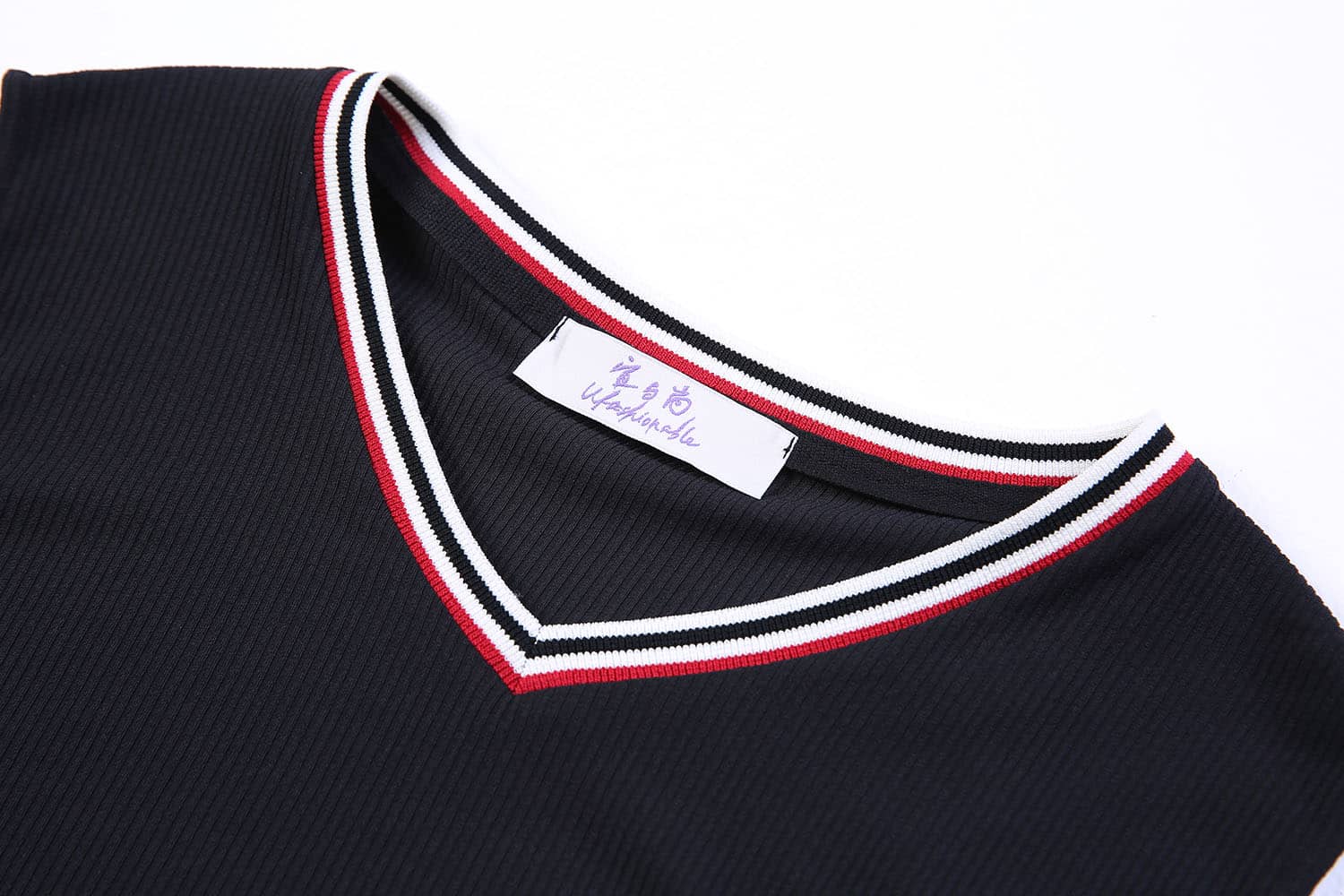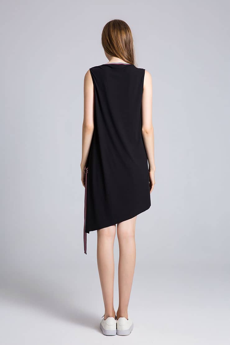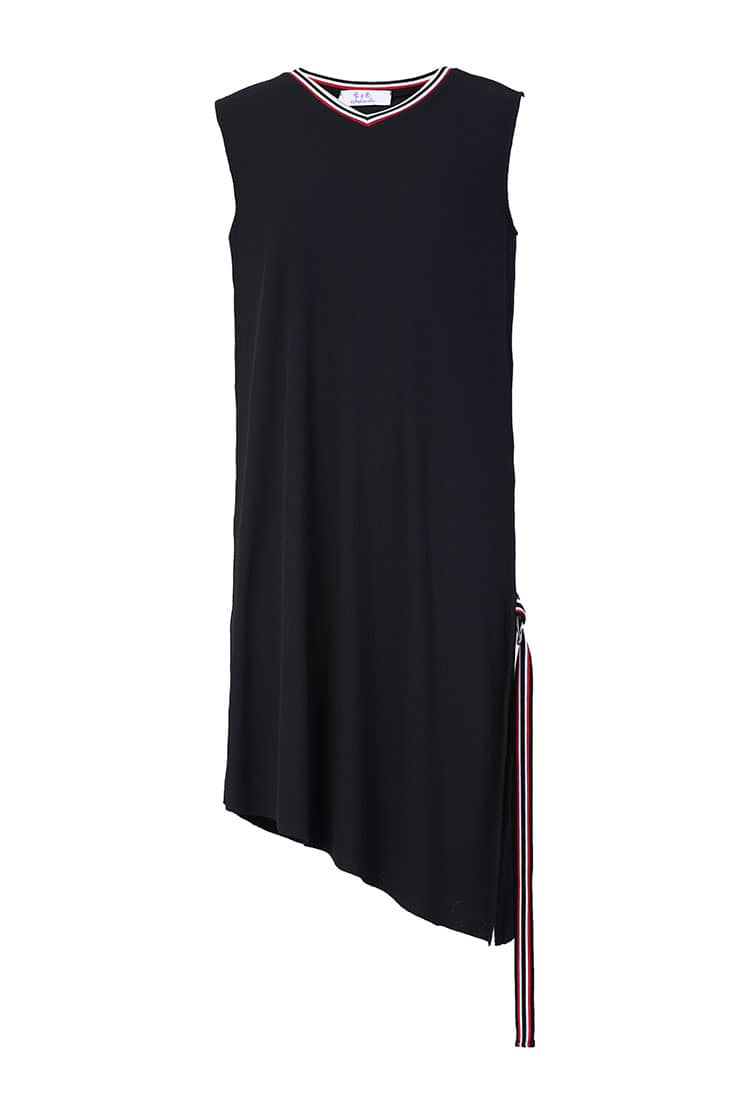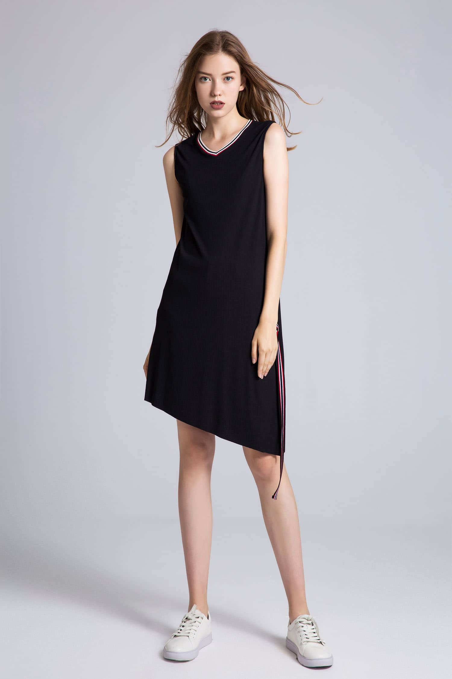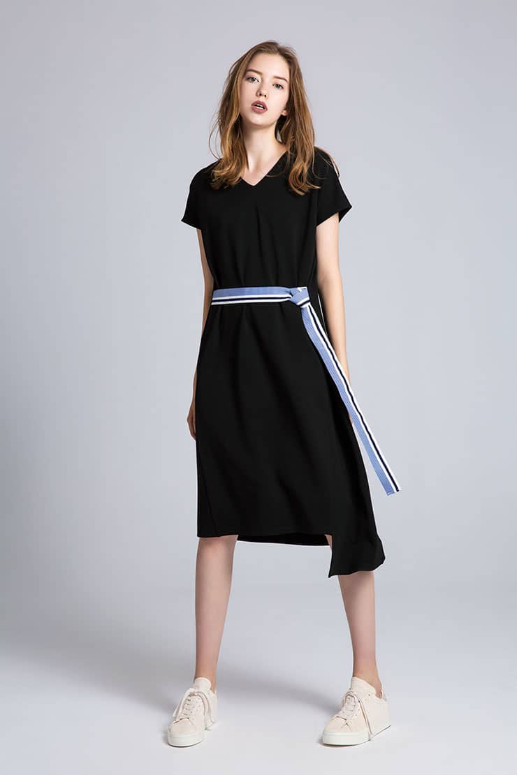 V领短袖连衣裙,腰间撞色织带点缀,更好的修饰腰线;宽松版型,不规则下摆,胖瘦均可驾驭!