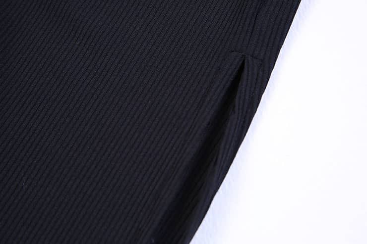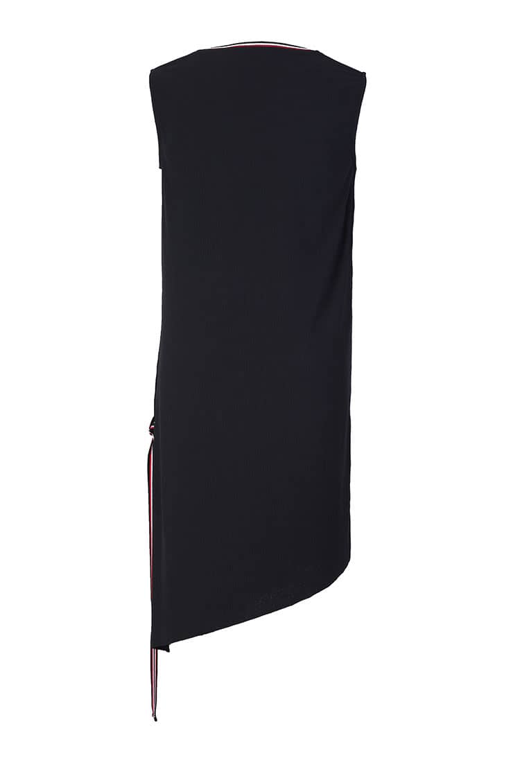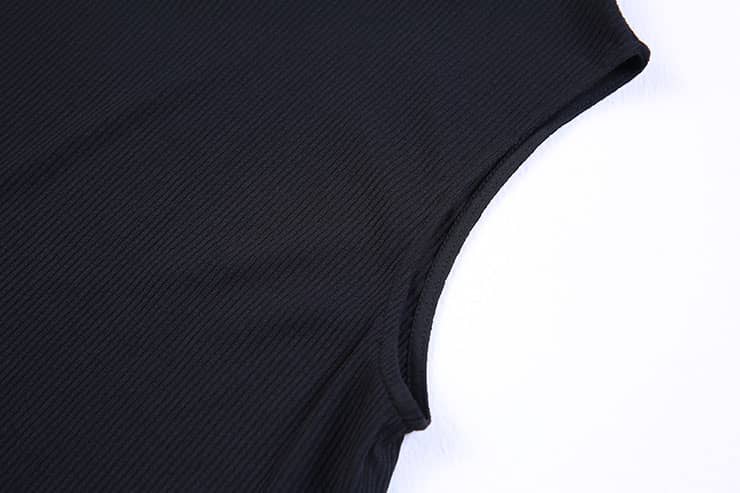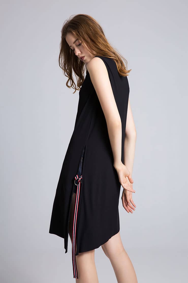 V领,无袖,肩部稍许落肩长出,腰部碎褶处理,左腰单侧结合绑带,造型感十足,甄选优制的梭织乱麻面料,布面肌理感强,手感干涩且颇具垂感。