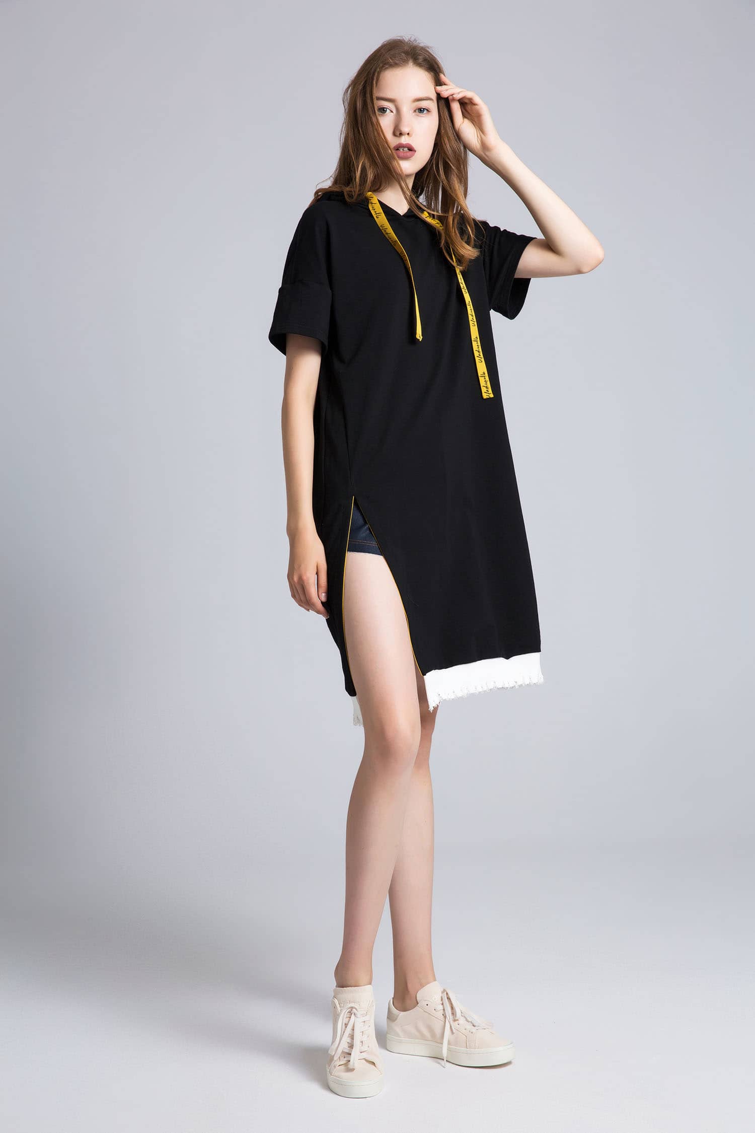 弹力牛仔短裤,低腰A型版型,拉链纽扣门襟,翻边裤脚。