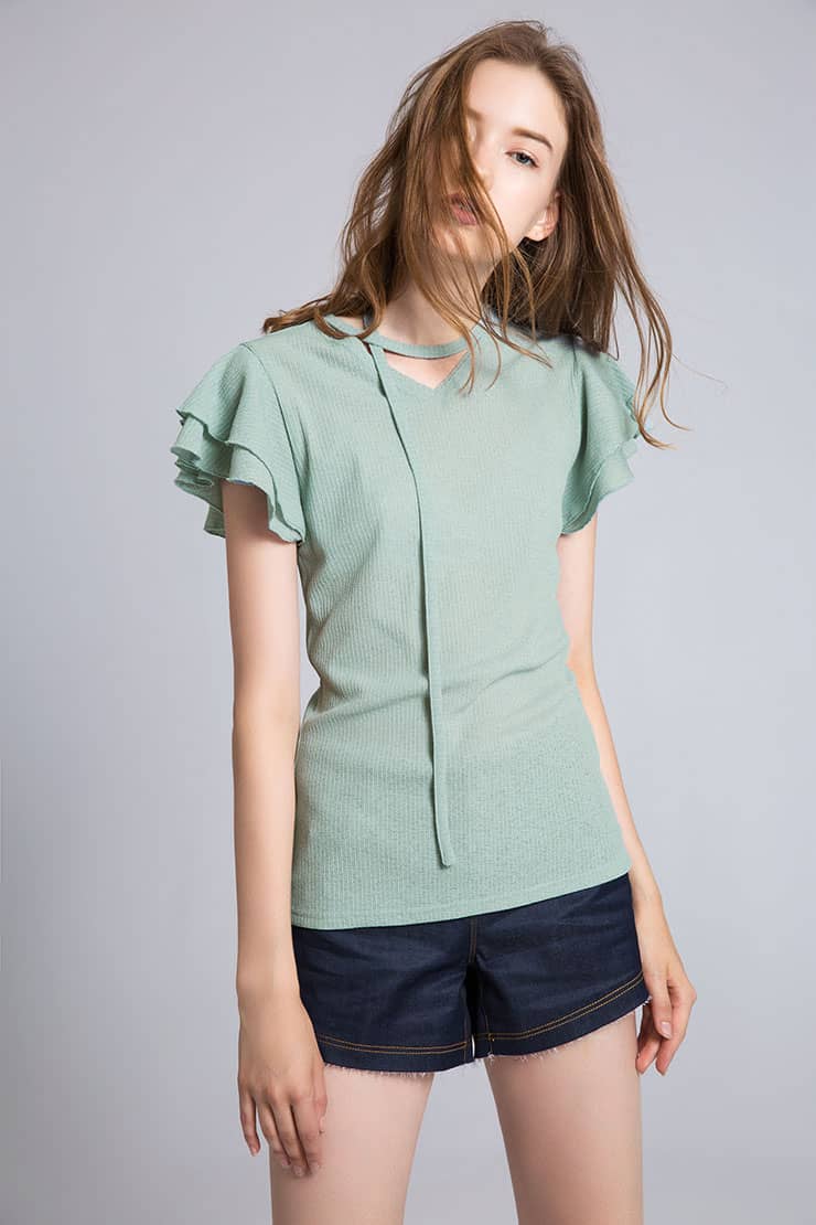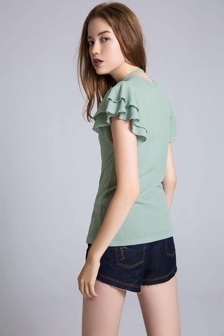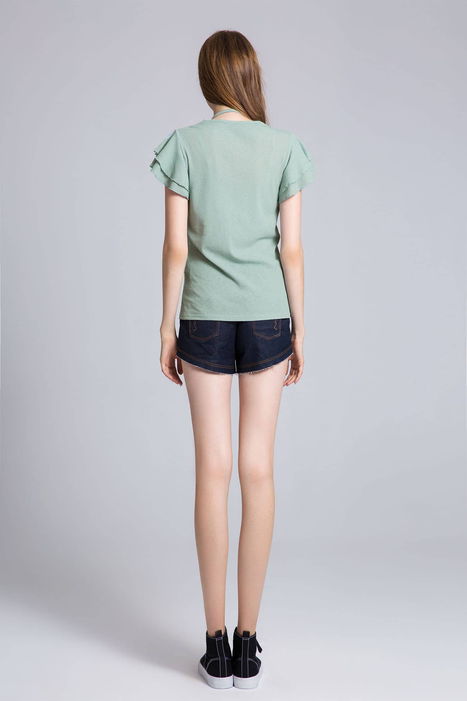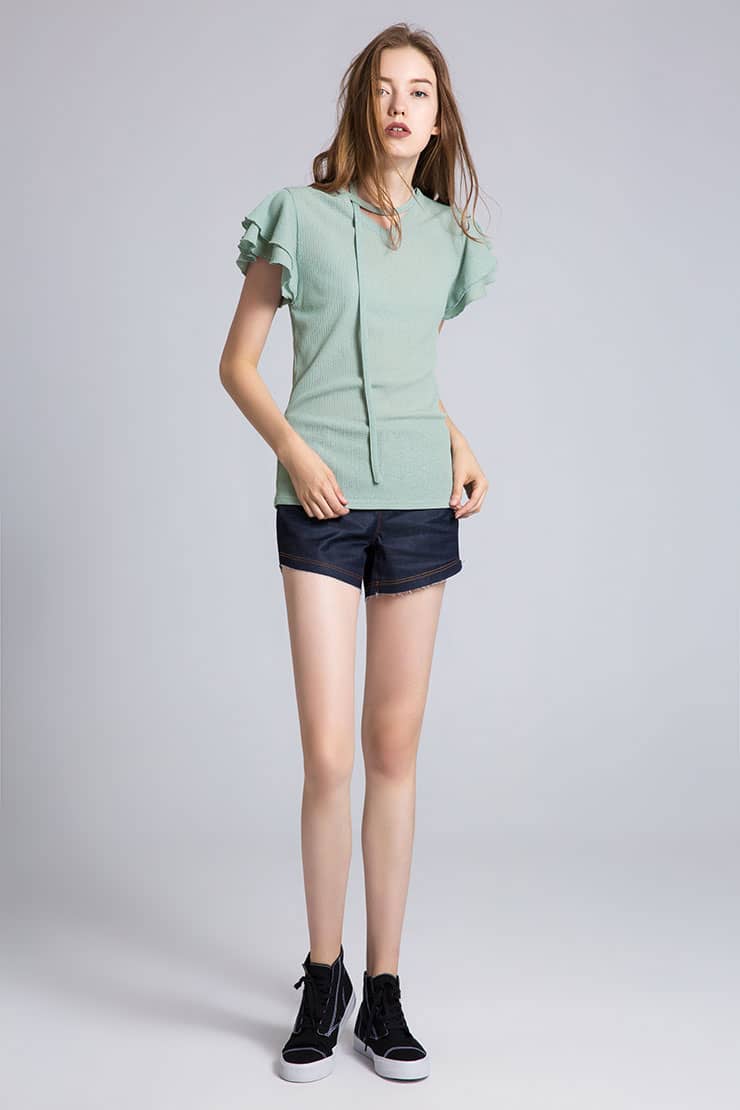 弹力牛仔短裤,低腰A型版型,拉链纽扣门襟,翻边裤脚。