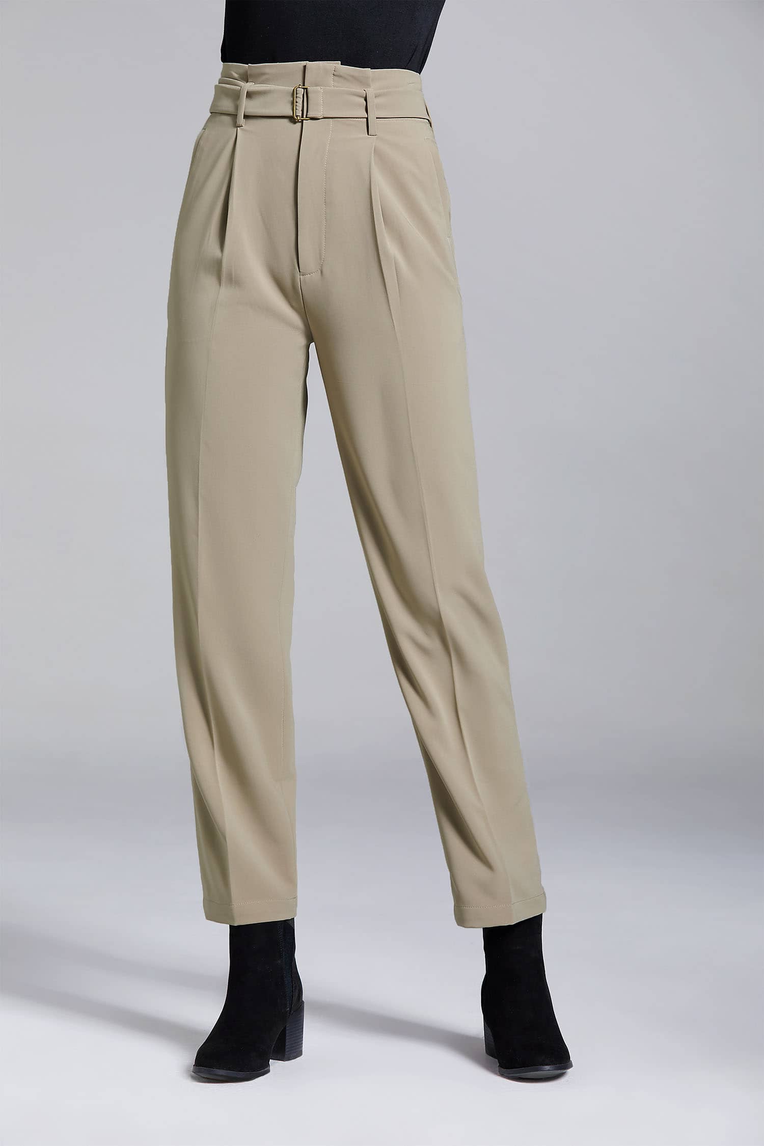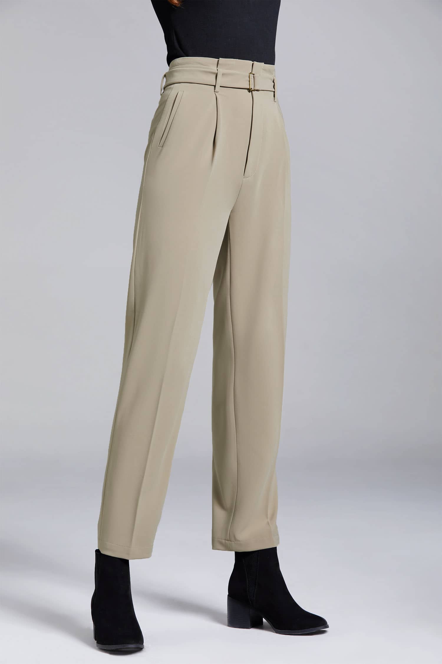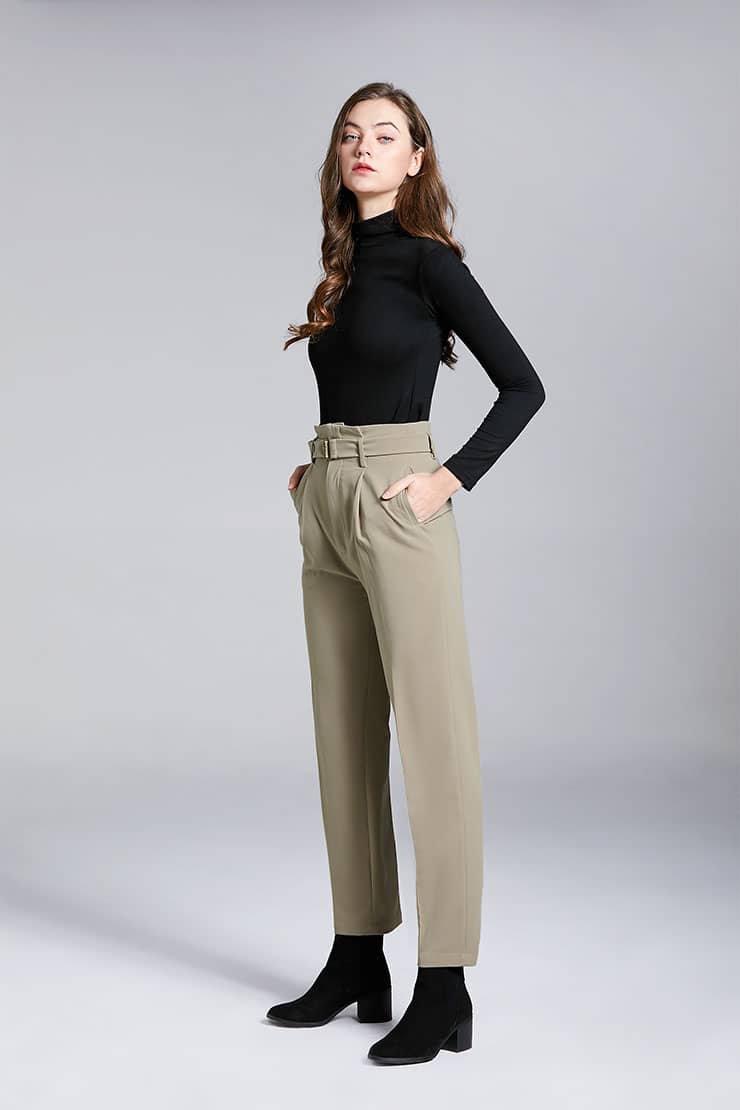 单裥褶高连腰,前开襟,两侧设有手插袋,同色系腰带装饰;九分裤长,合体锥形廓形,立体显瘦,时尚雅致;梭织面料,布面肌理感强,耐穿易打理。