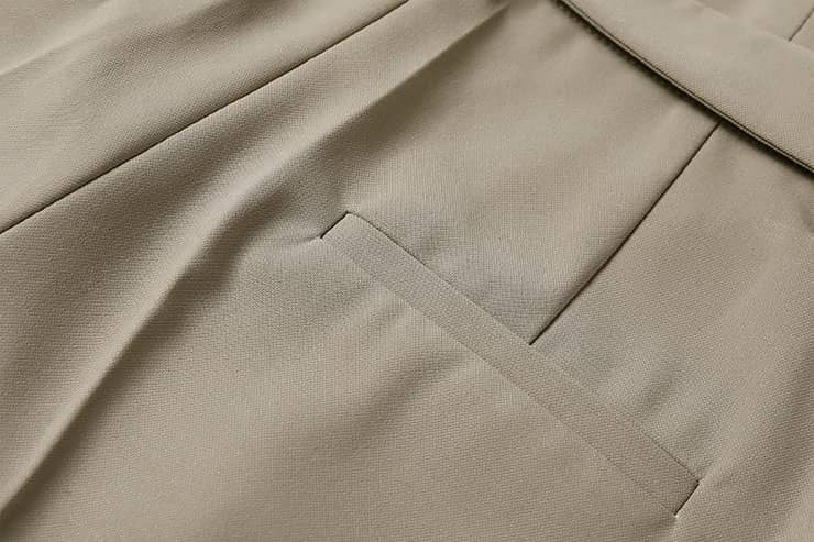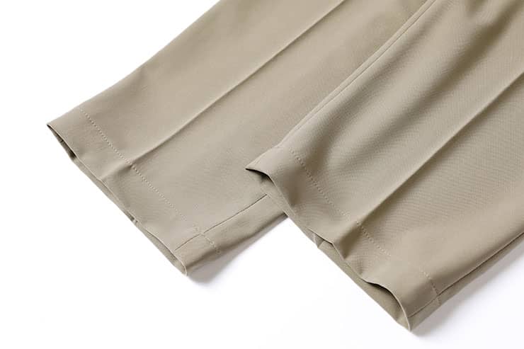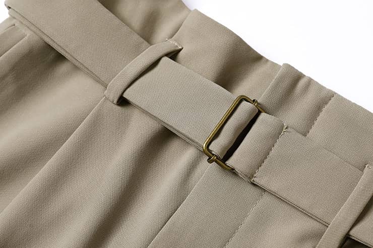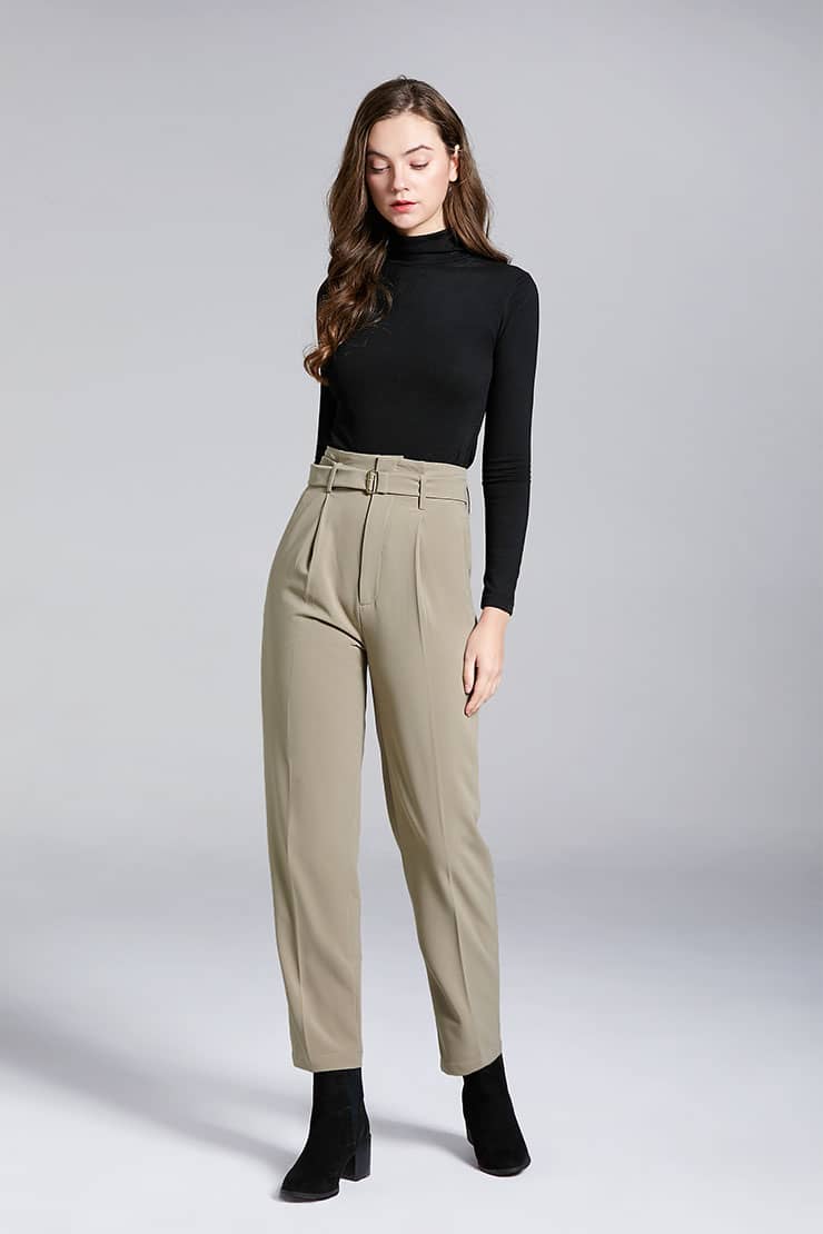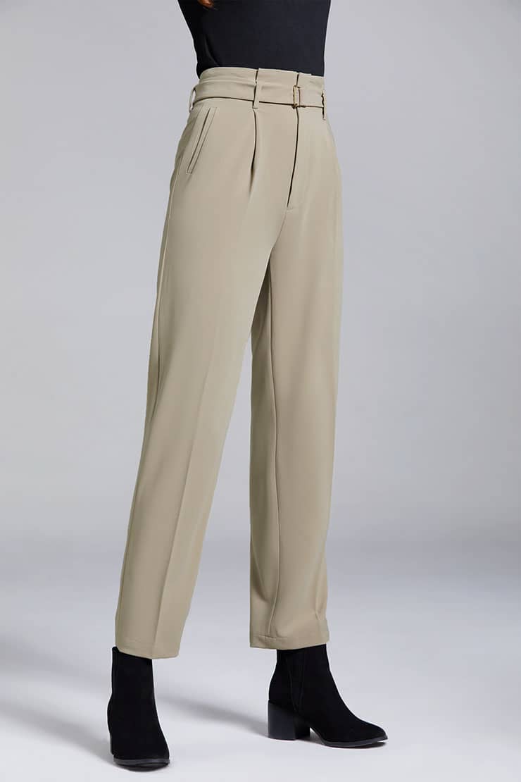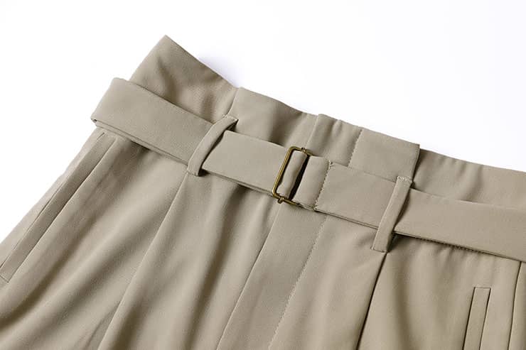 单裥褶高连腰,前开襟,两侧设有手插袋,同色系腰带装饰;九分裤长,合体锥形廓形,立体显瘦,时尚雅致;梭织面料,布面肌理感强,耐穿易打理。