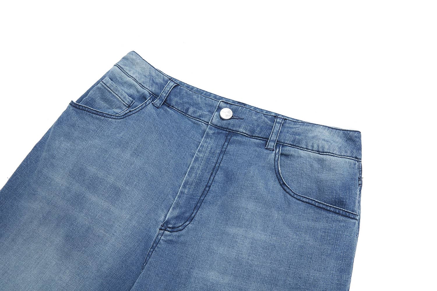 简约贴体腰头,侧边月牙插袋,前中质感金属扣拉链门襟,后幅盾型口袋装饰;过脚裤长,合身阔腿喇叭廓形,修饰拉长腿部线条;裤身加入立体猫须,做旧洗水,令牛仔更具个性,质感松软穿