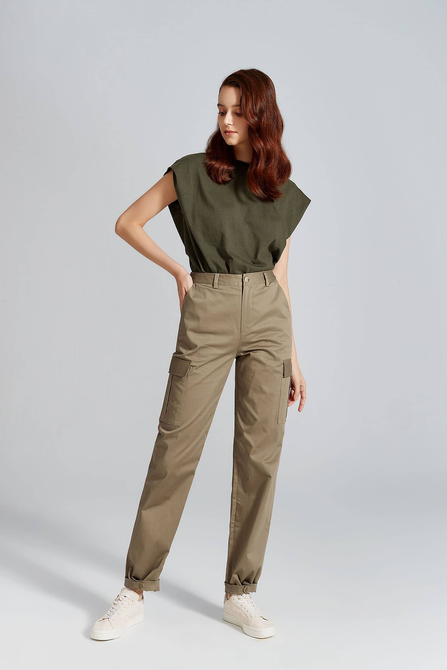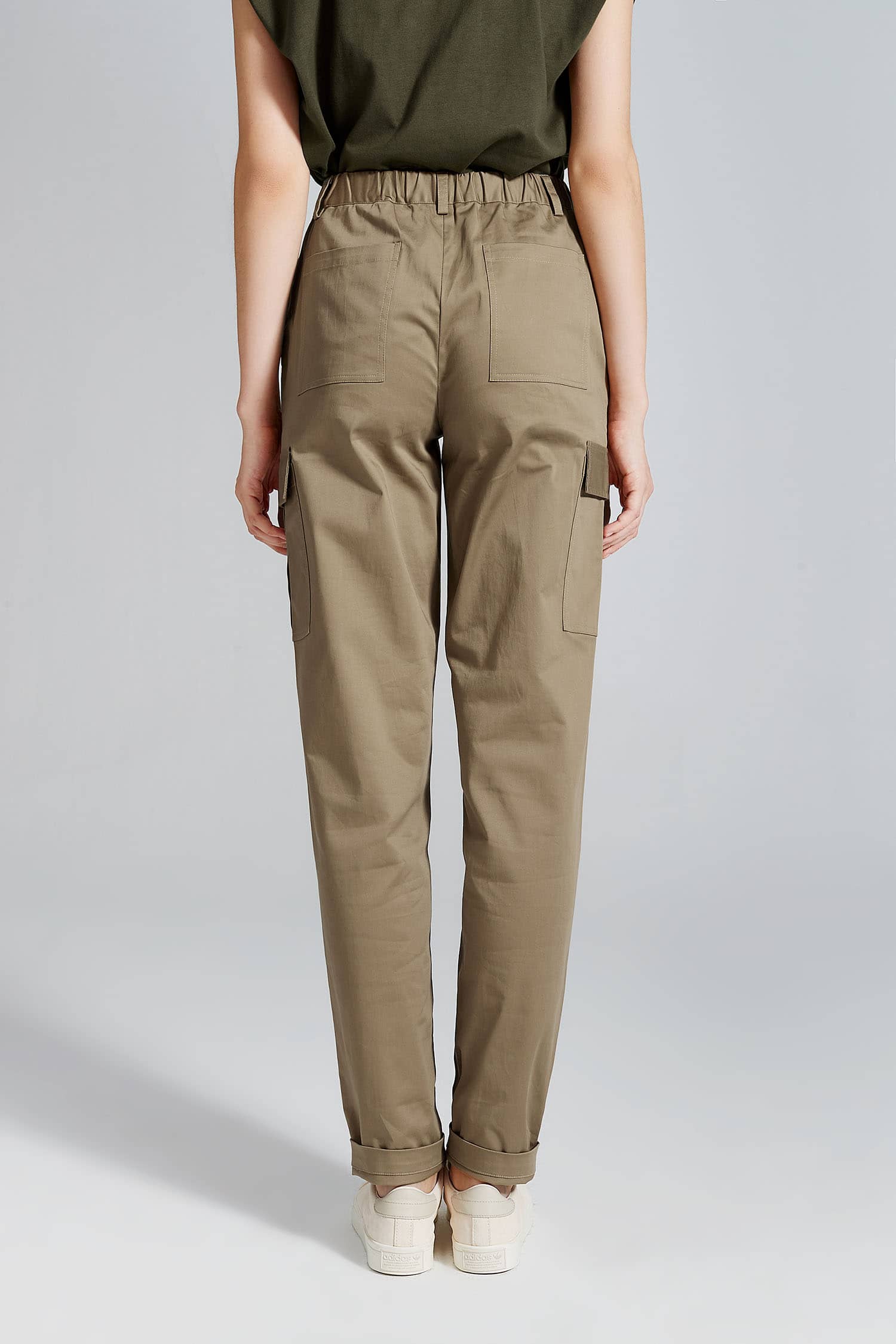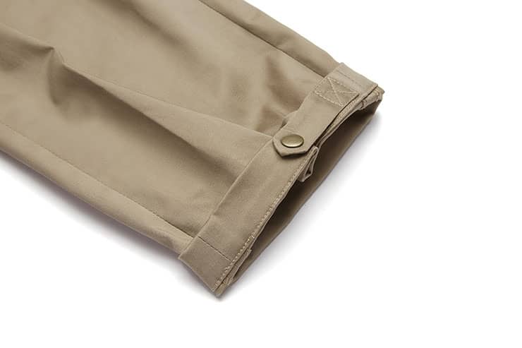 松紧调节贴体腰头,侧边斜插袋,前中纽扣拉链门襟,后幅方形贴袋,腿侧工装风翻盖大贴袋;四合扣收拢裤脚,可开合转换多种造型;过踝裤长,合体锥形廓形,时尚帅性;梭织混纺面料,手