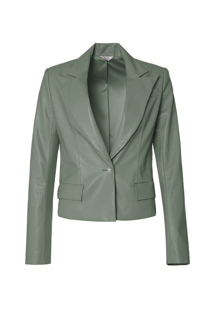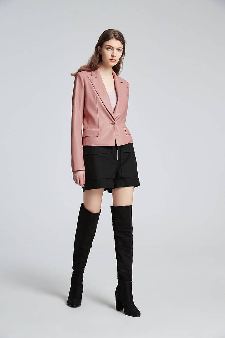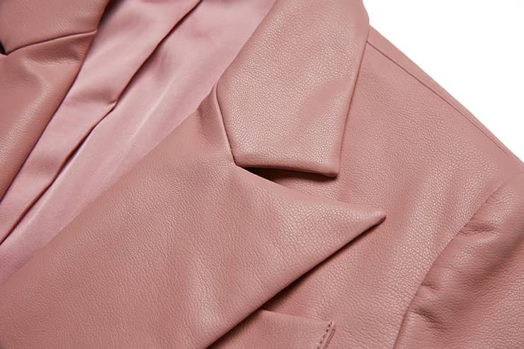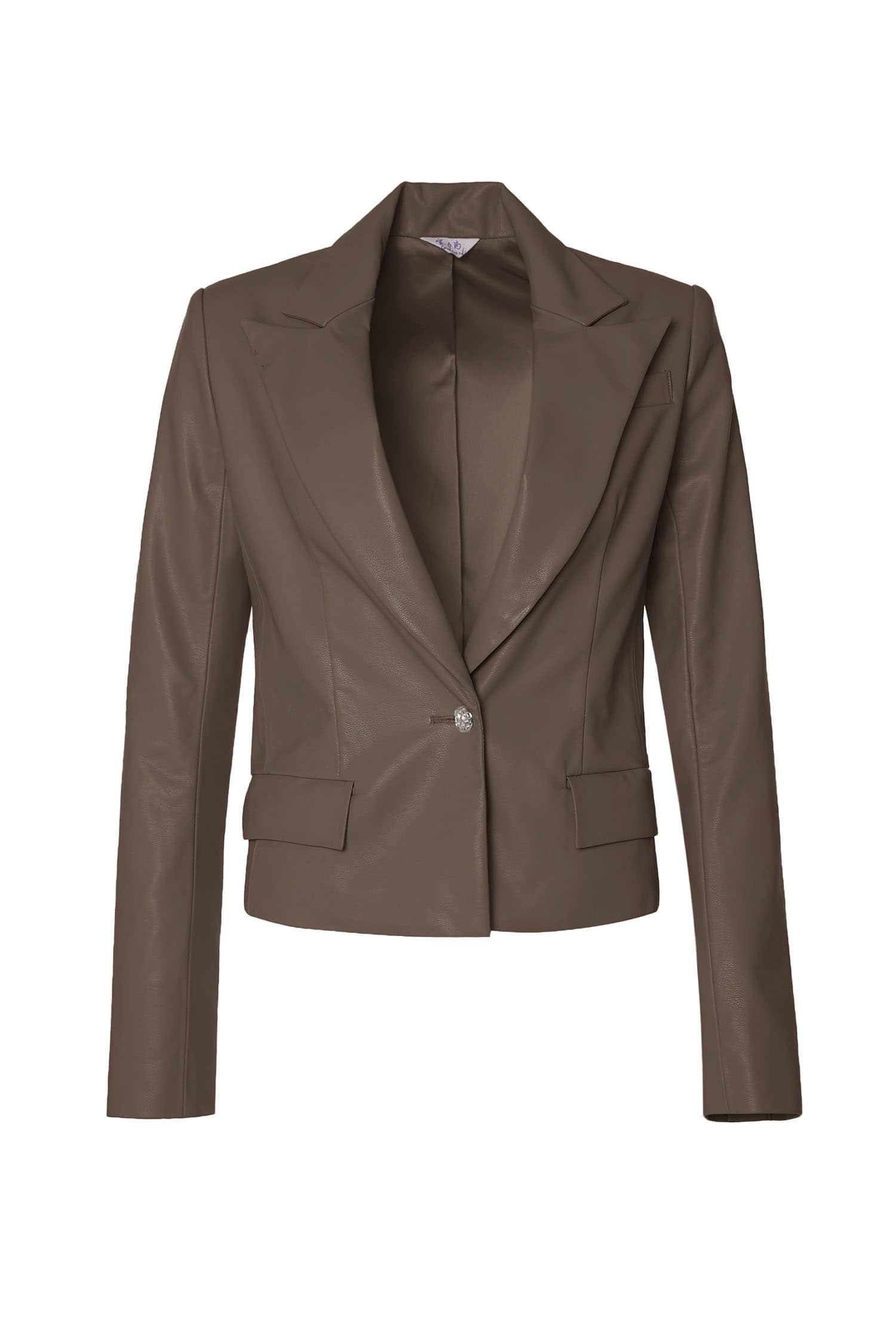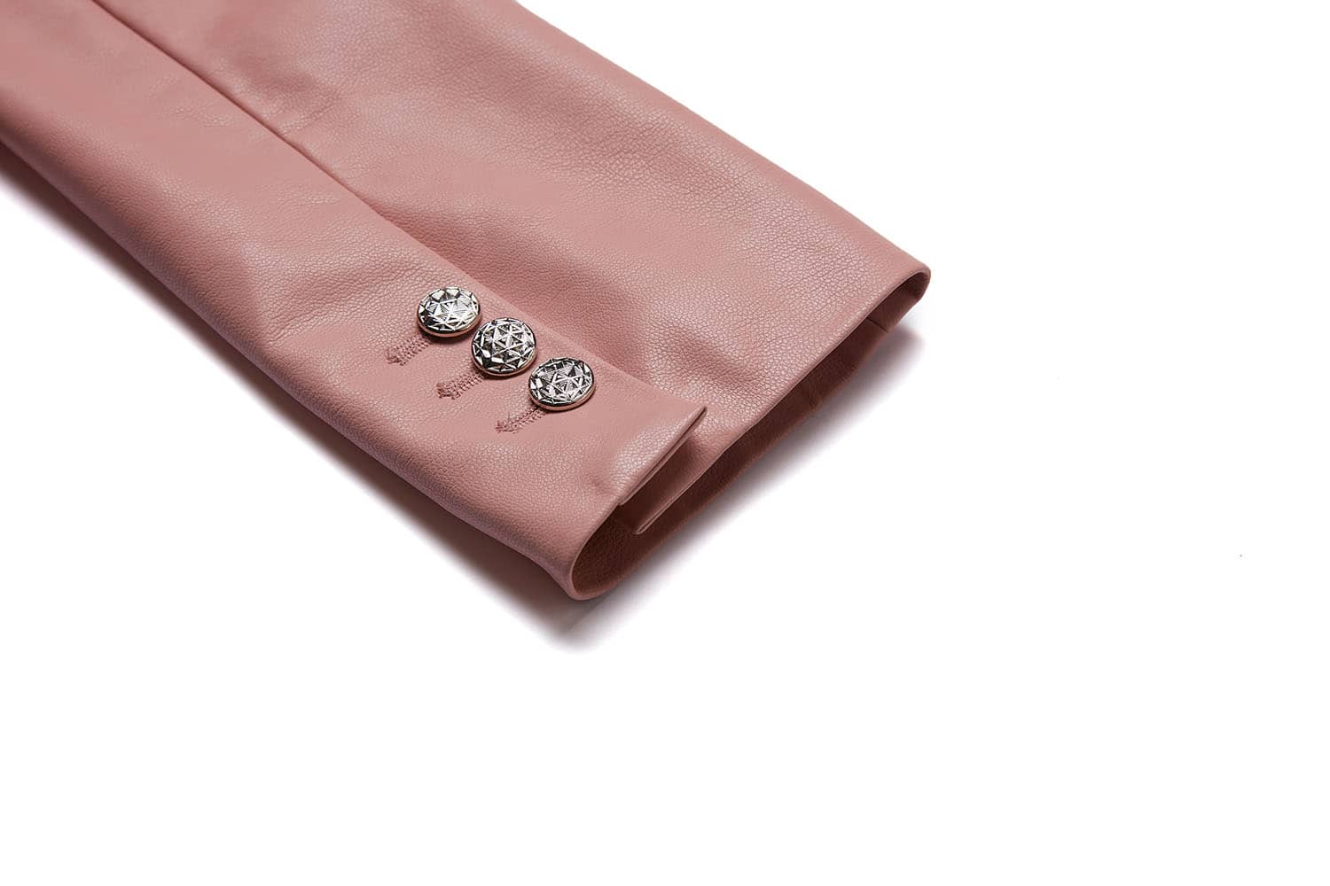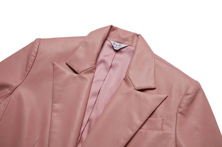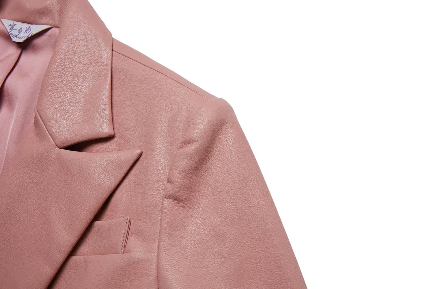 戗驳领,内置垫肩,一字口袋,西装长袖,门襟雕花金扣点缀;利落短款版型,细腻的荔枝纹皮面,低调奢华。