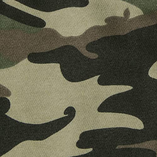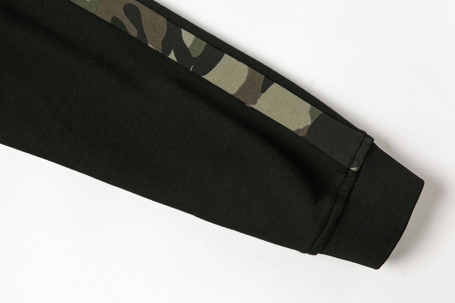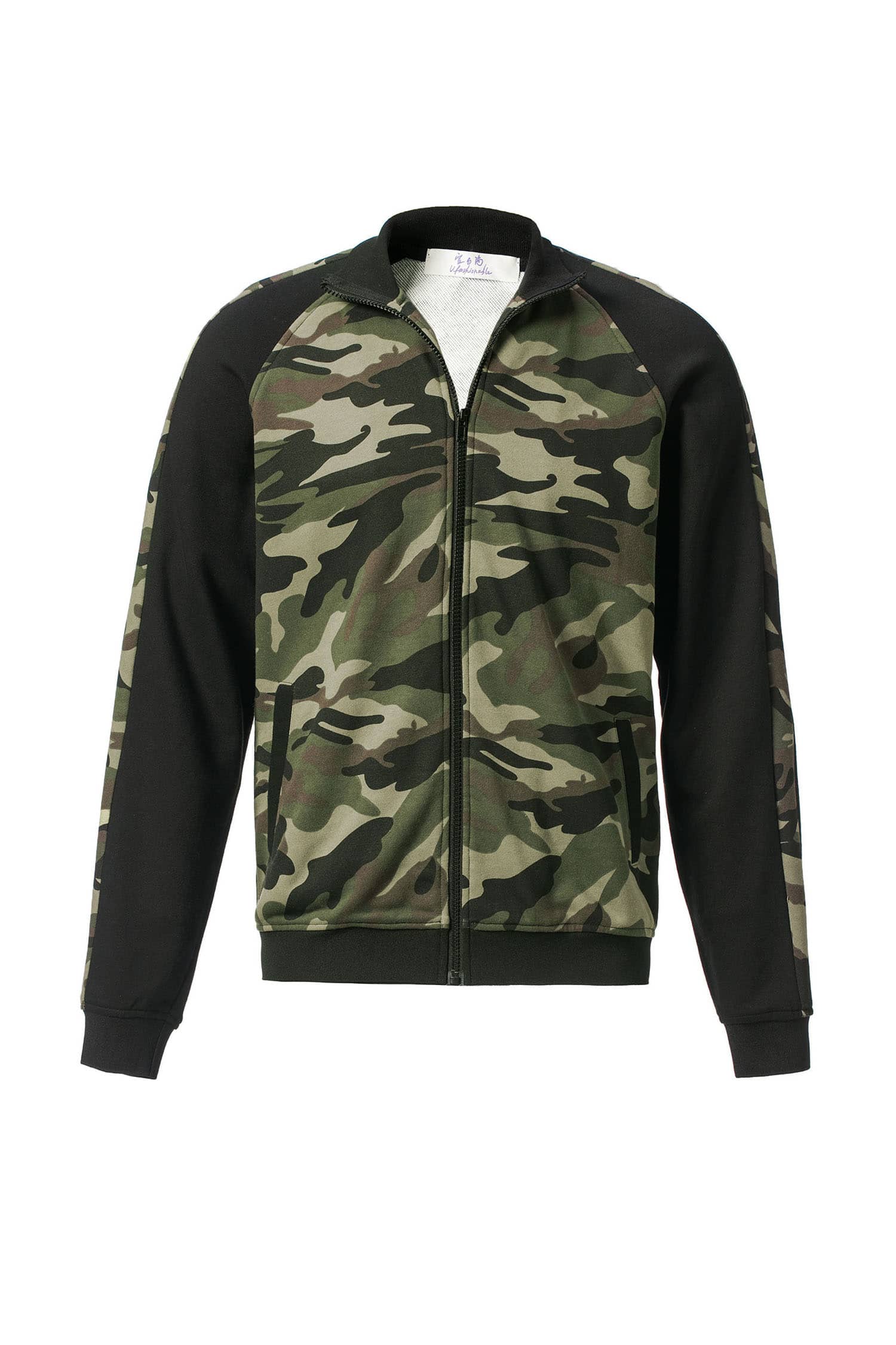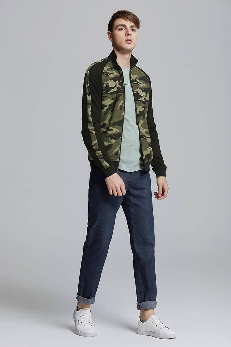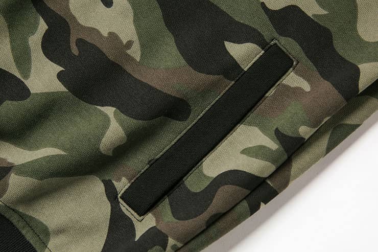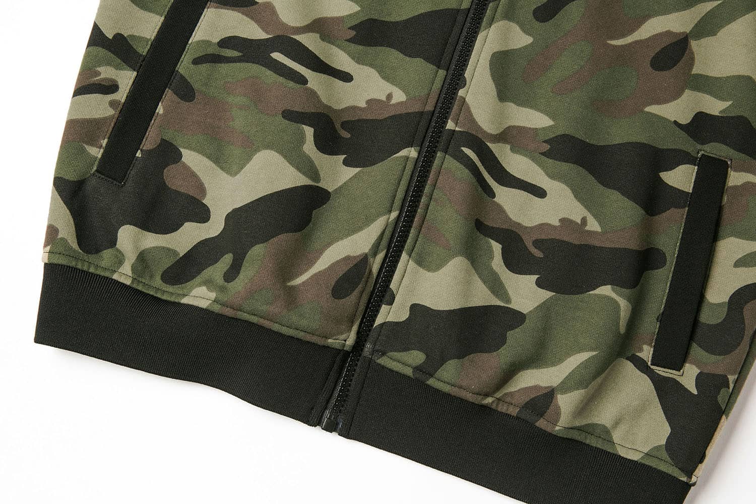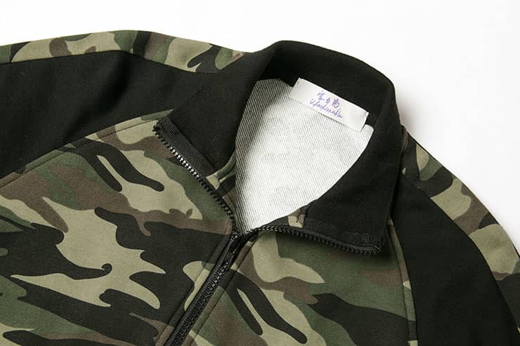 螺纹立领剪裁,门襟有品质拉链,落肩袖拼接设计,下摆和袖口罗纹束口,棉质迷彩印花卫衣面料,软硬适中,穿着舒适。