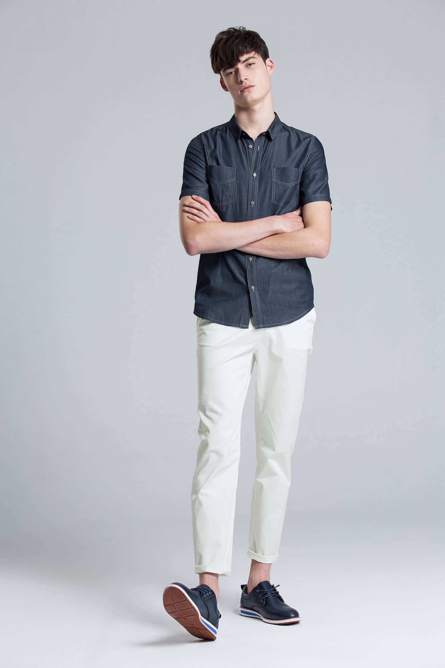 经典的翻领设计,门襟金属纽扣装饰,前幅贴袋几何车线点缀,突出视觉亮点;合体短袖剪裁,采用轻薄丹宁棉质牛仔,手感柔软,舒适透气。