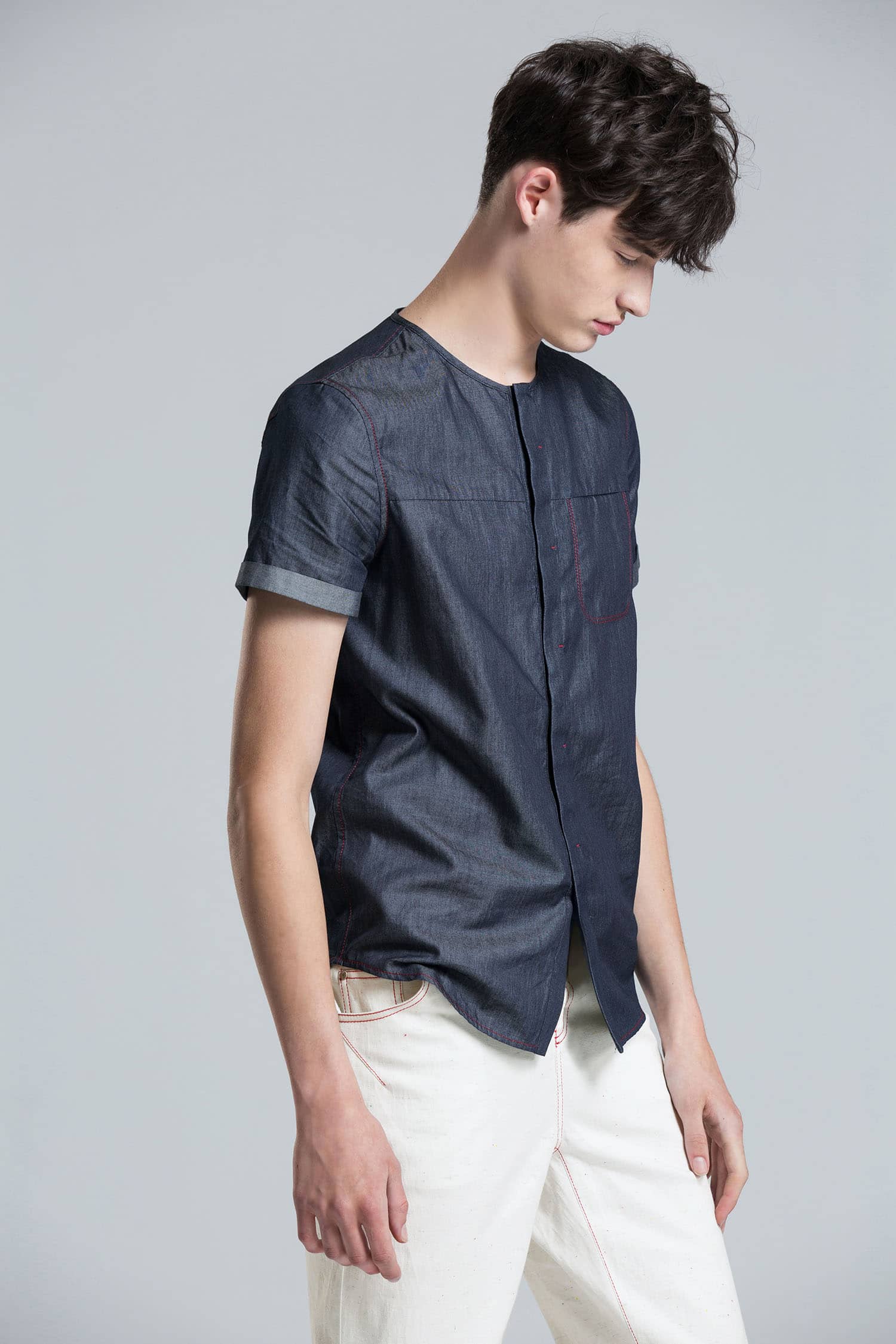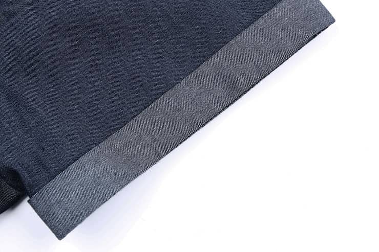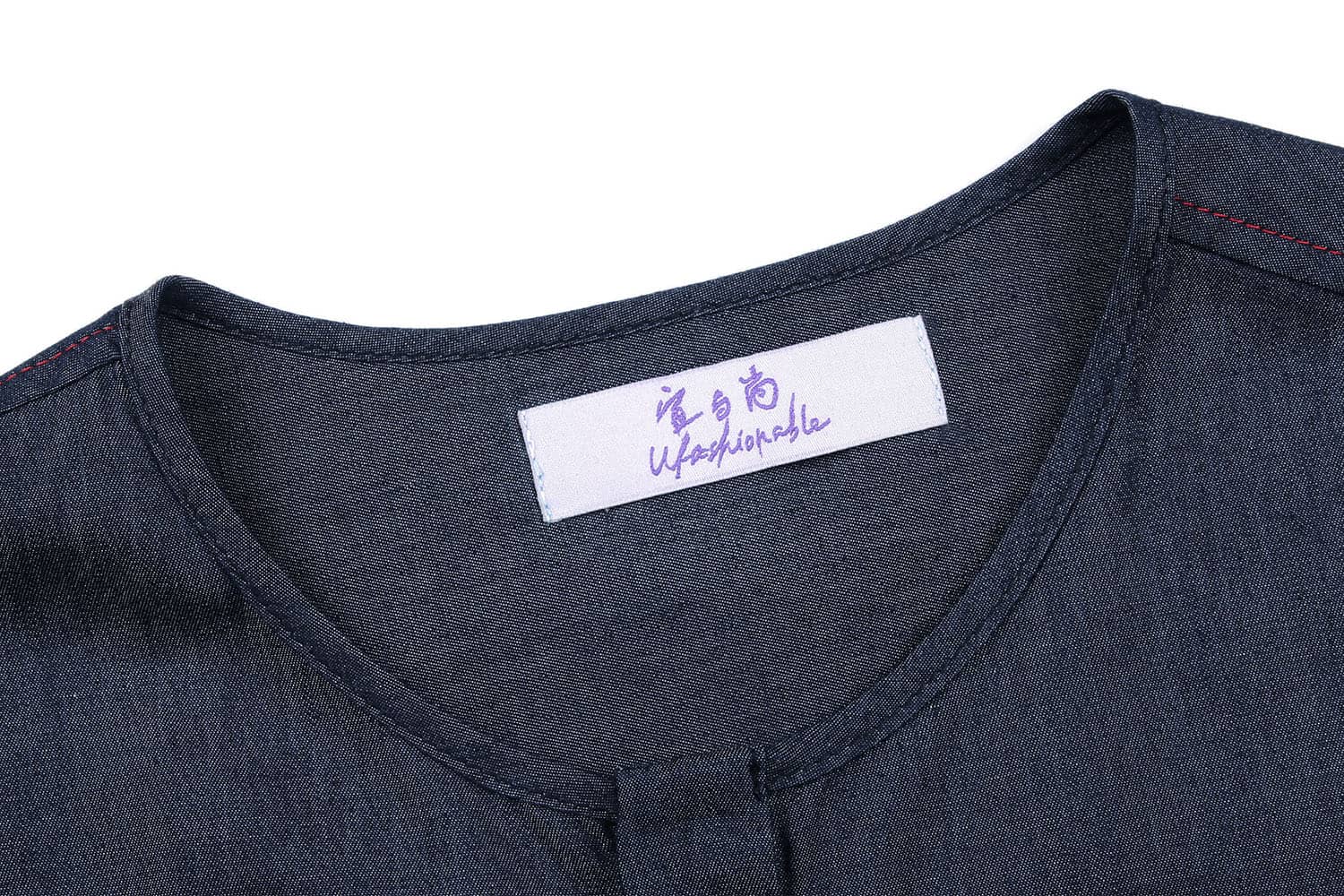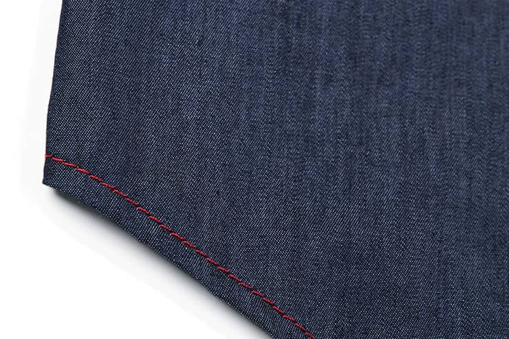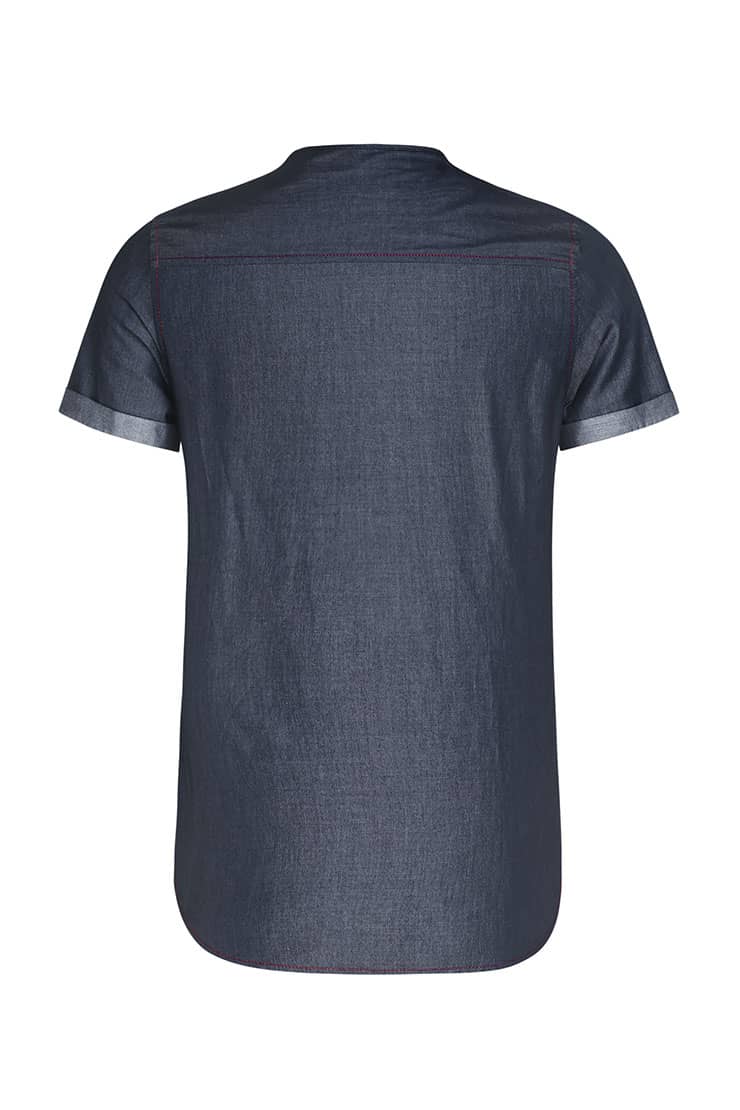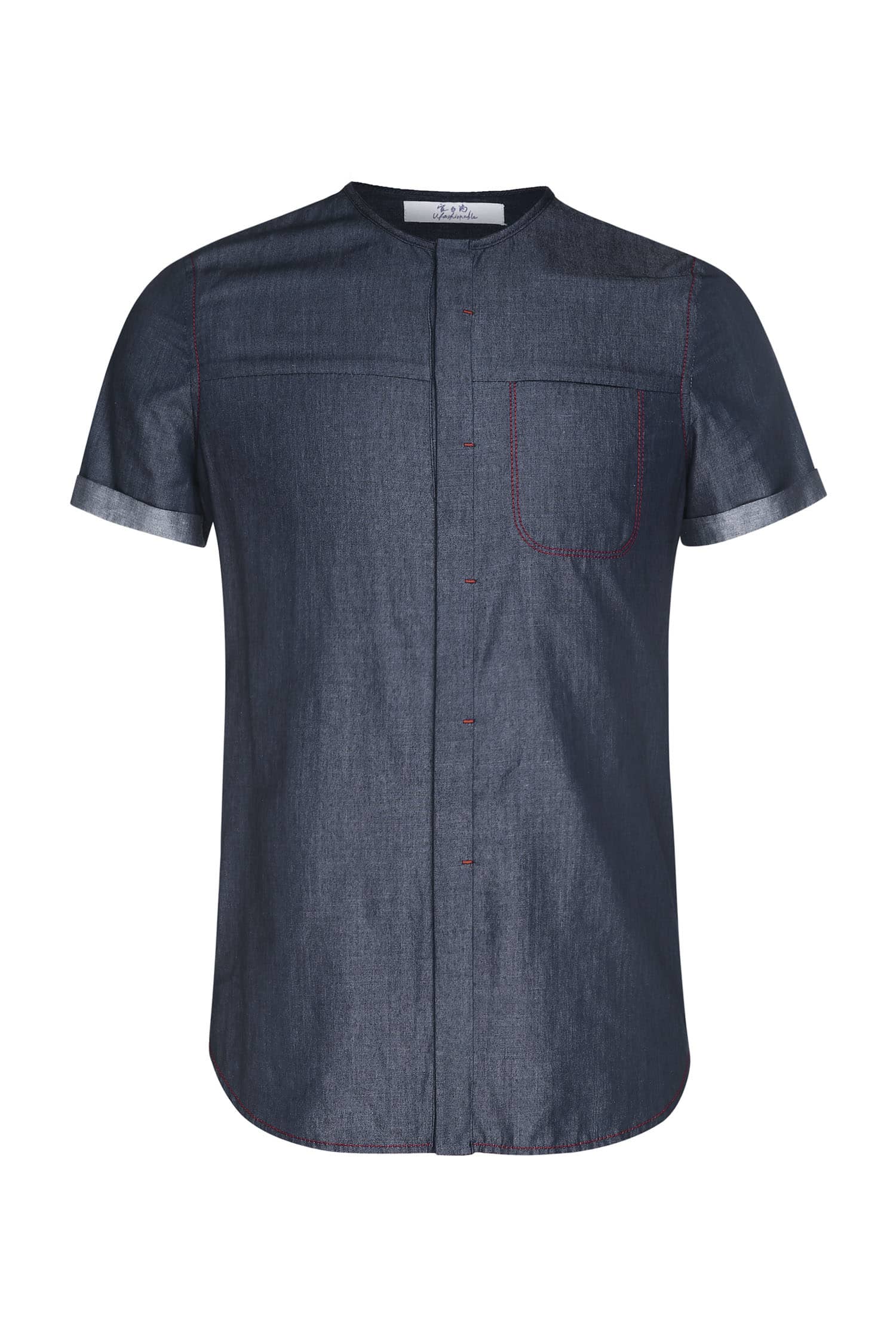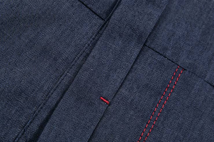 经典的圆领设计,无明线的门襟,外翻式做法,撞色线打枣固定,胸前独特的内开口袋,撞色明线车缝,采用上等轻薄丹宁牛仔,手感柔软,舒适透气。
