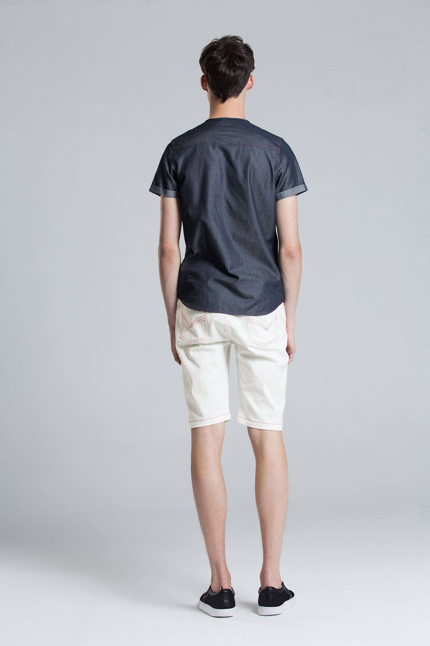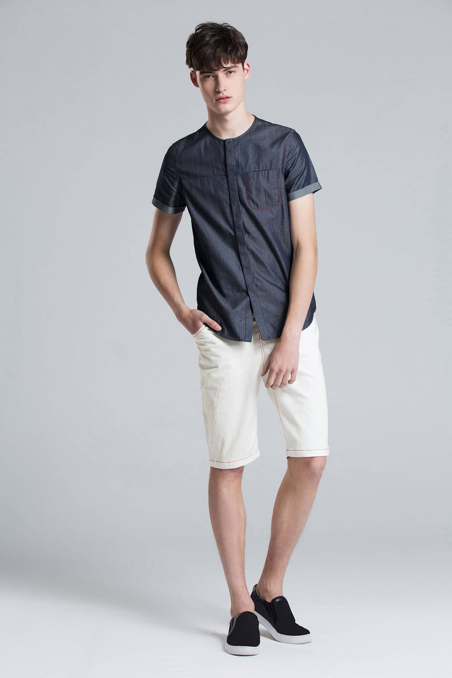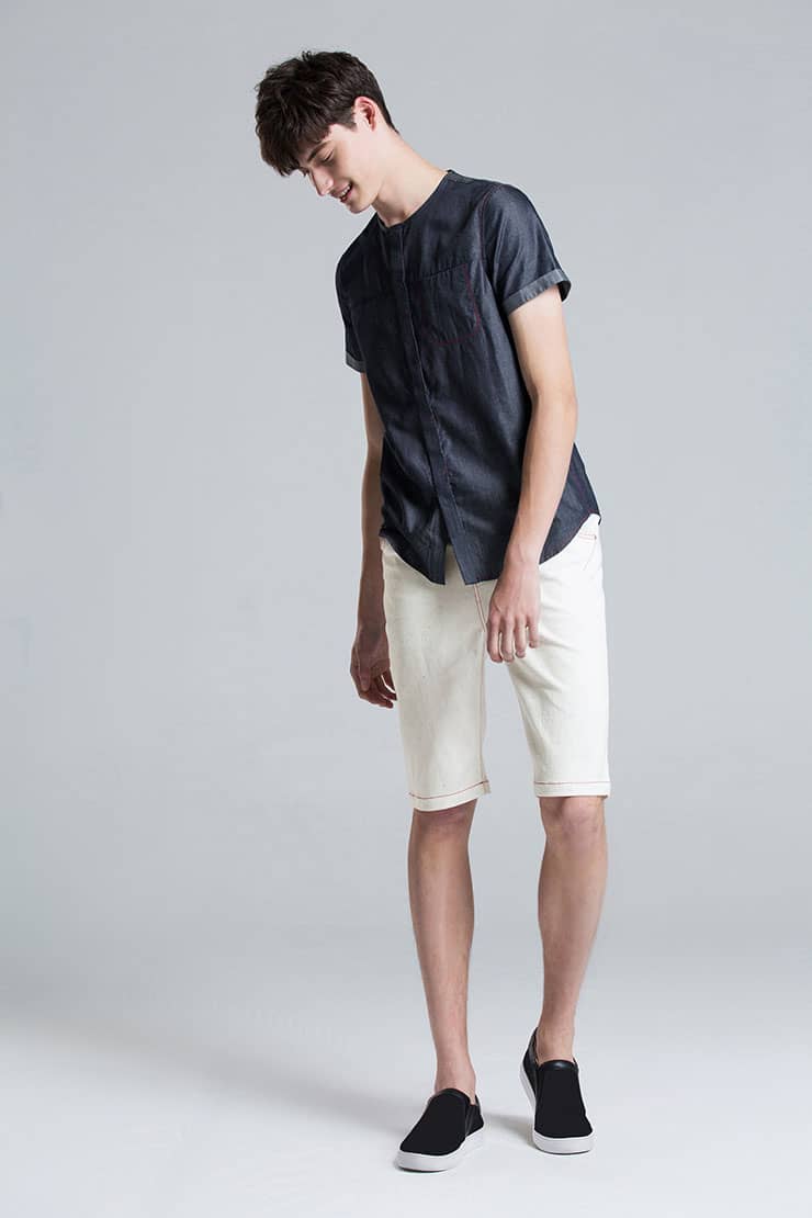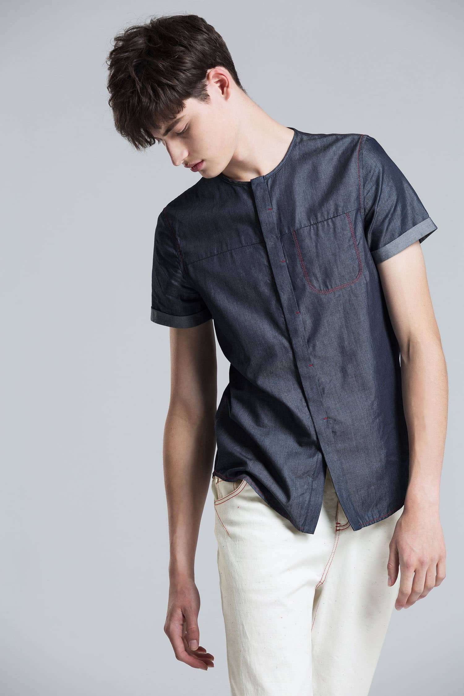 经典的圆领设计,无明线的门襟,外翻式做法,撞色线打枣固定,胸前独特的内开口袋,撞色明线车缝,采用上等轻薄丹宁牛仔,手感柔软,舒适透气。