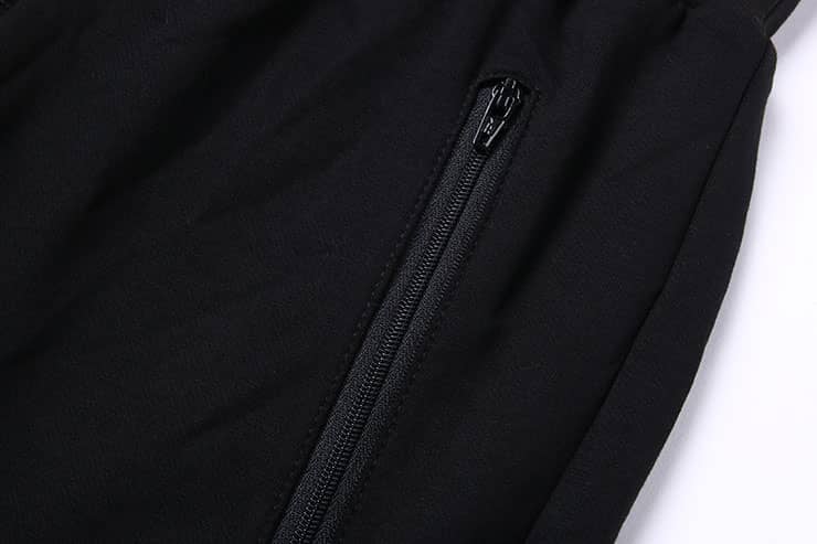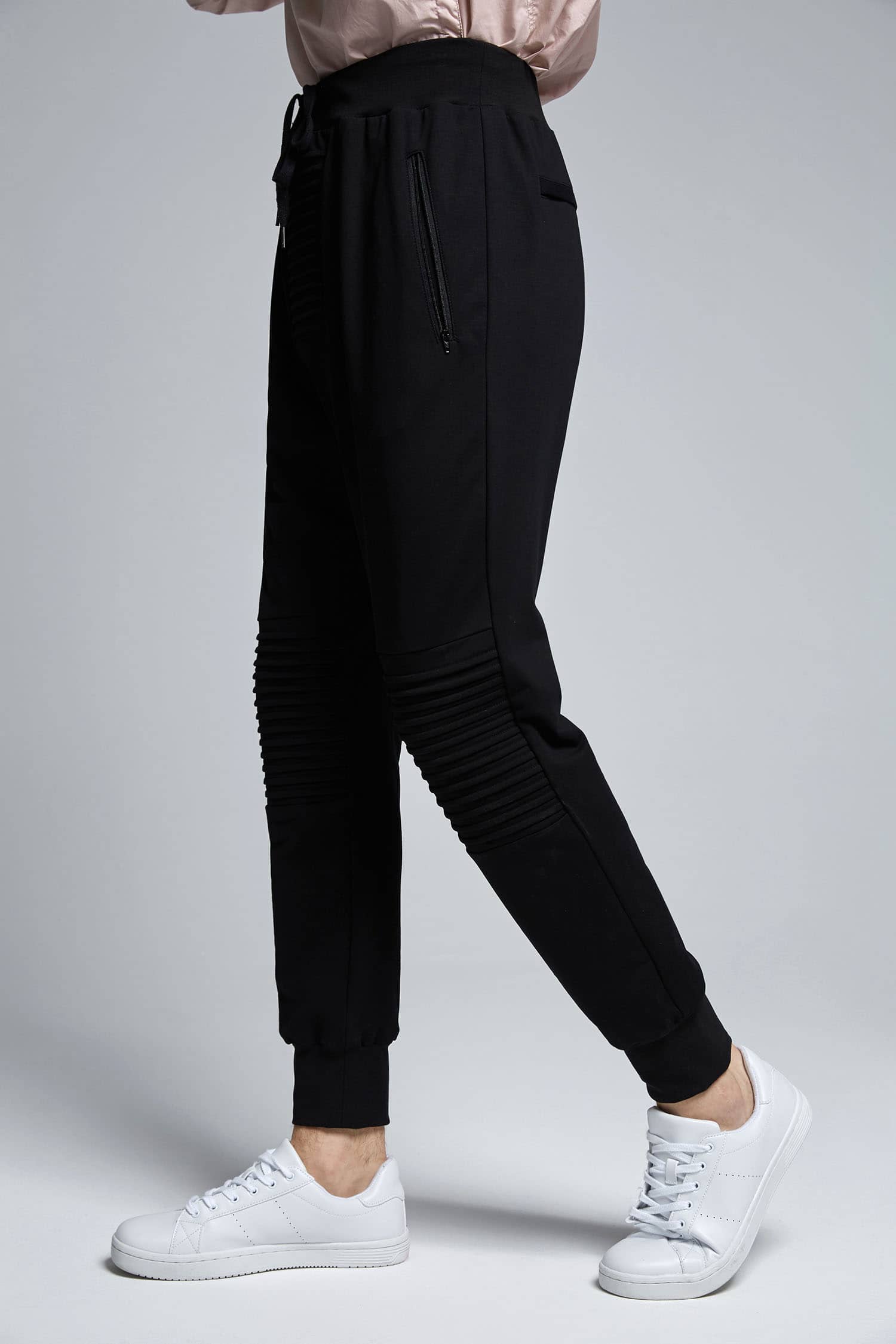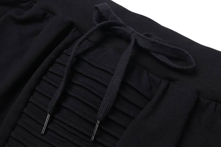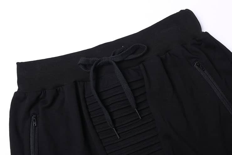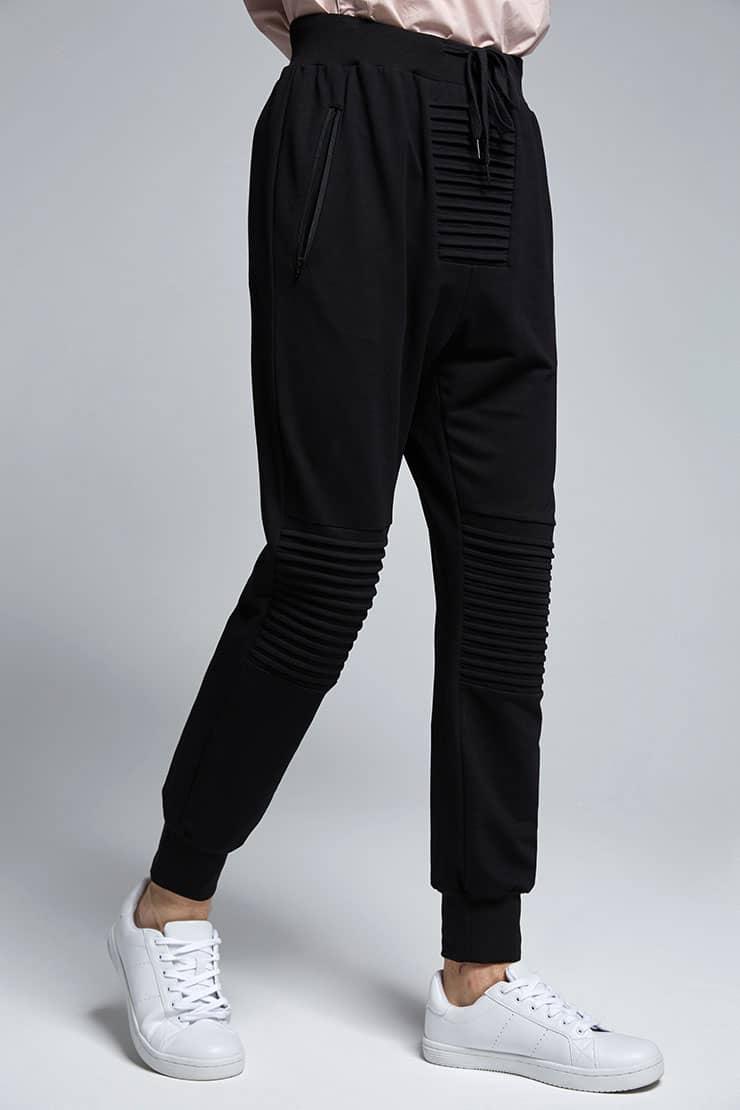 腰带松紧抽绳设计,侧边拉链口袋,裤身前中及膝盖位打条设计,后幅对称单唇袋,落裆束脚,贴合脚踝,宽松萝卜裤型,穿着轻松休闲。
