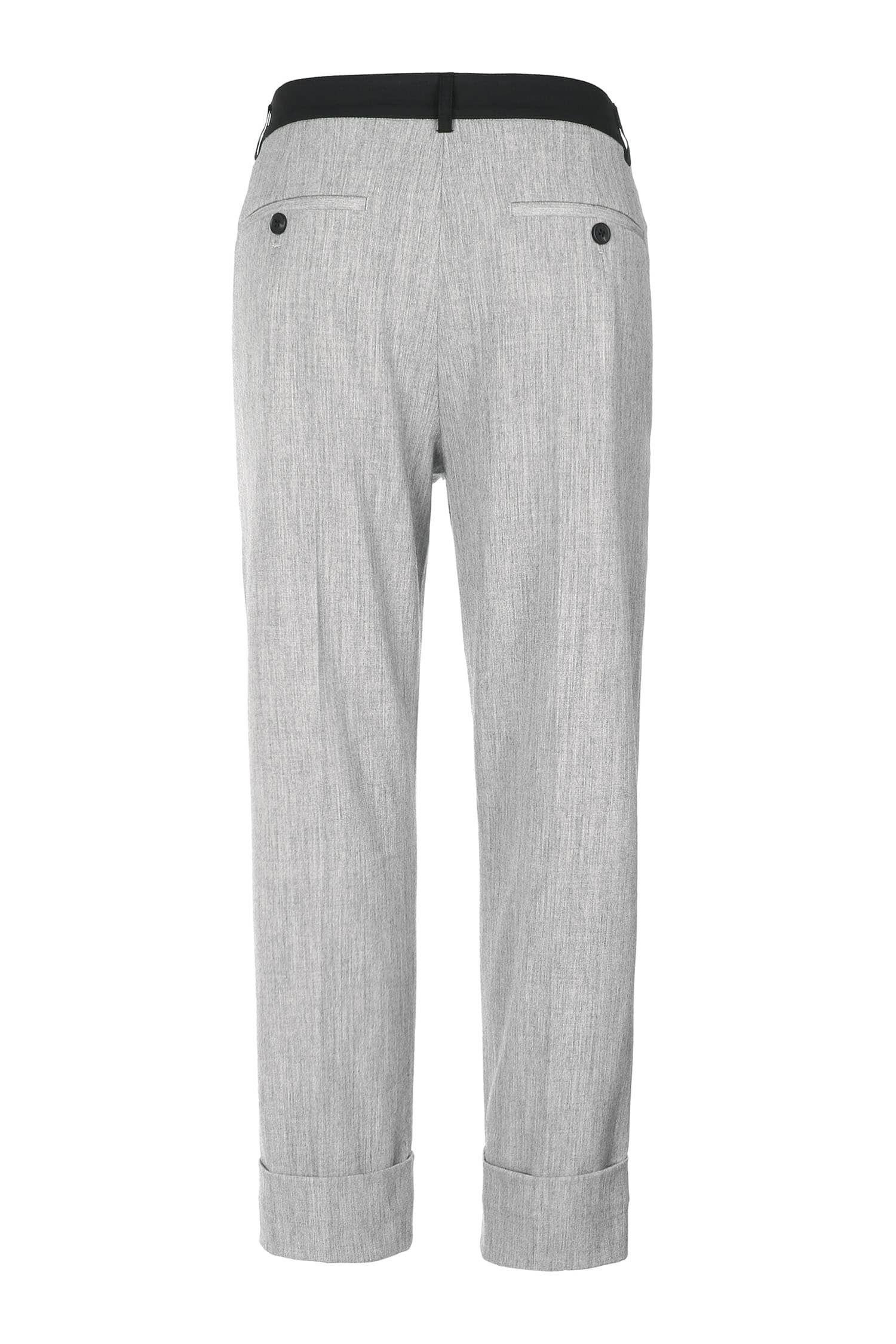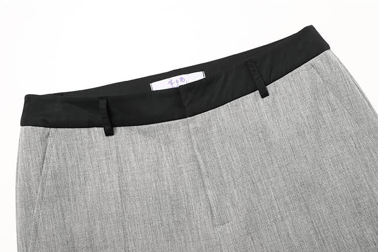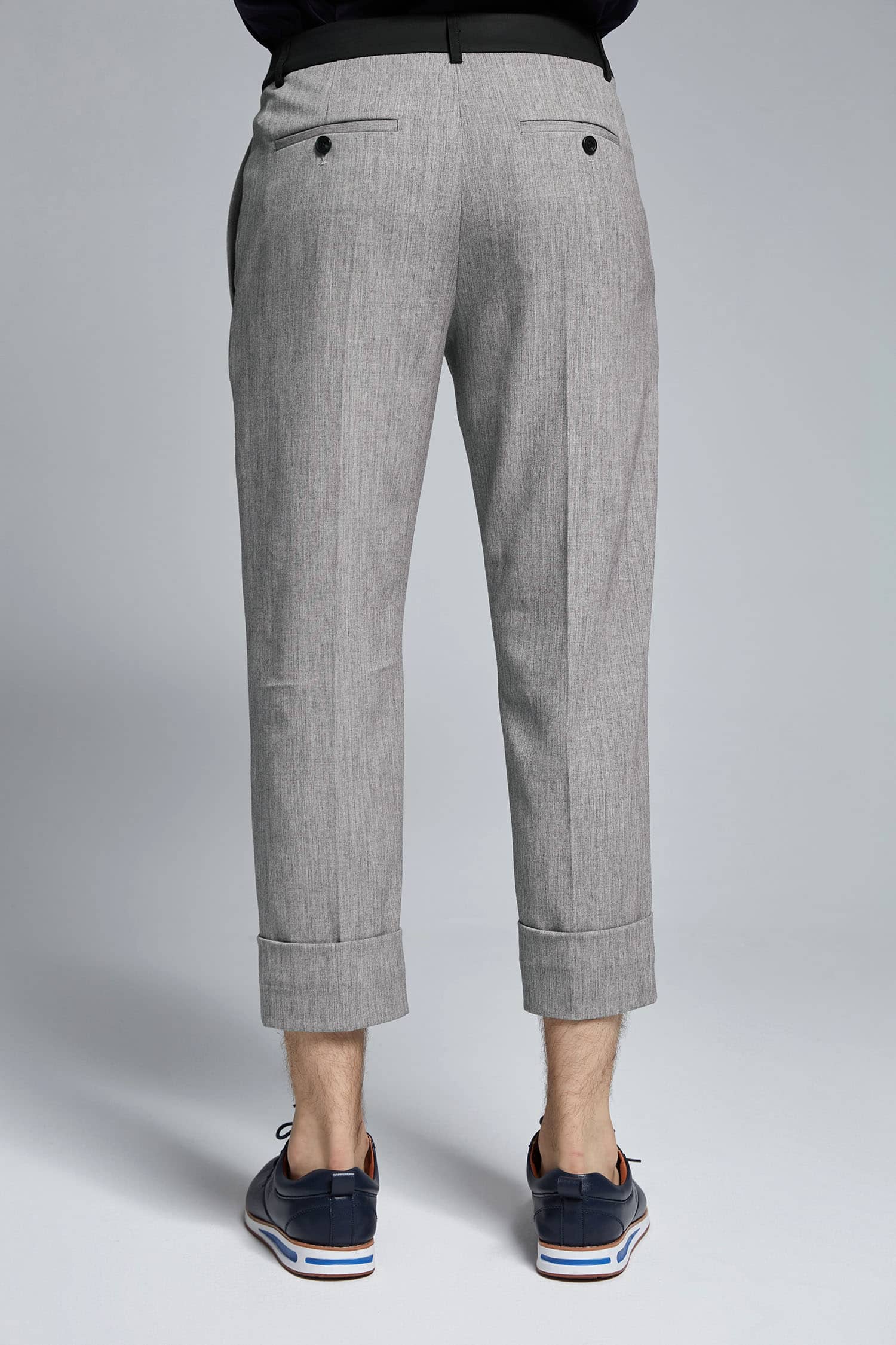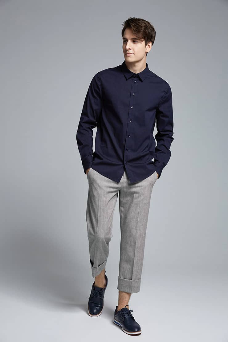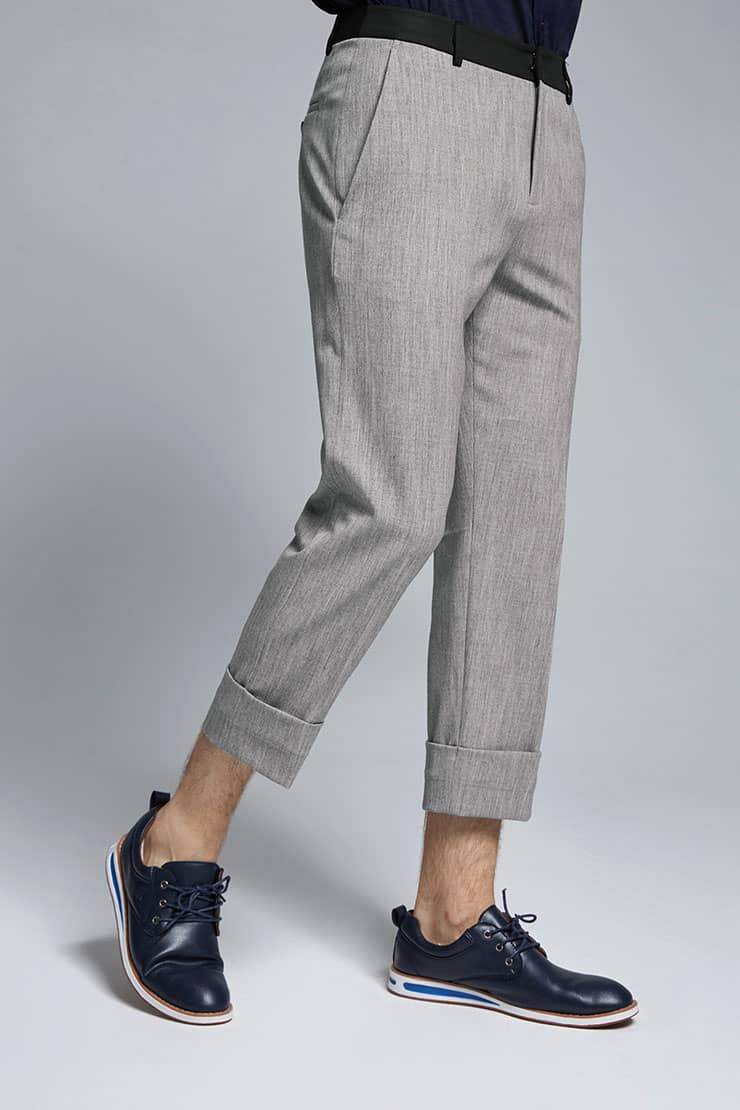 棉质混纺面料,撞色腰头,腰部服帖,两侧斜插袋,袋口上下打枣,后幅单唇袋加纽扣固定,卷裤脚裤剪裁,烫挺缝线,挺阔有型。
